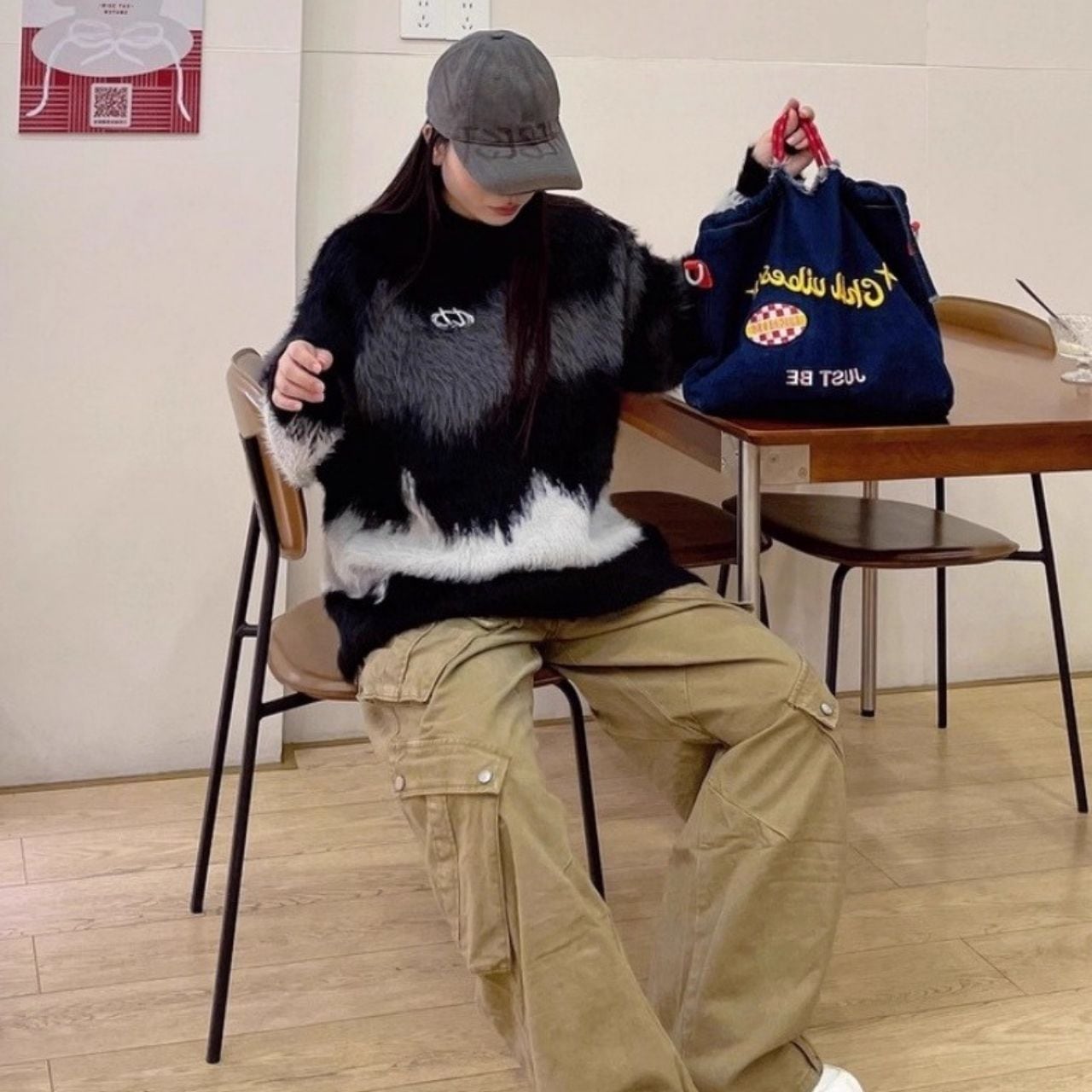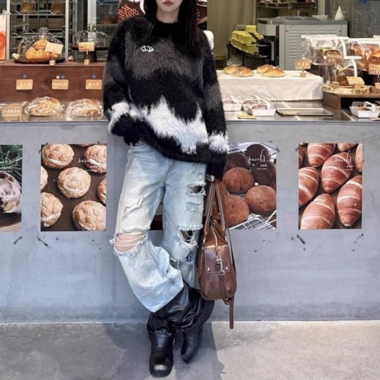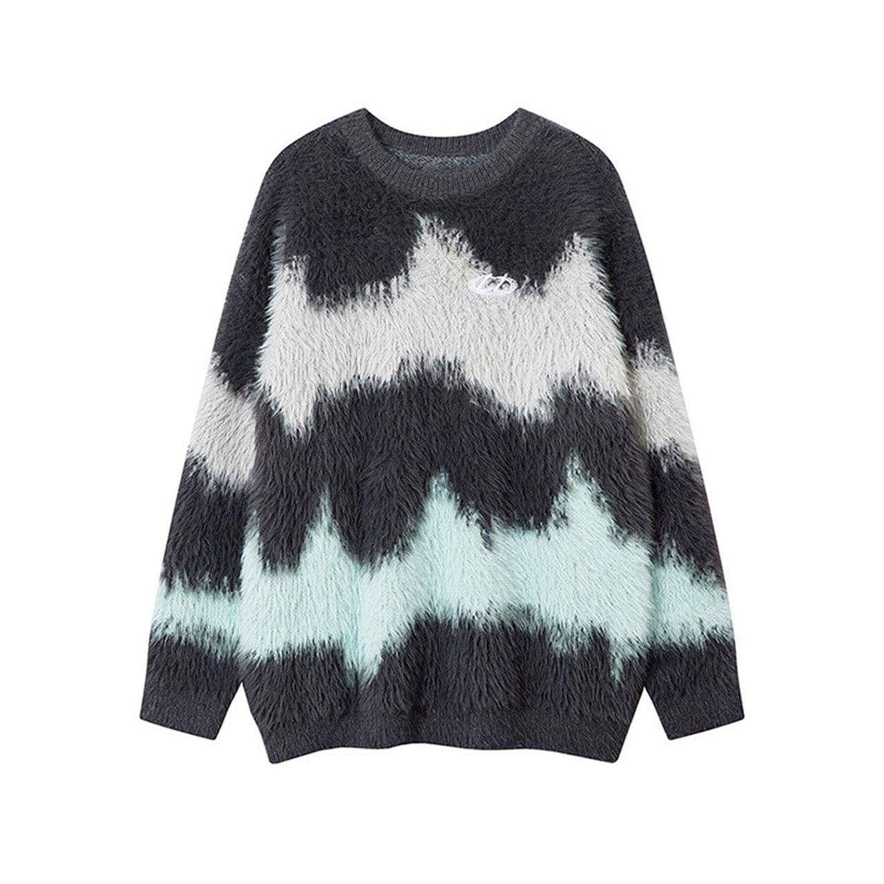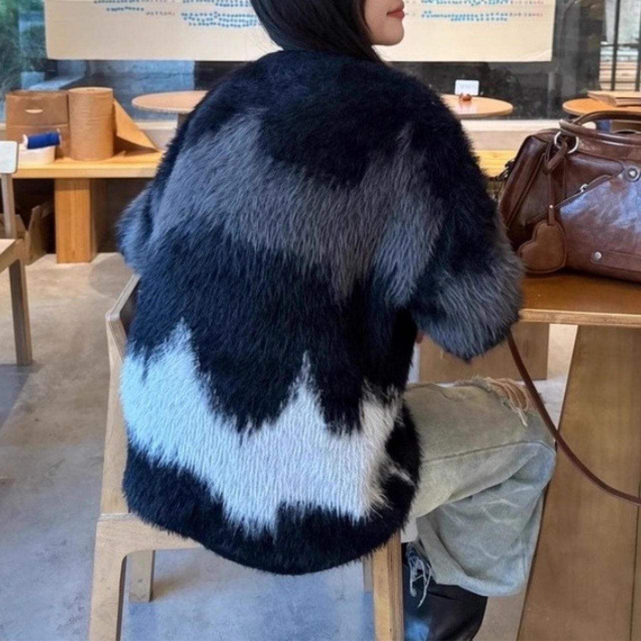 モコっとした質感に大胆なパターンをのせたアート系ニット。