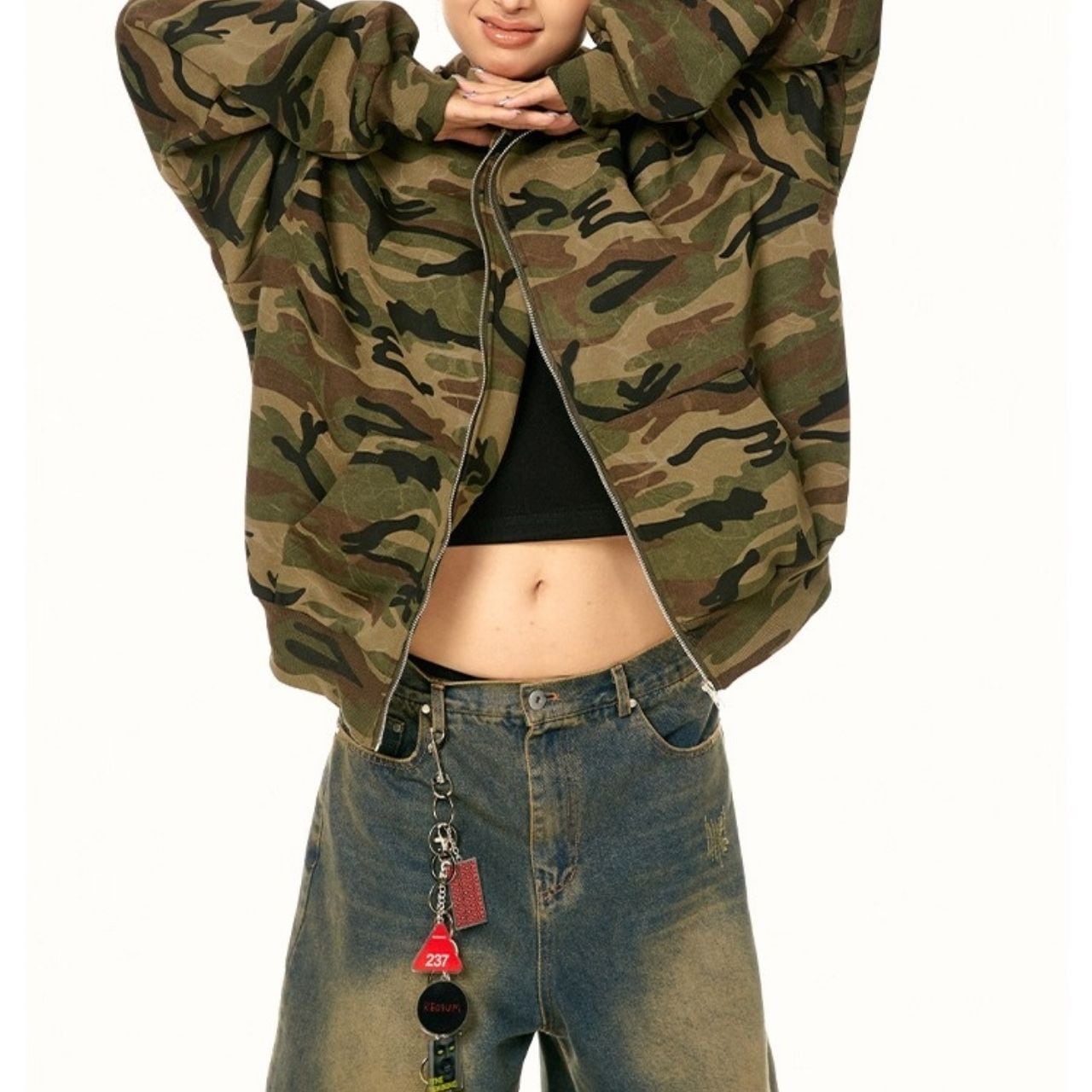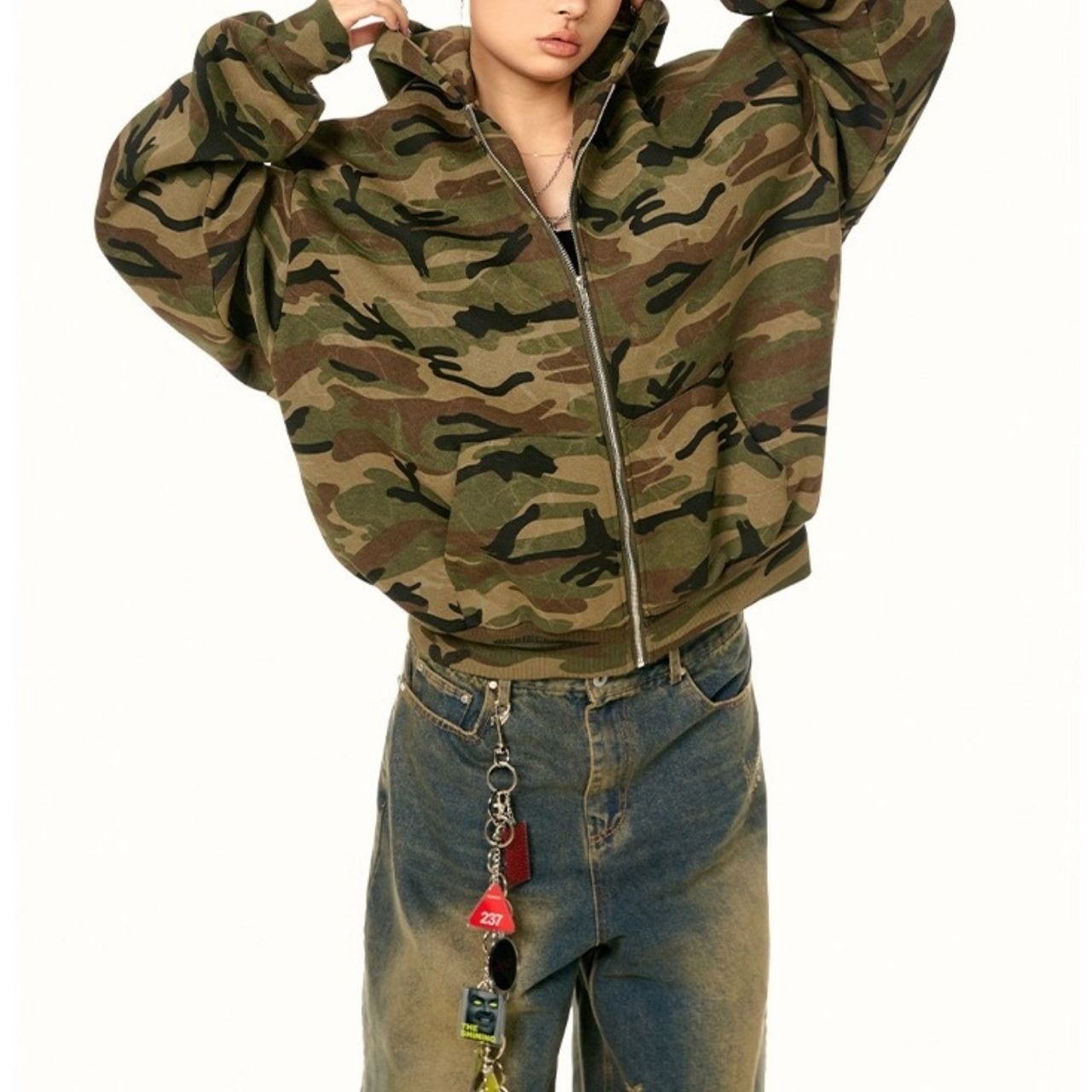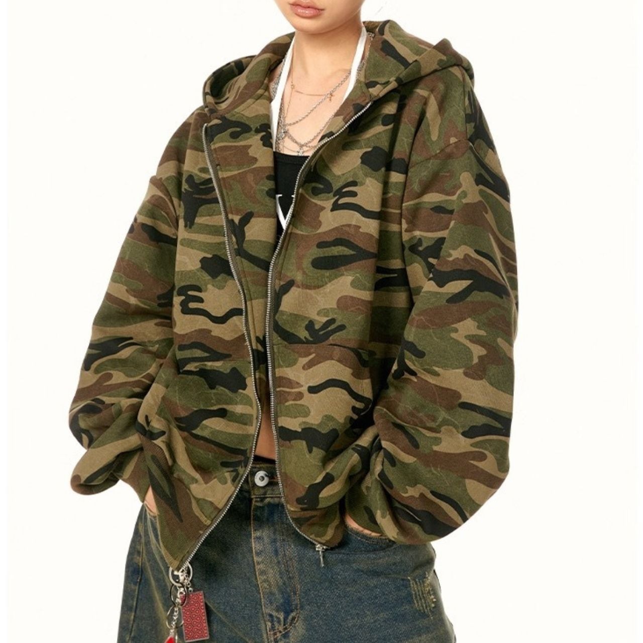 存在感のあるカモフラ柄でストリート感をしっかり出せるフーディ。