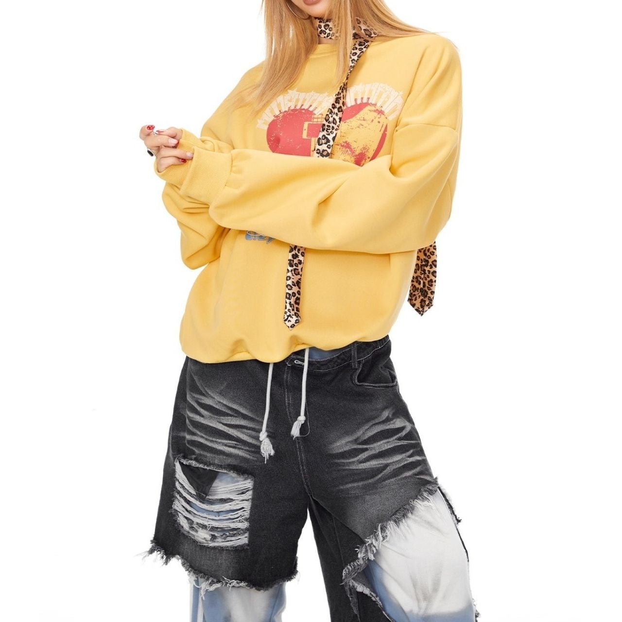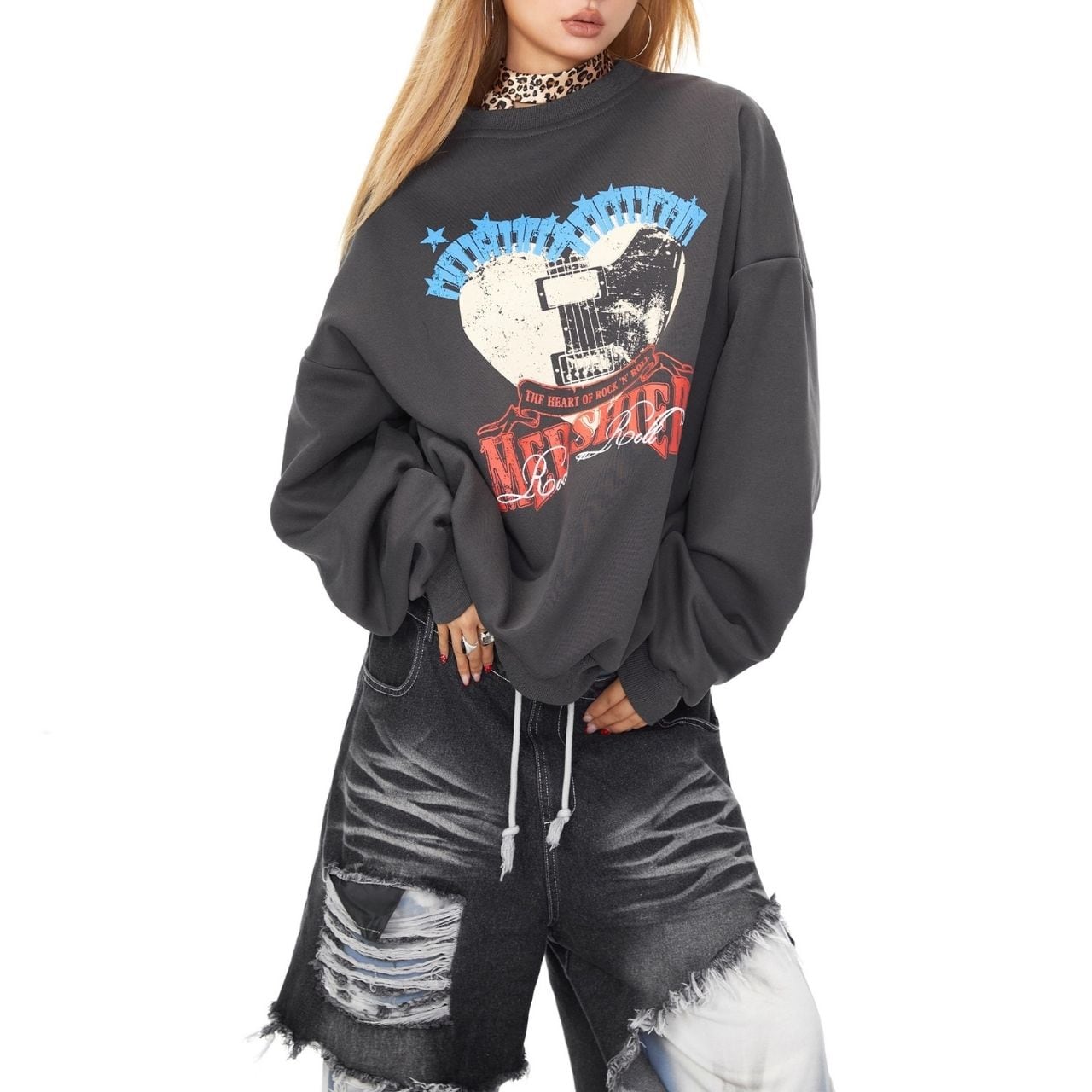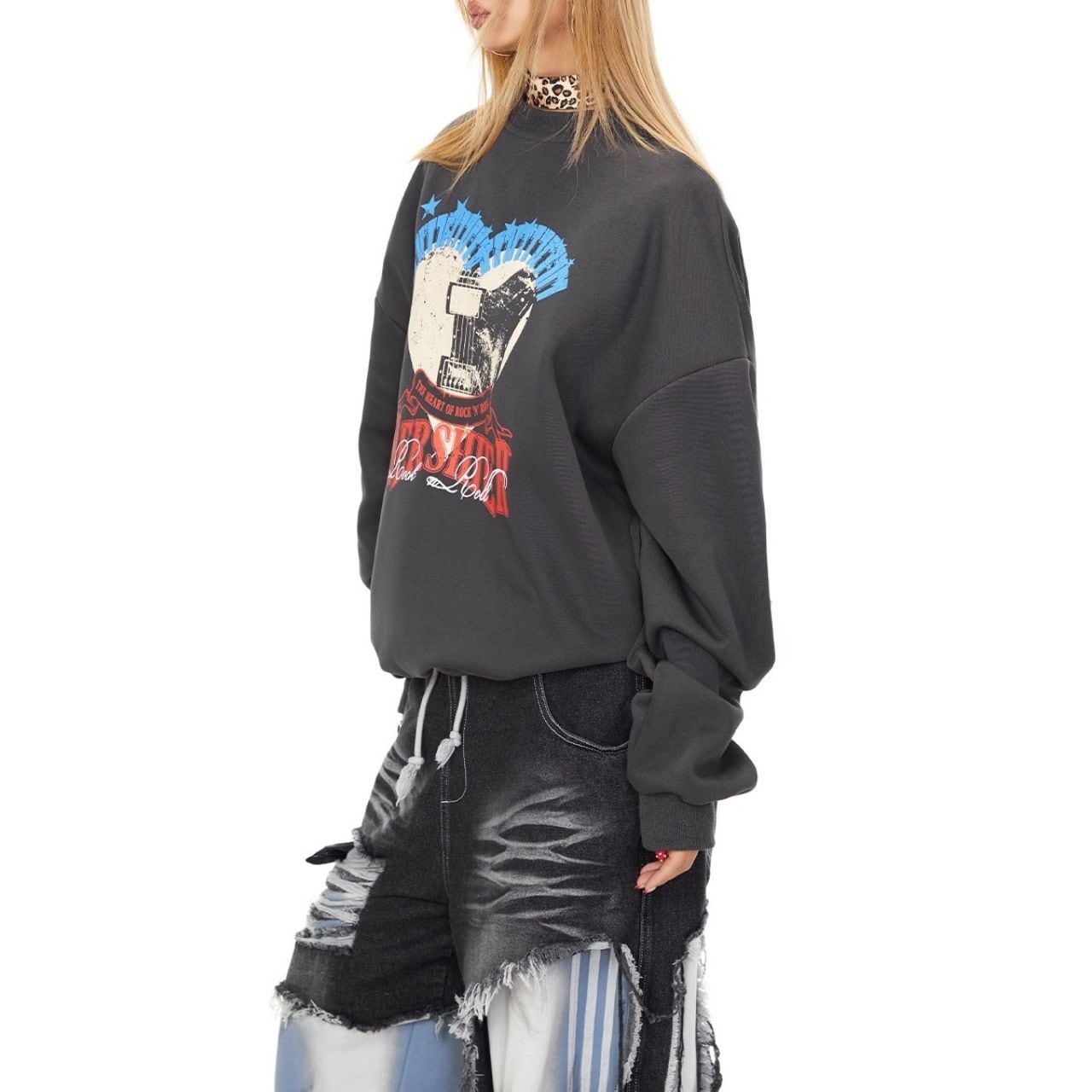 大胆なハートプリントが主役のストリートスウェット。