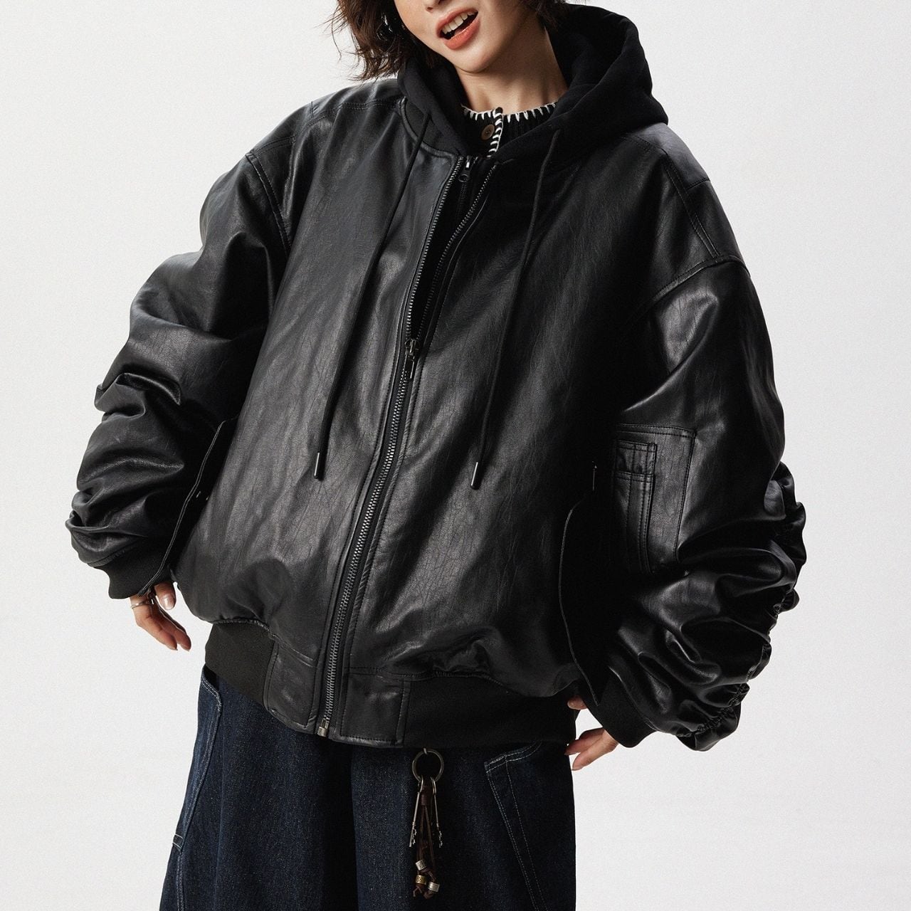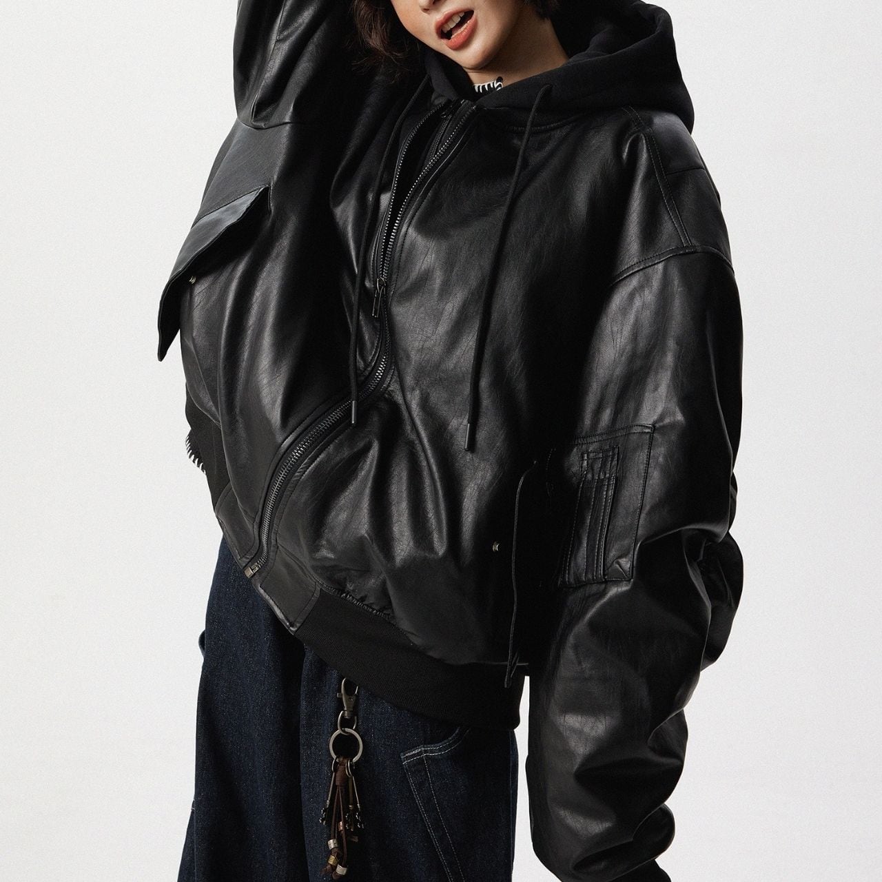 レトロモードバウンシーフェイクレザーブルゾン R01268