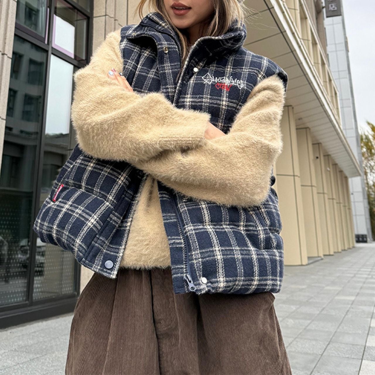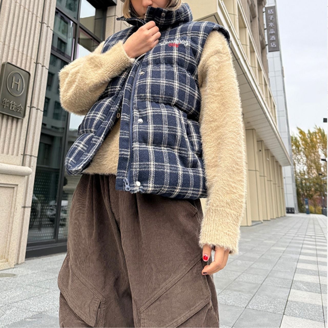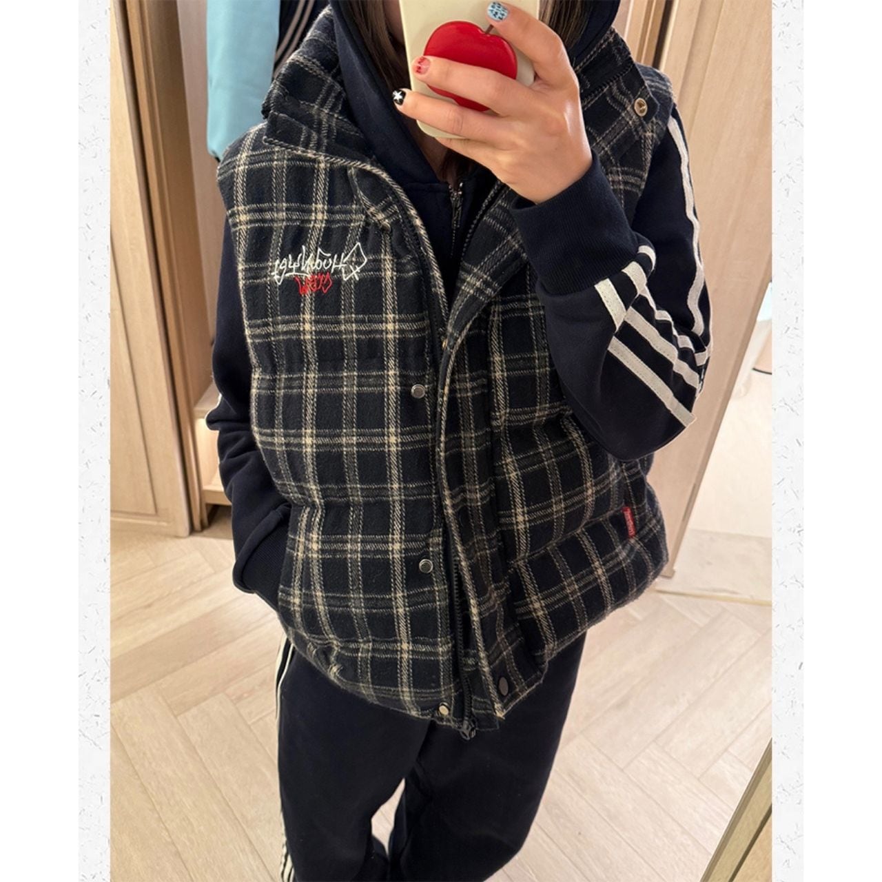 丸みのあるボリューム感が可愛いチェック柄の中綿ベスト。