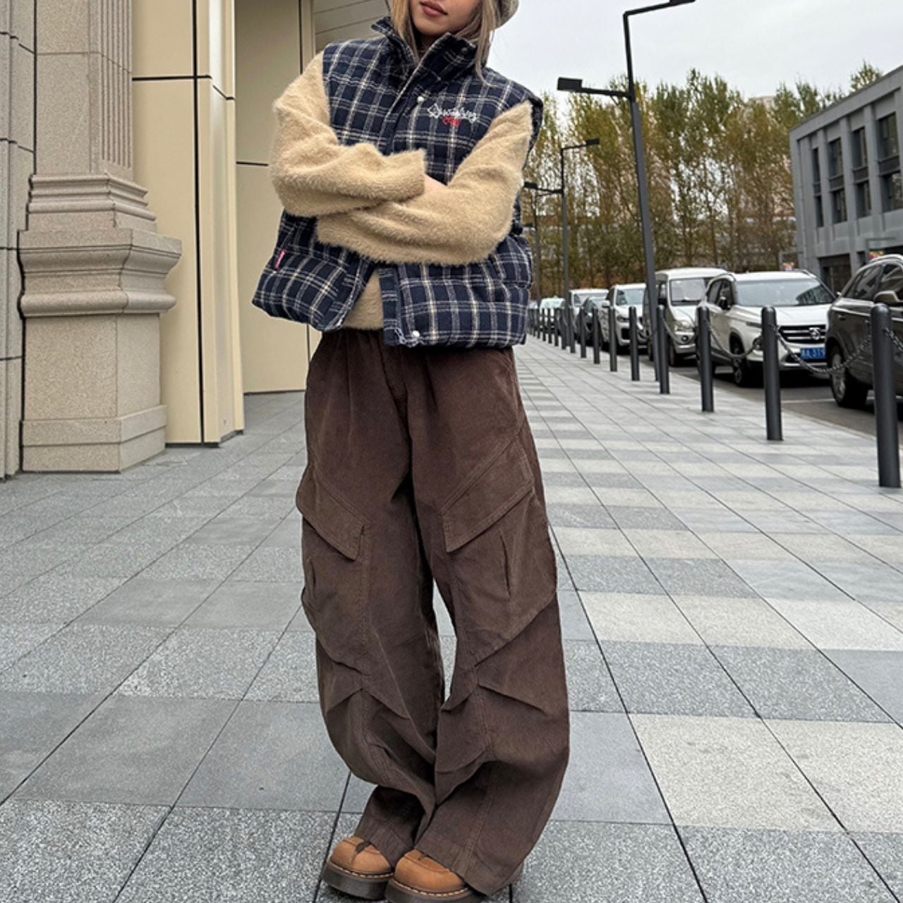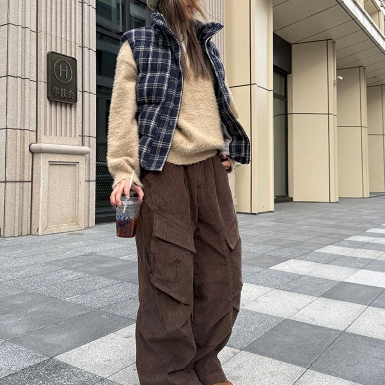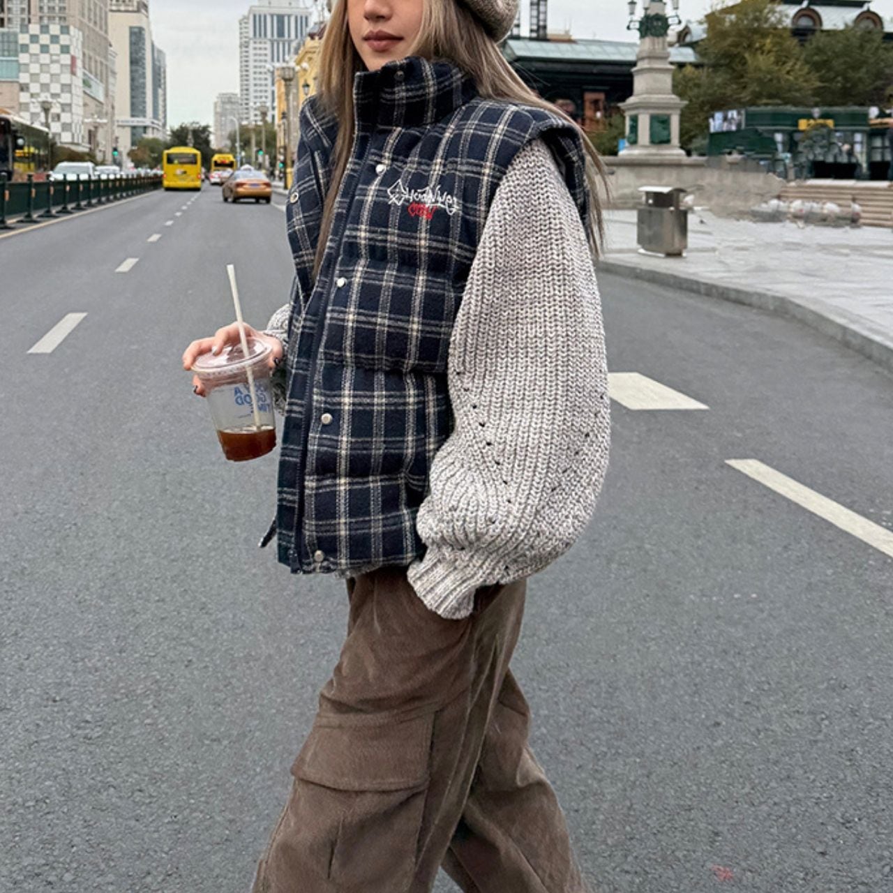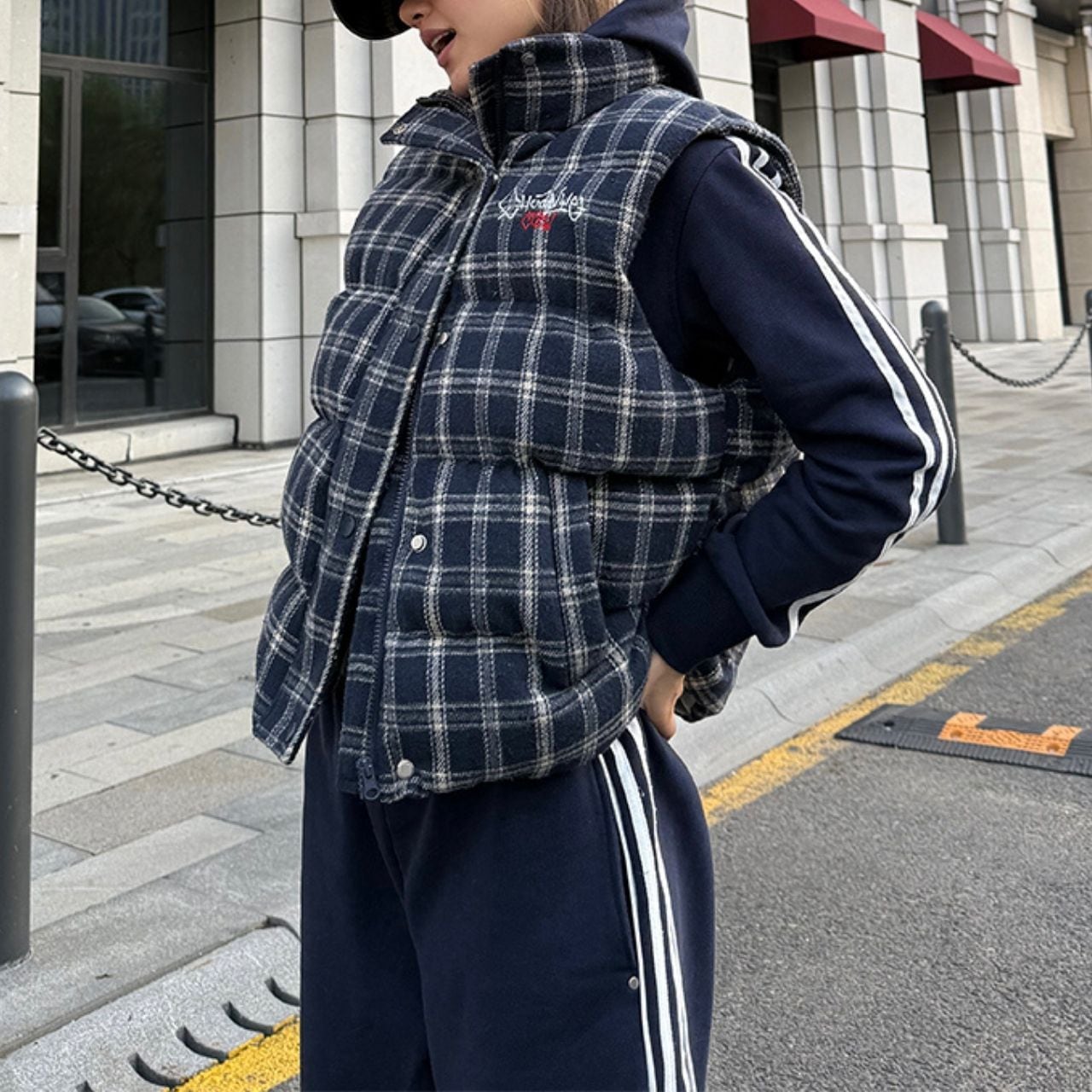 丸みのあるボリューム感が可愛いチェック柄の中綿ベスト。