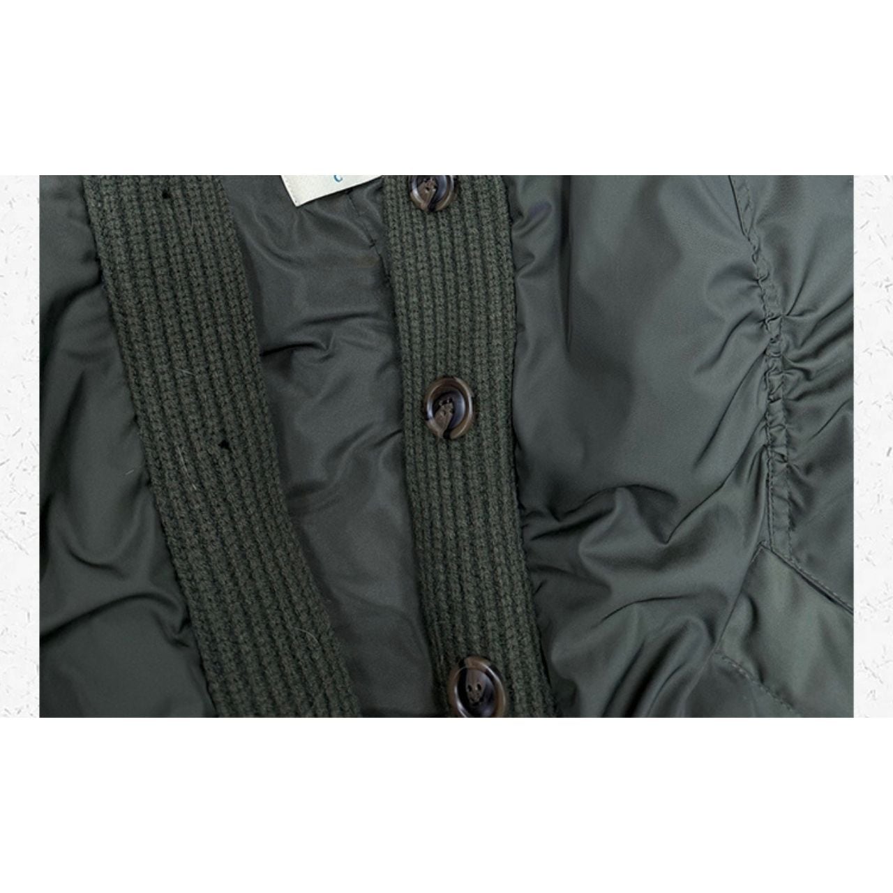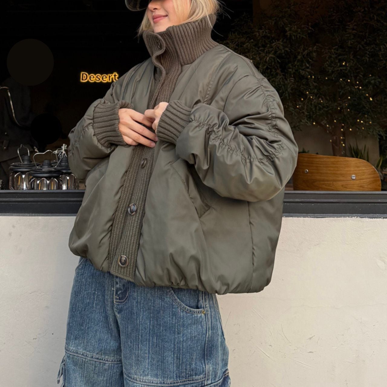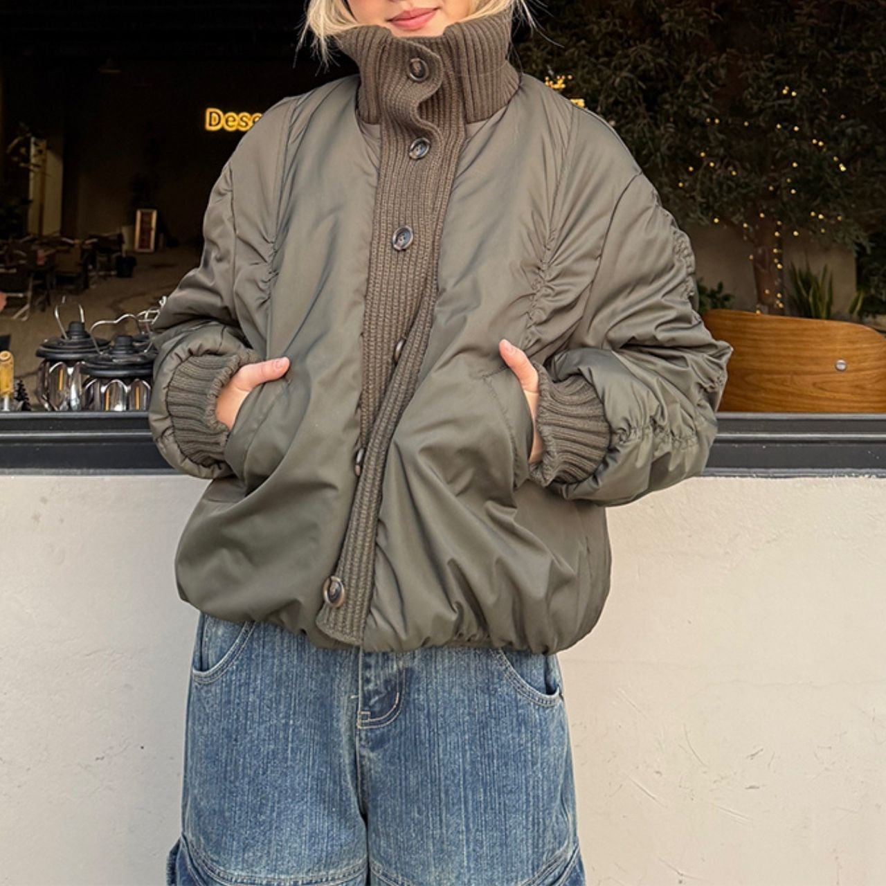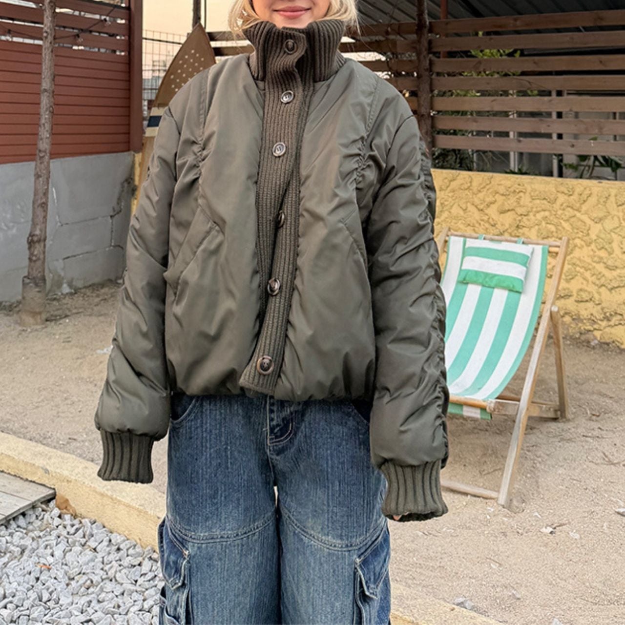 ハイネックニット×中綿アウターのドッキングデザインが魅力のジャケット。