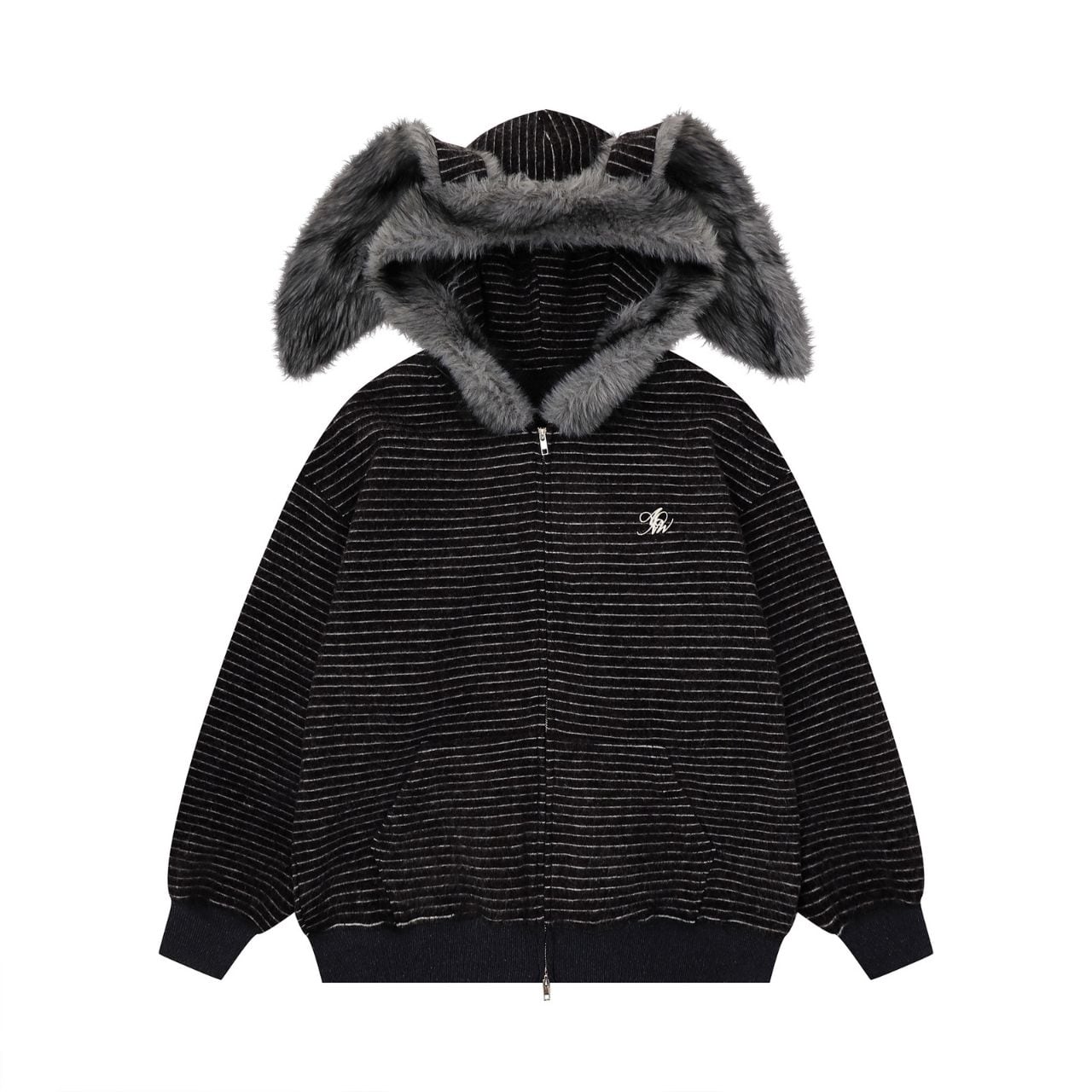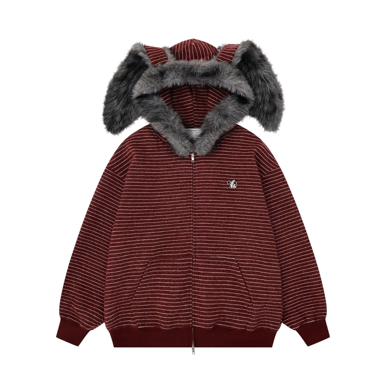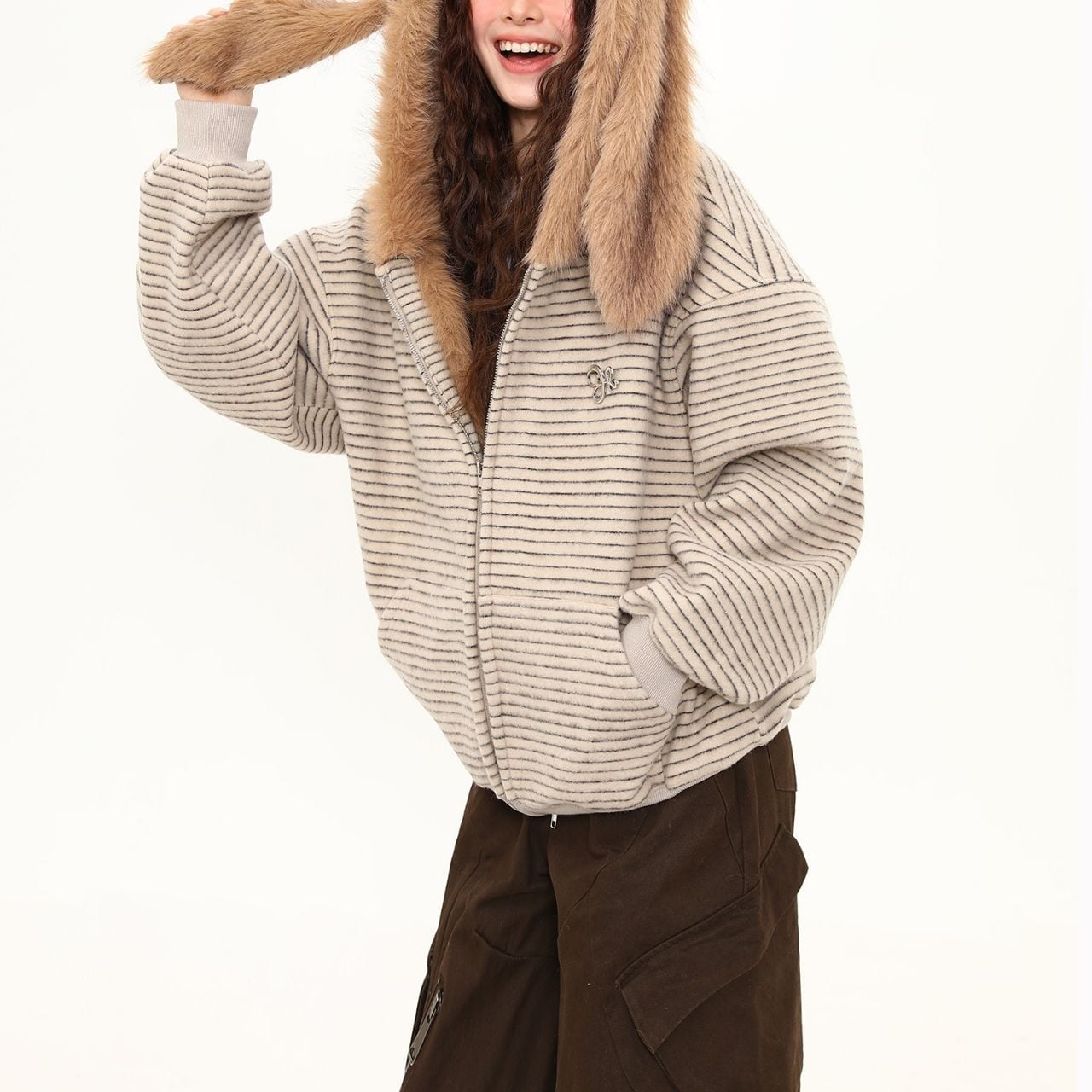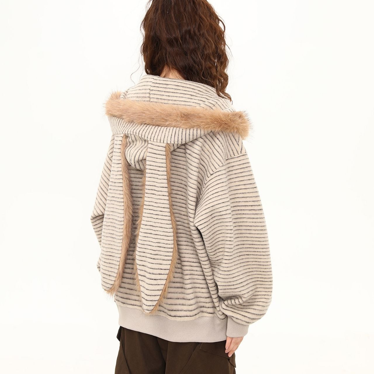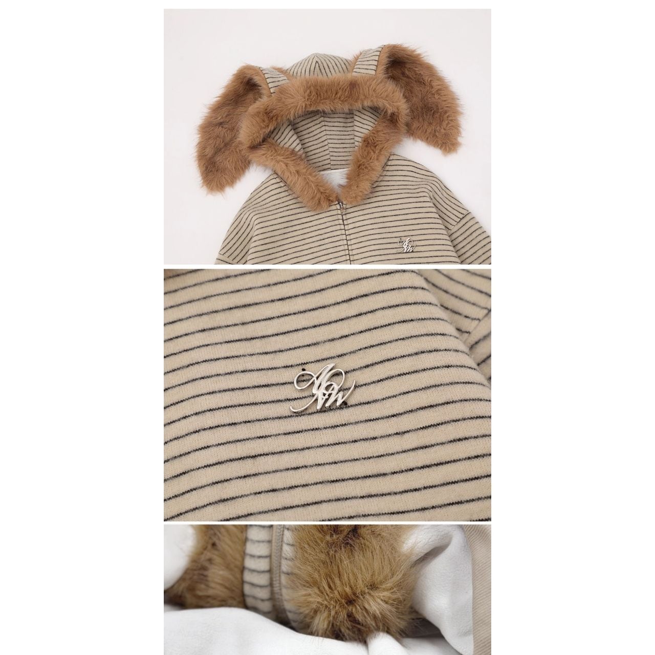 うさ耳フードがワンポイントのポップなボーダージップパーカー。