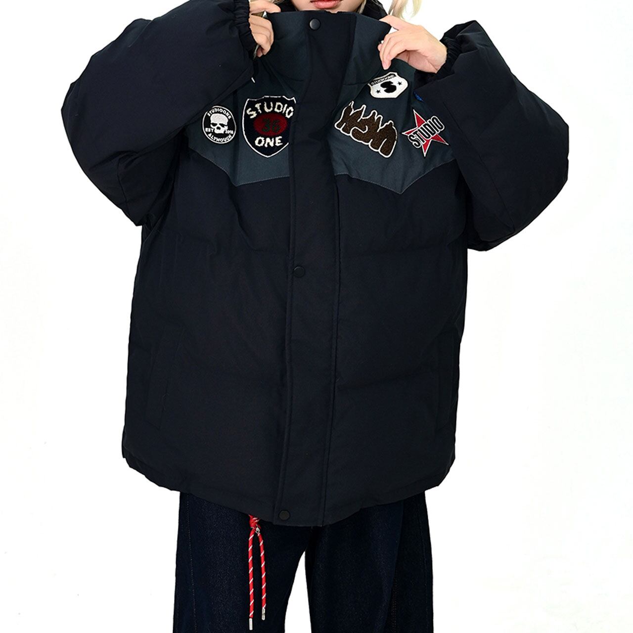 インパクトのあるワッペンが散りばめられた、遊び心たっぷりのデザインブルゾン。