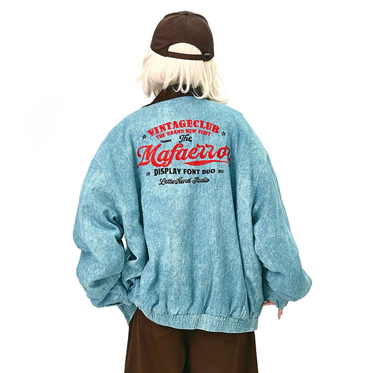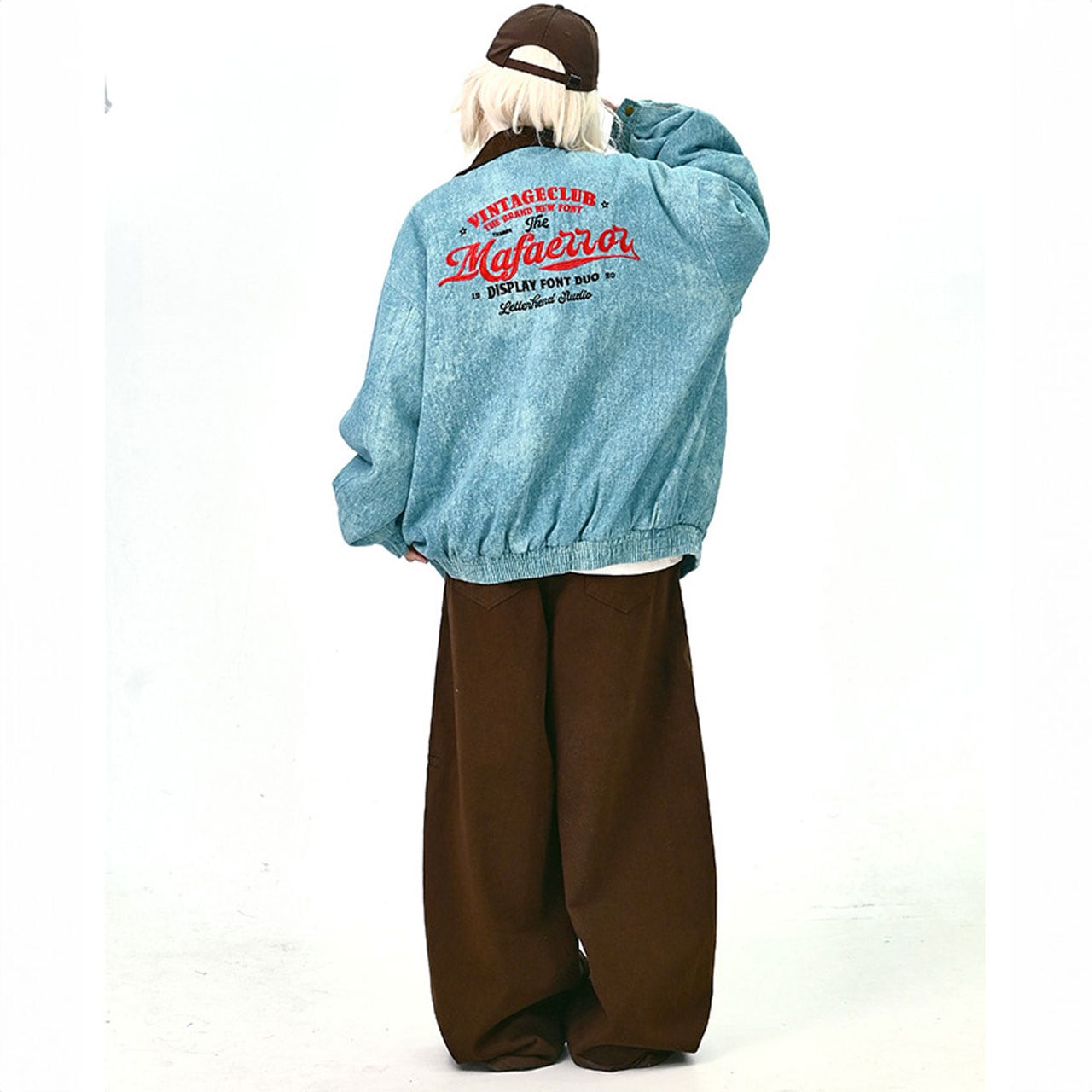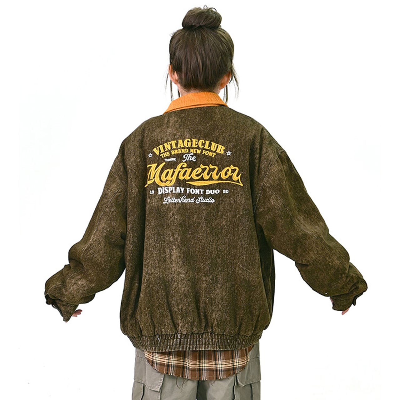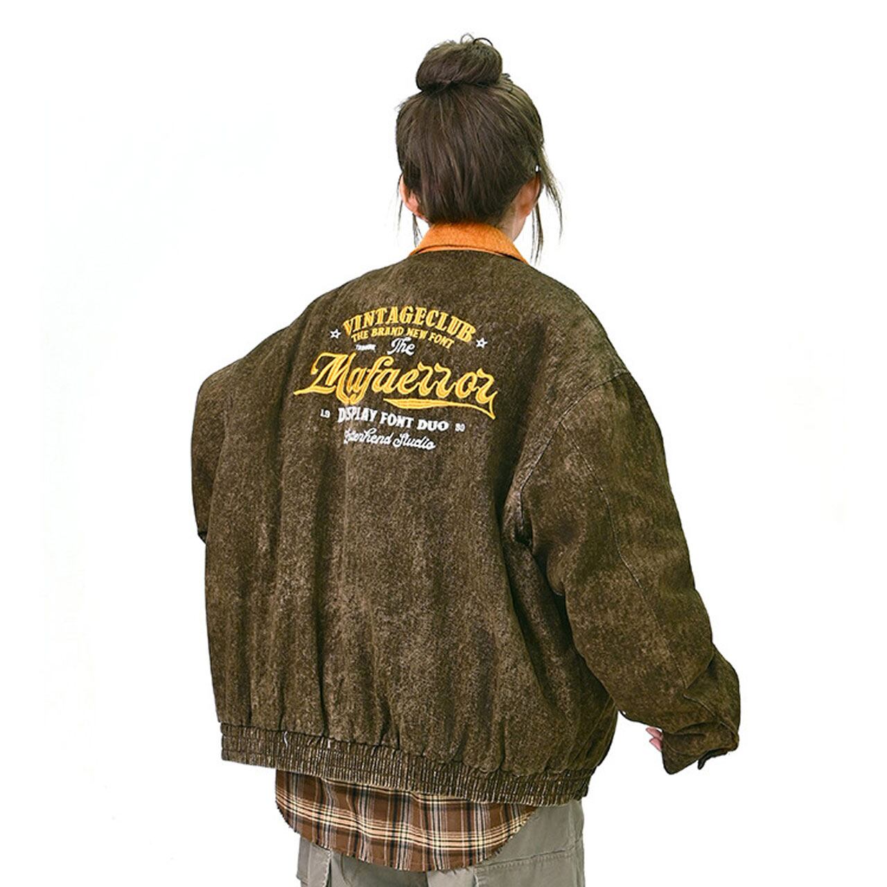 背中のレタリング刺繍が目を引く、ヴィンテージ感あふれるデザインブルゾン。
