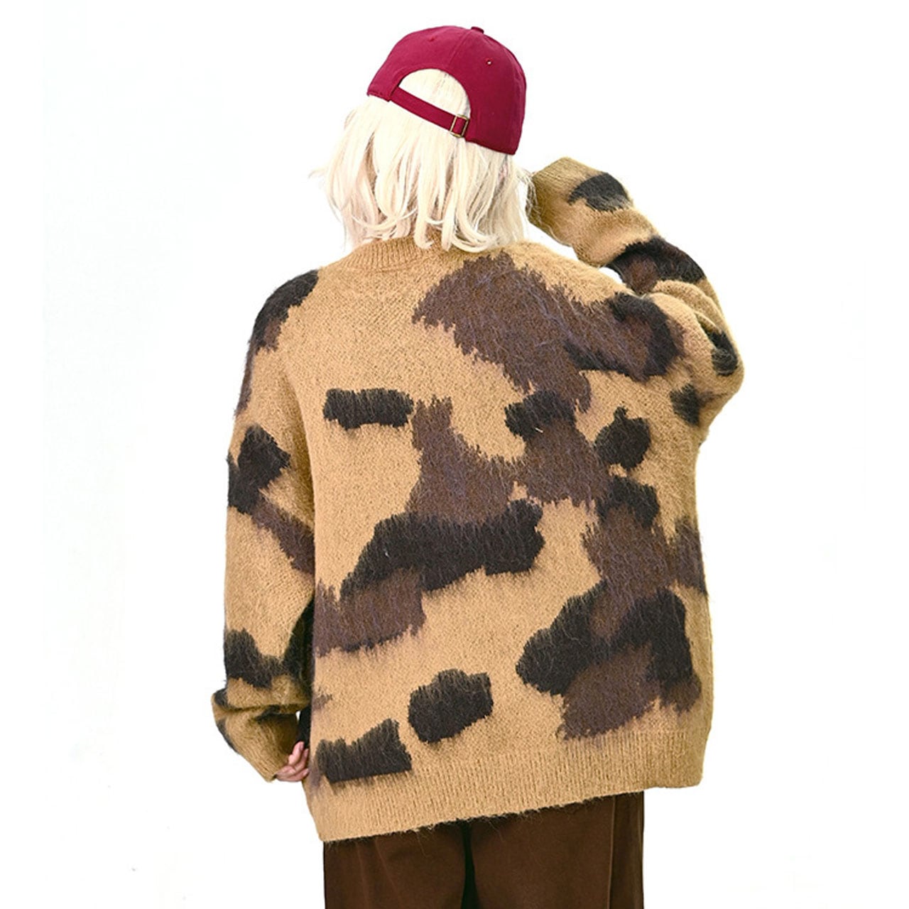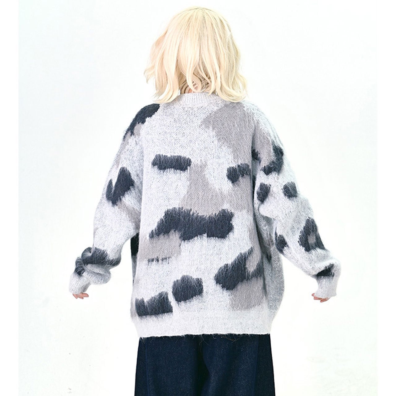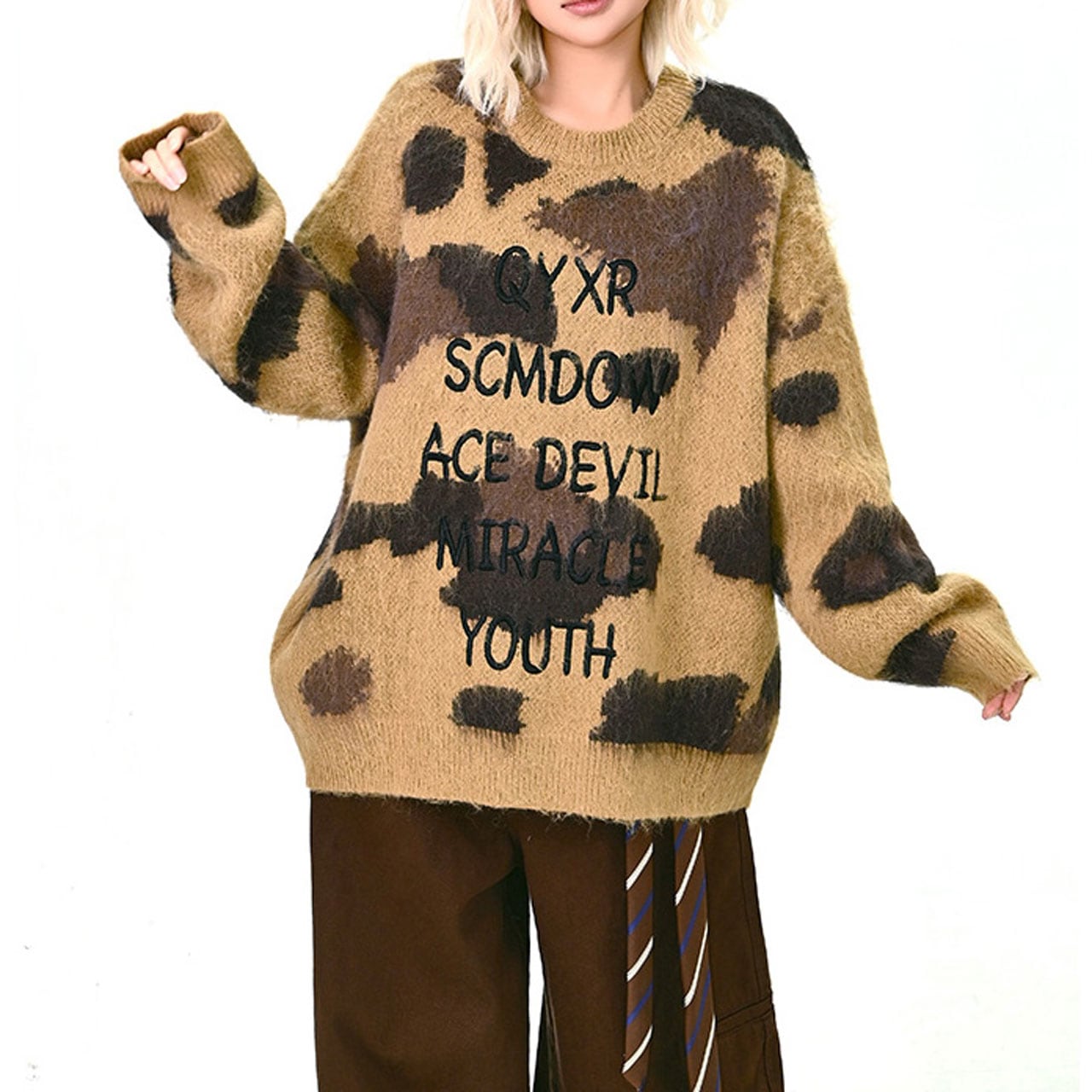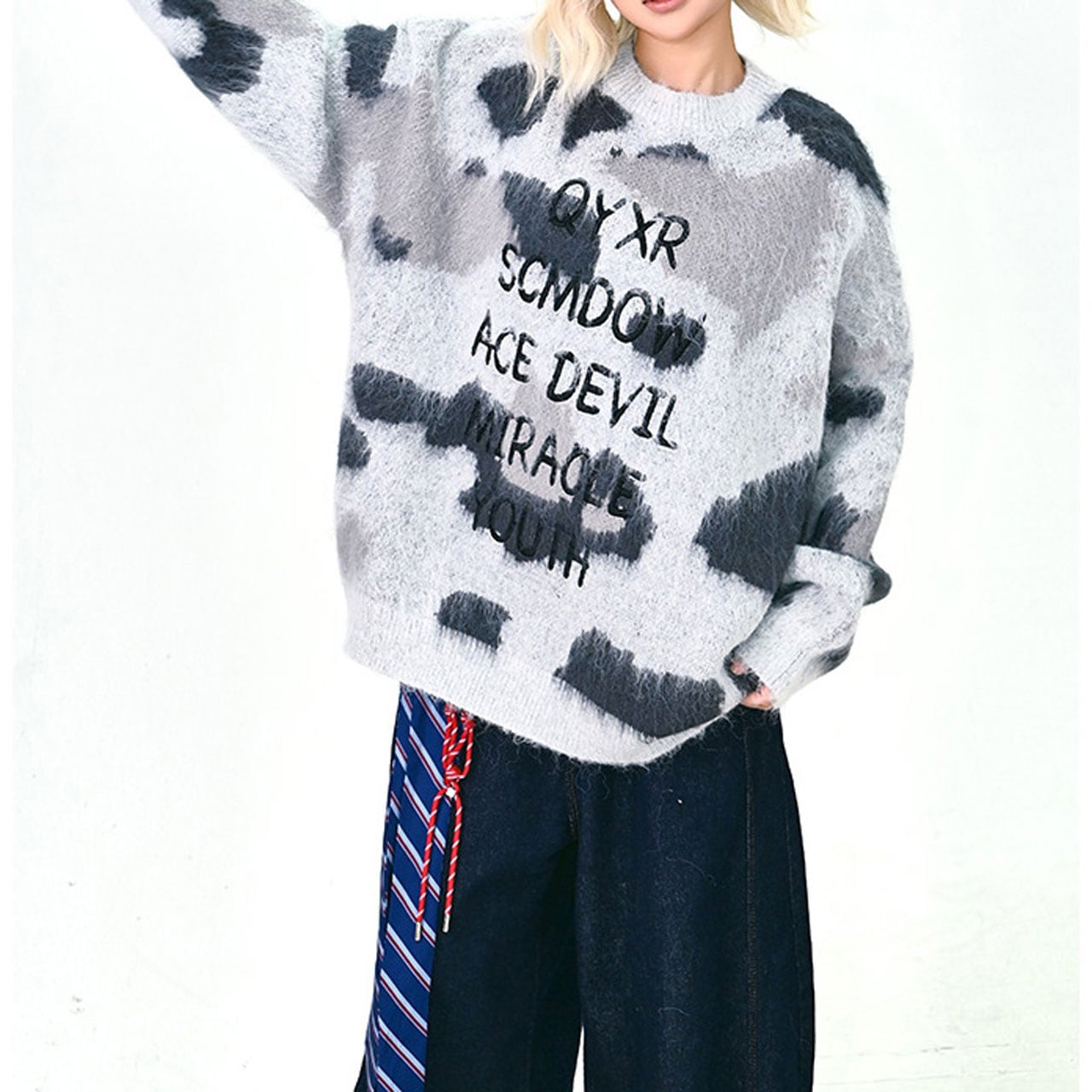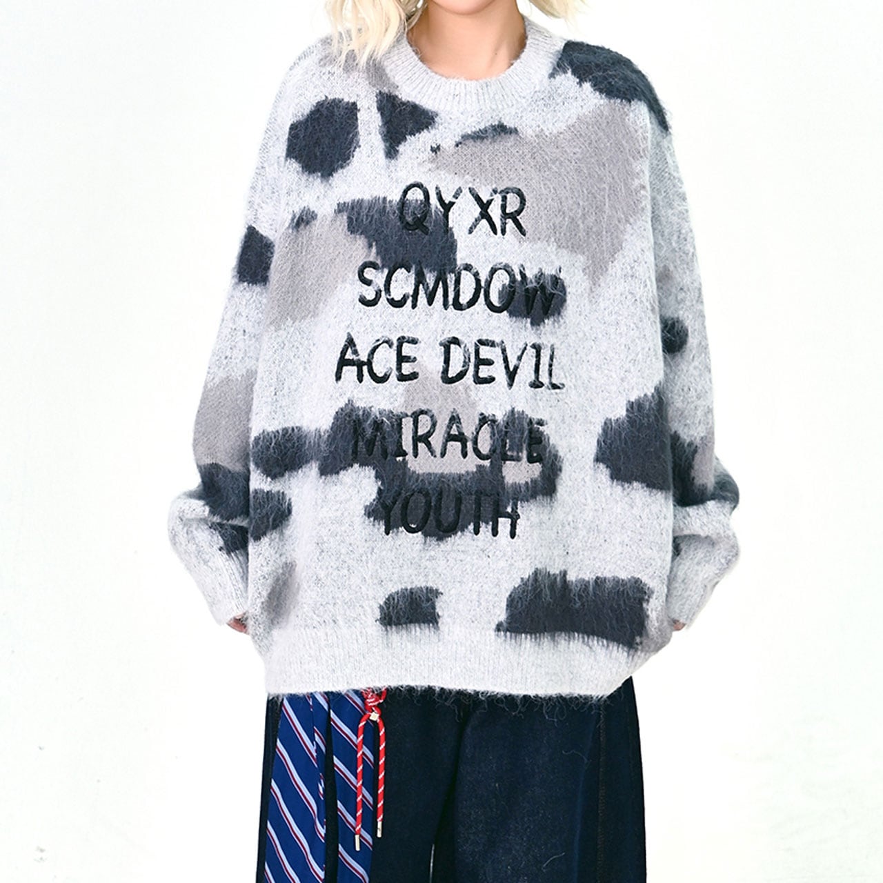 インパクトのある総柄とランダムロゴが印象的なキャッチーニット。