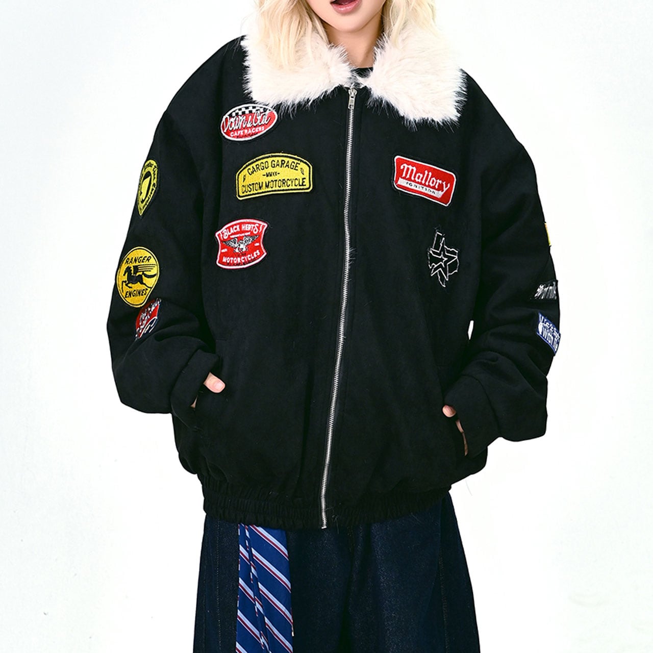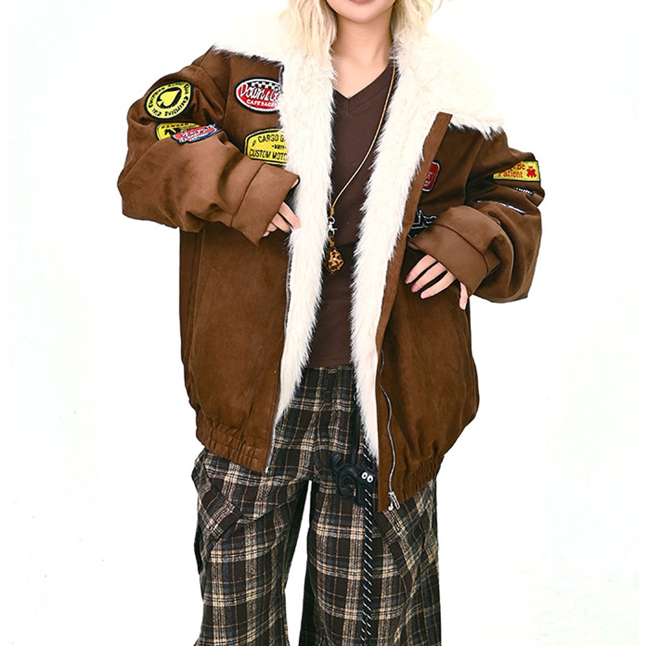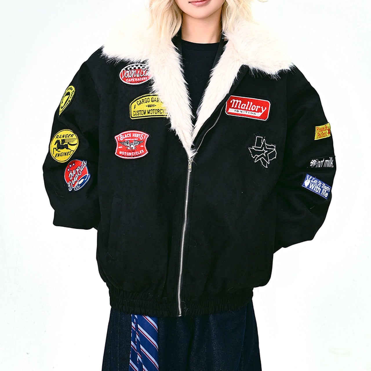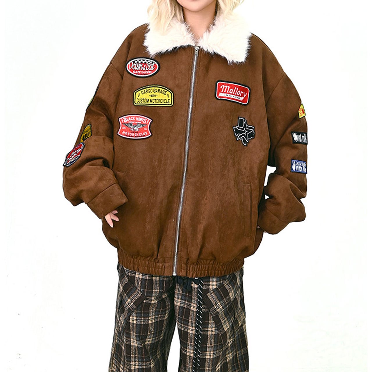 存在感バツグンのワッペンを散りばめた、キャッチーなムートン風ブルゾン。