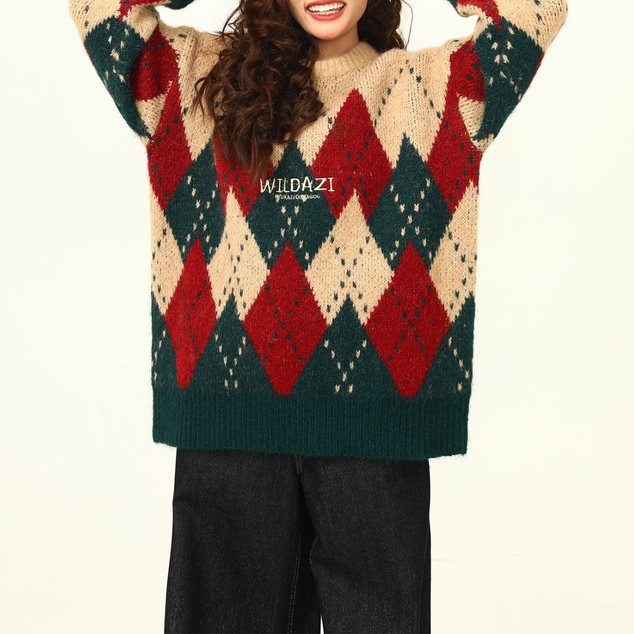 大きめアーガイル柄が目を惹くレトロ感たっぷりのデザインニット。