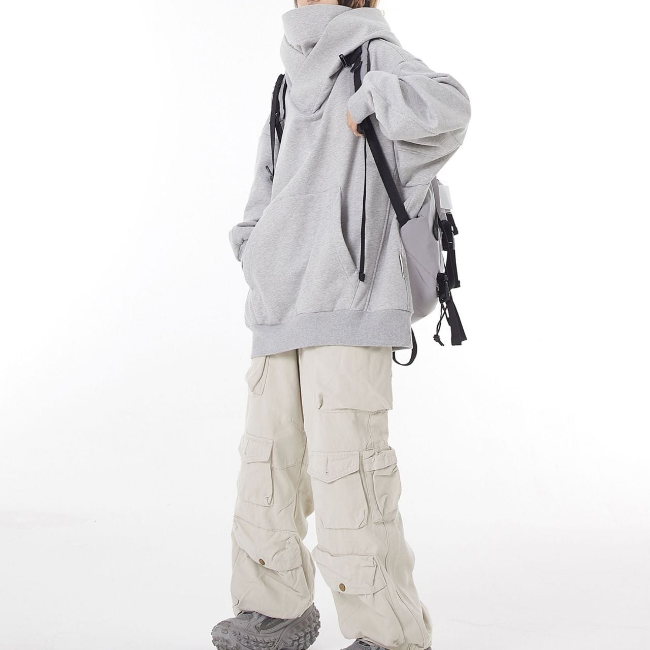 立体的なハイネックフードが目を惹く、存在感たっぷりのビッグパーカー。