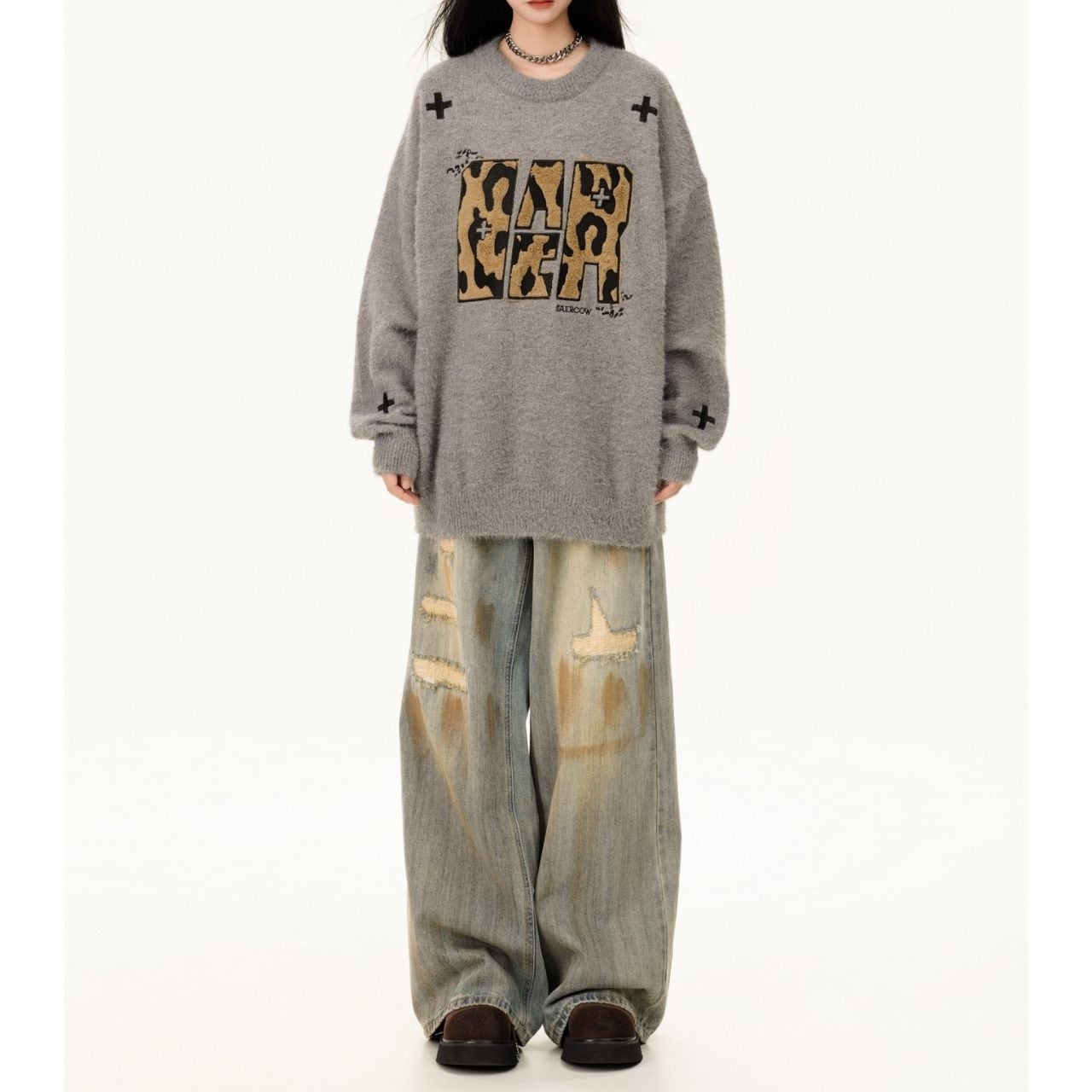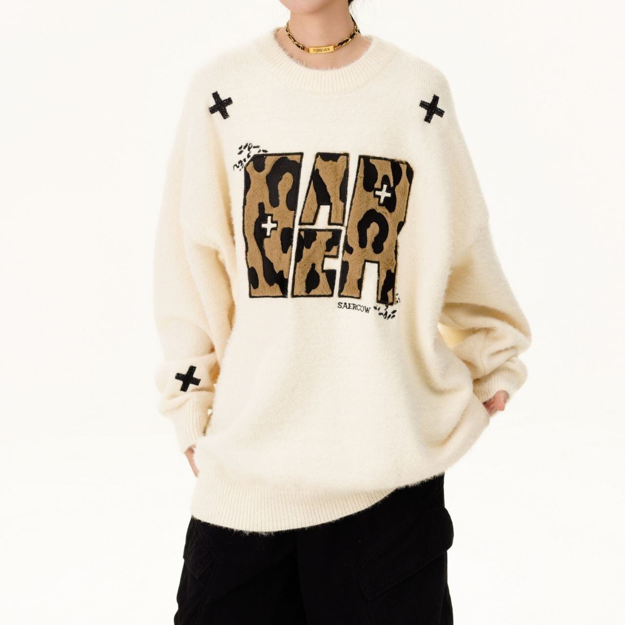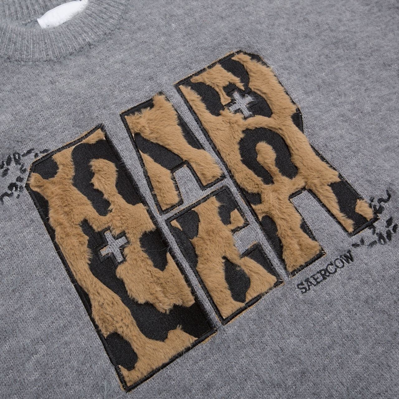 レオパード柄のロゴデザインが目を引く、存在感のあるニットトップス。