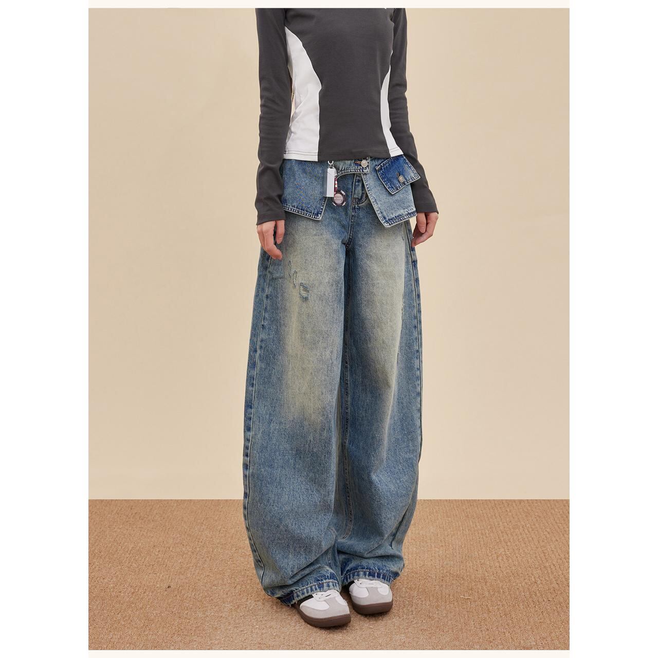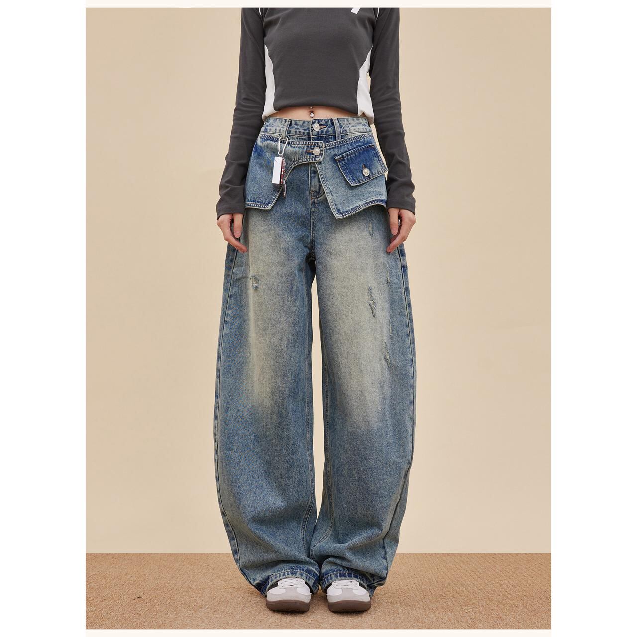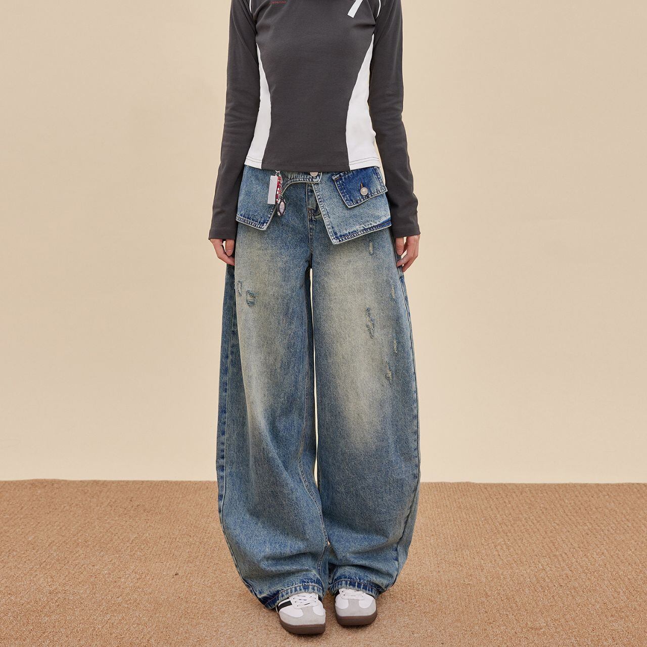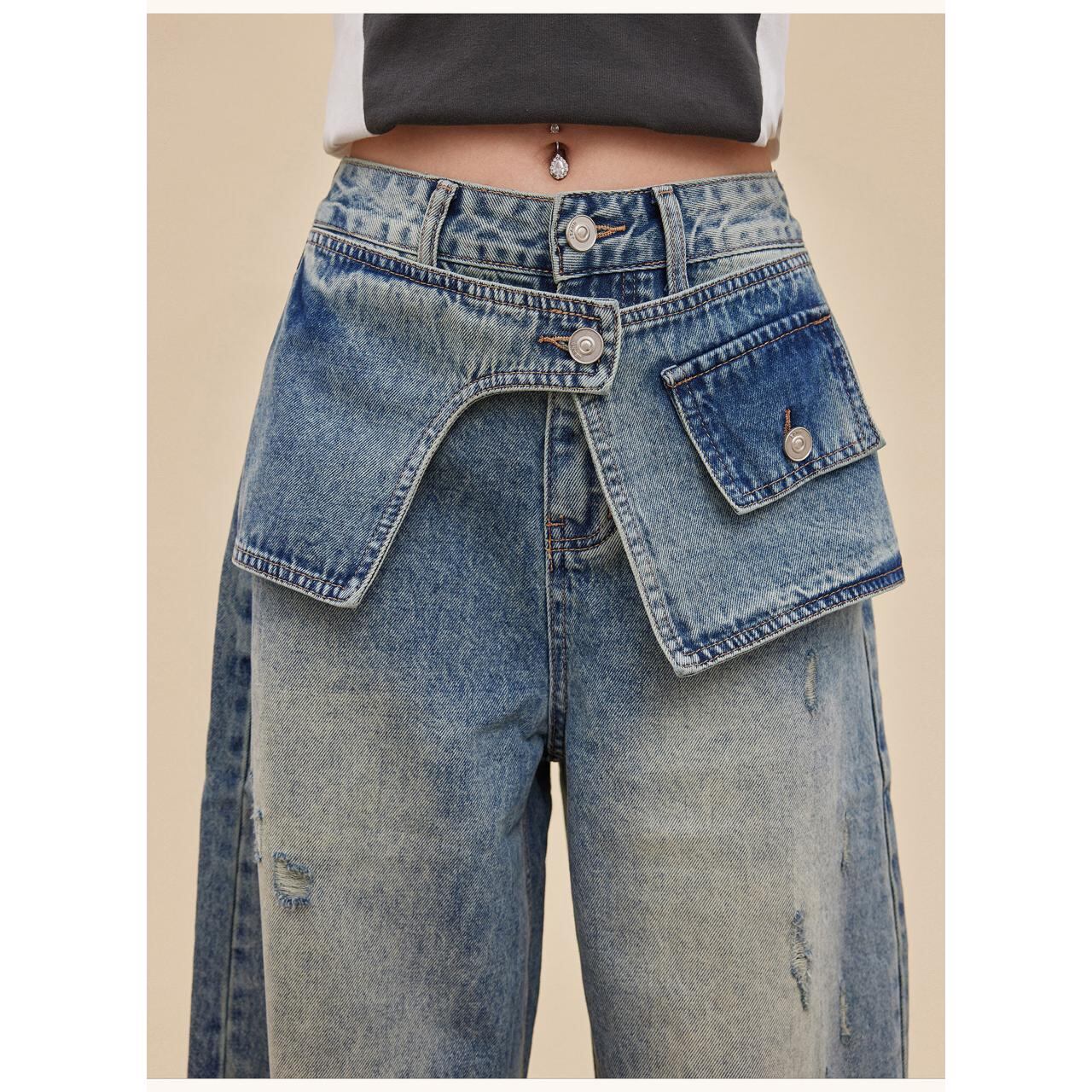 大胆なレイヤード風デザインが目を引くワイドデニム。