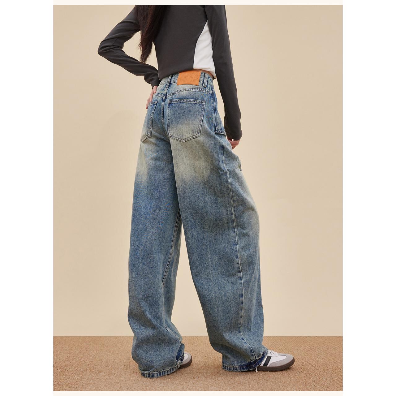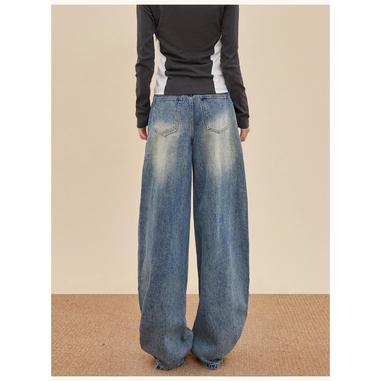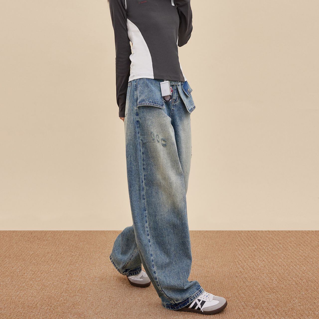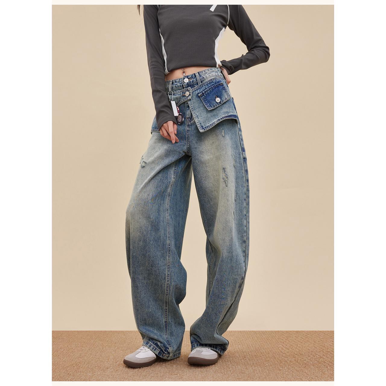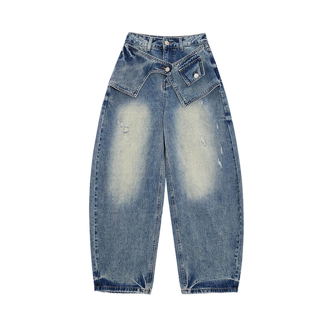 大胆なレイヤード風デザインが目を引くワイドデニム。