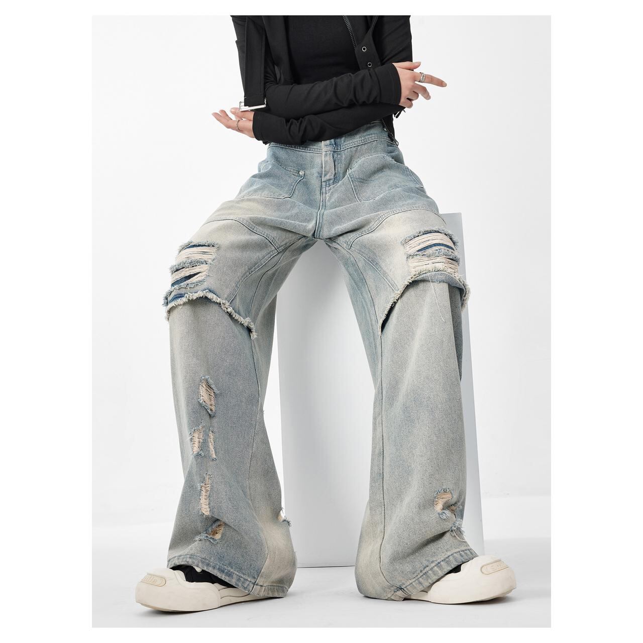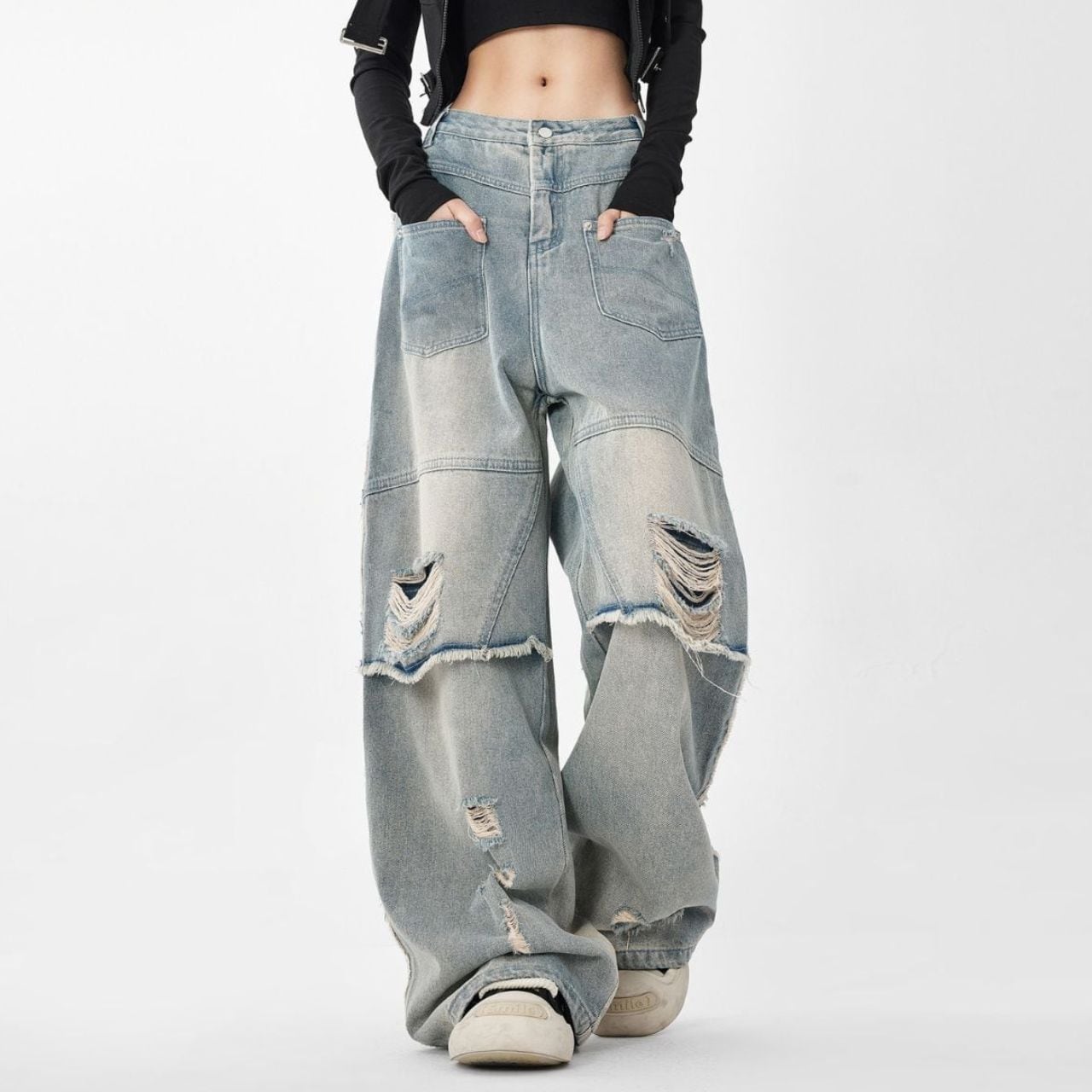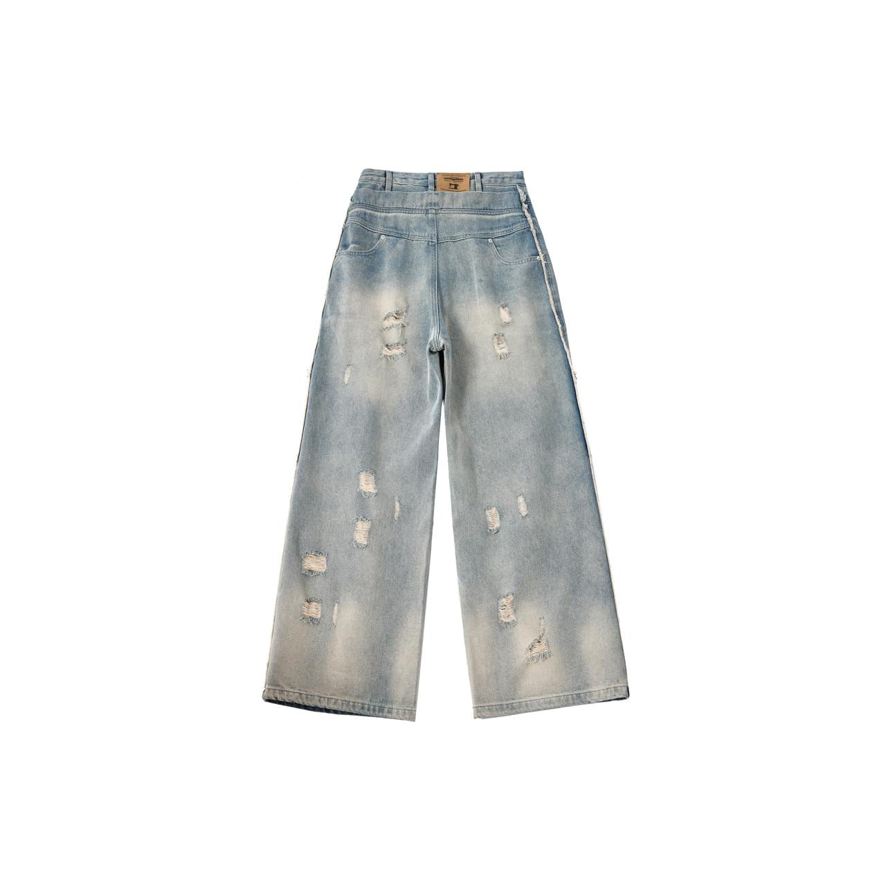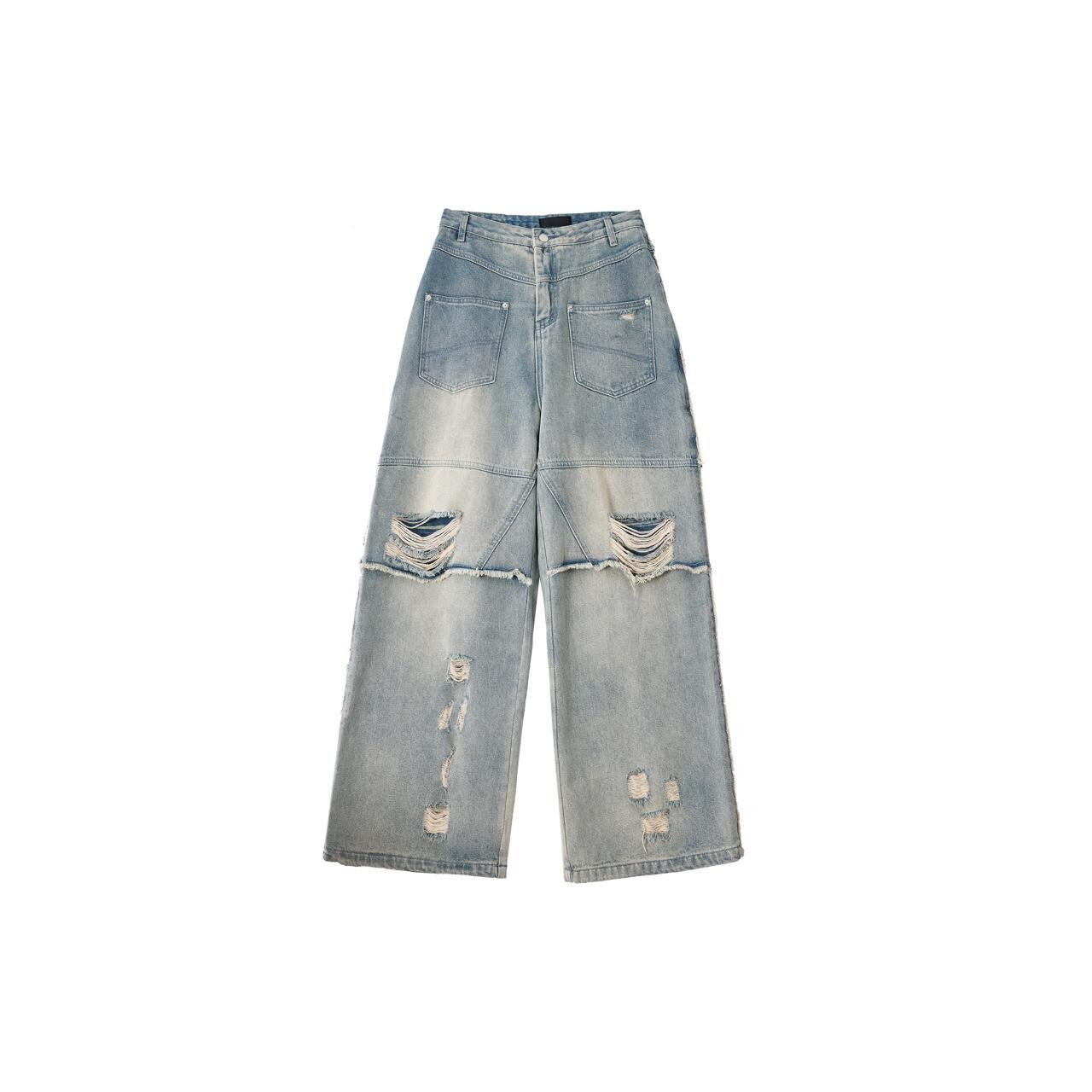 大胆なダメージ加工が目を引く、存在感たっぷりのワイドデニム。