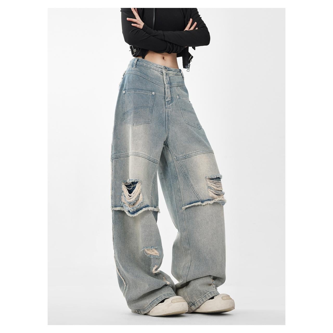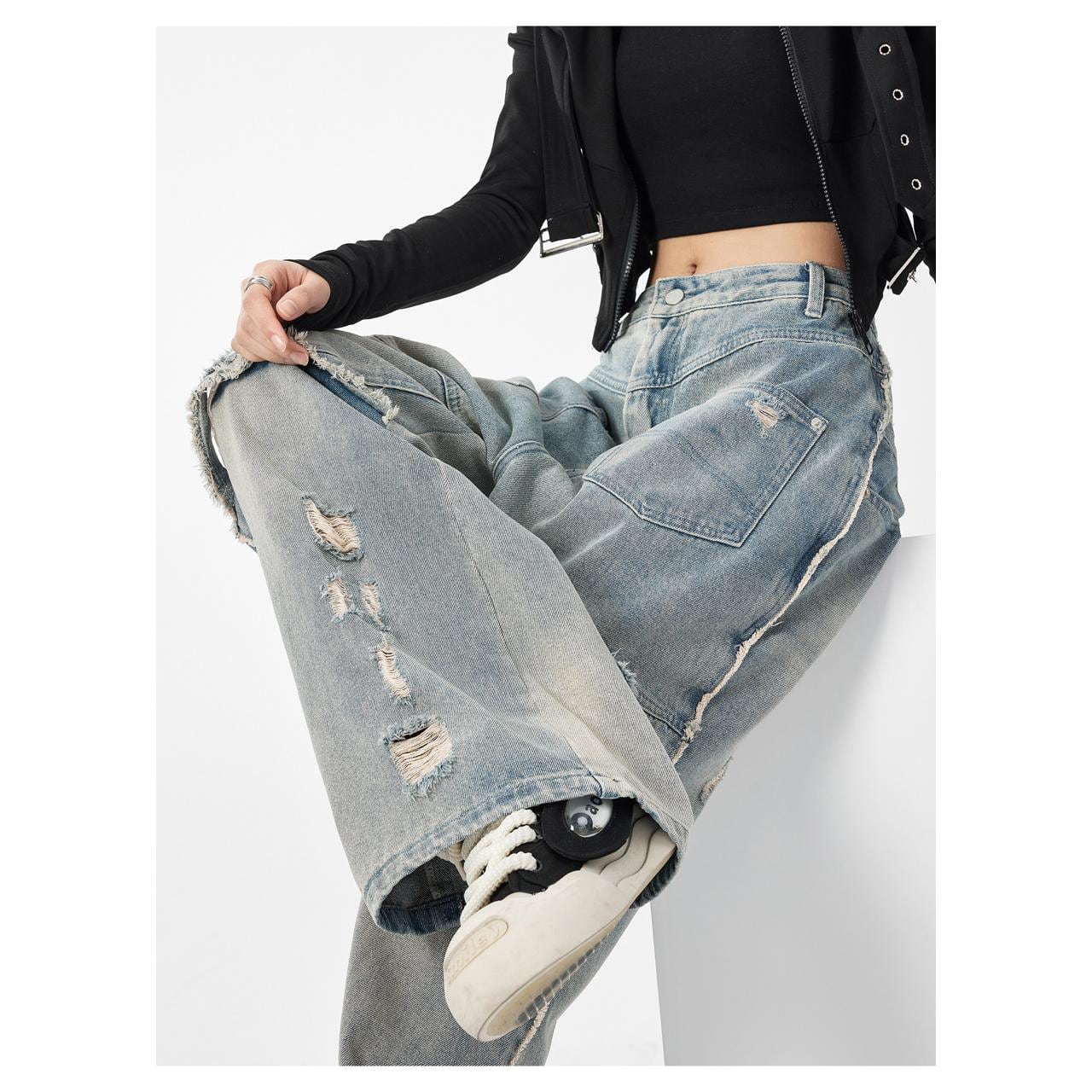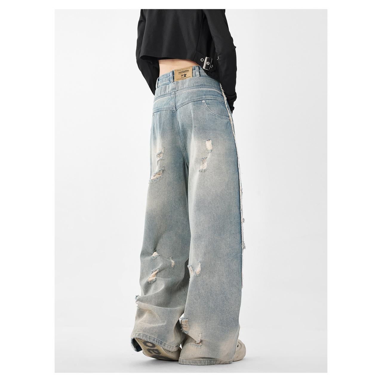 大胆なダメージ加工が目を引く、存在感たっぷりのワイドデニム。