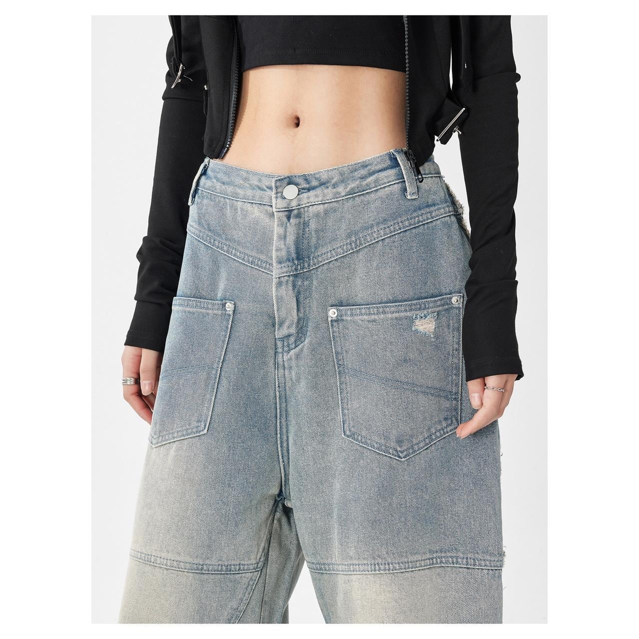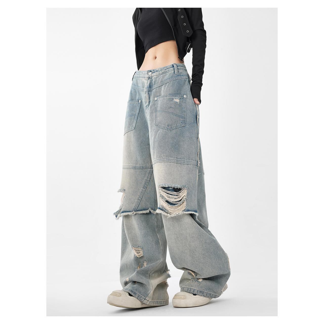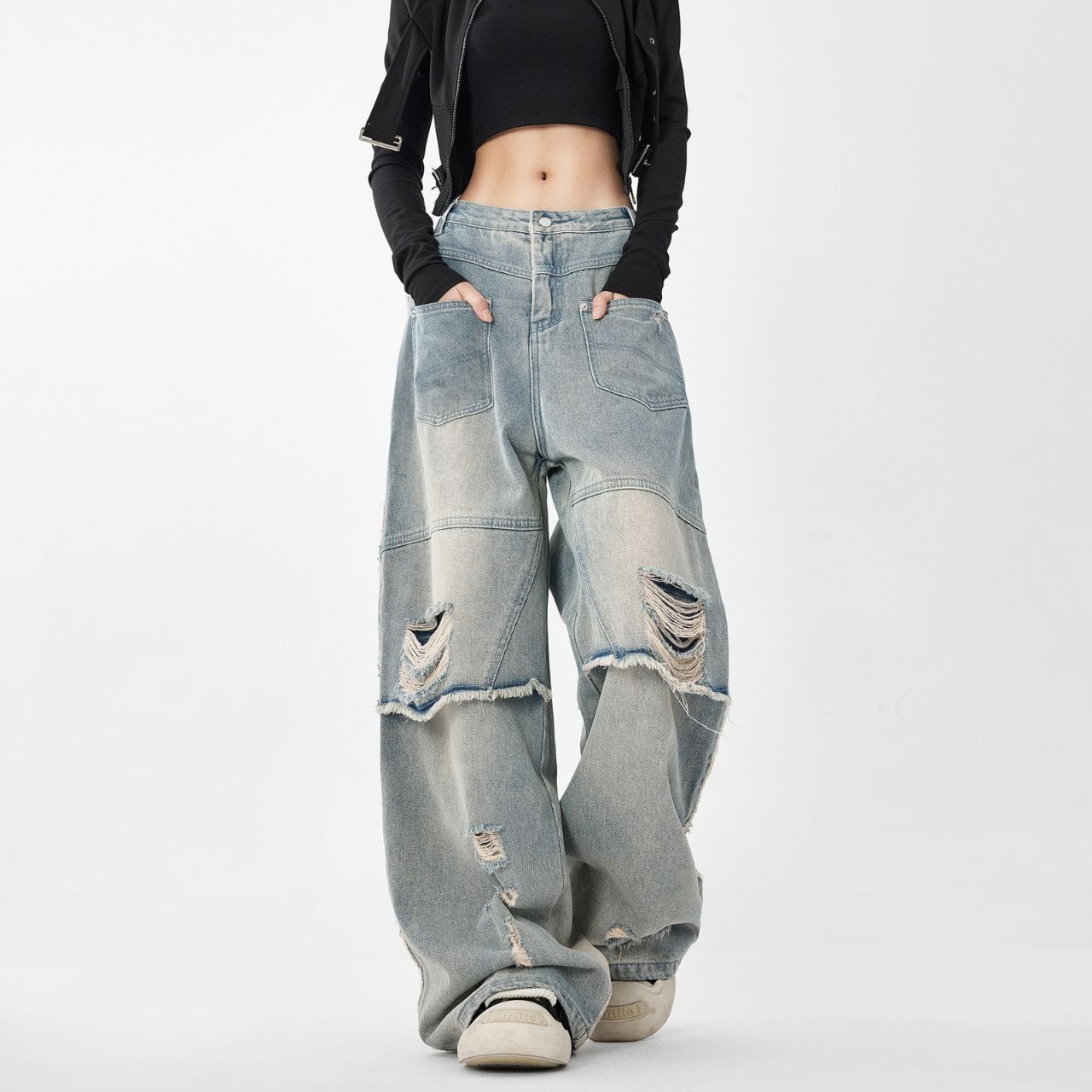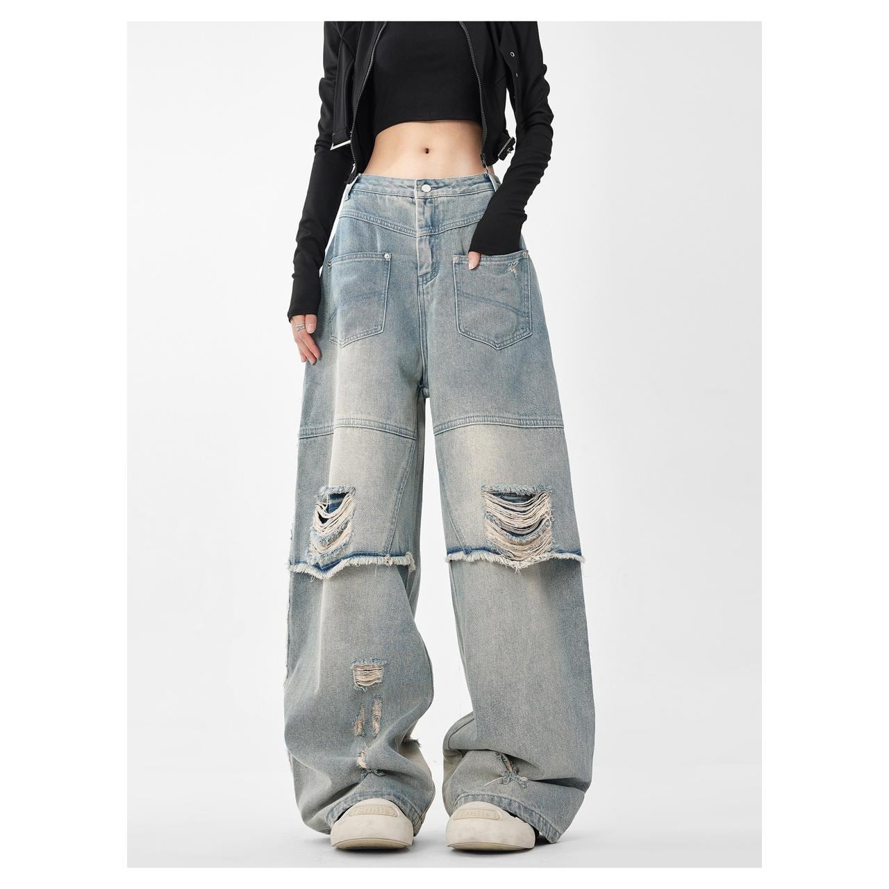 大胆なダメージ加工が目を引く、存在感たっぷりのワイドデニム。
