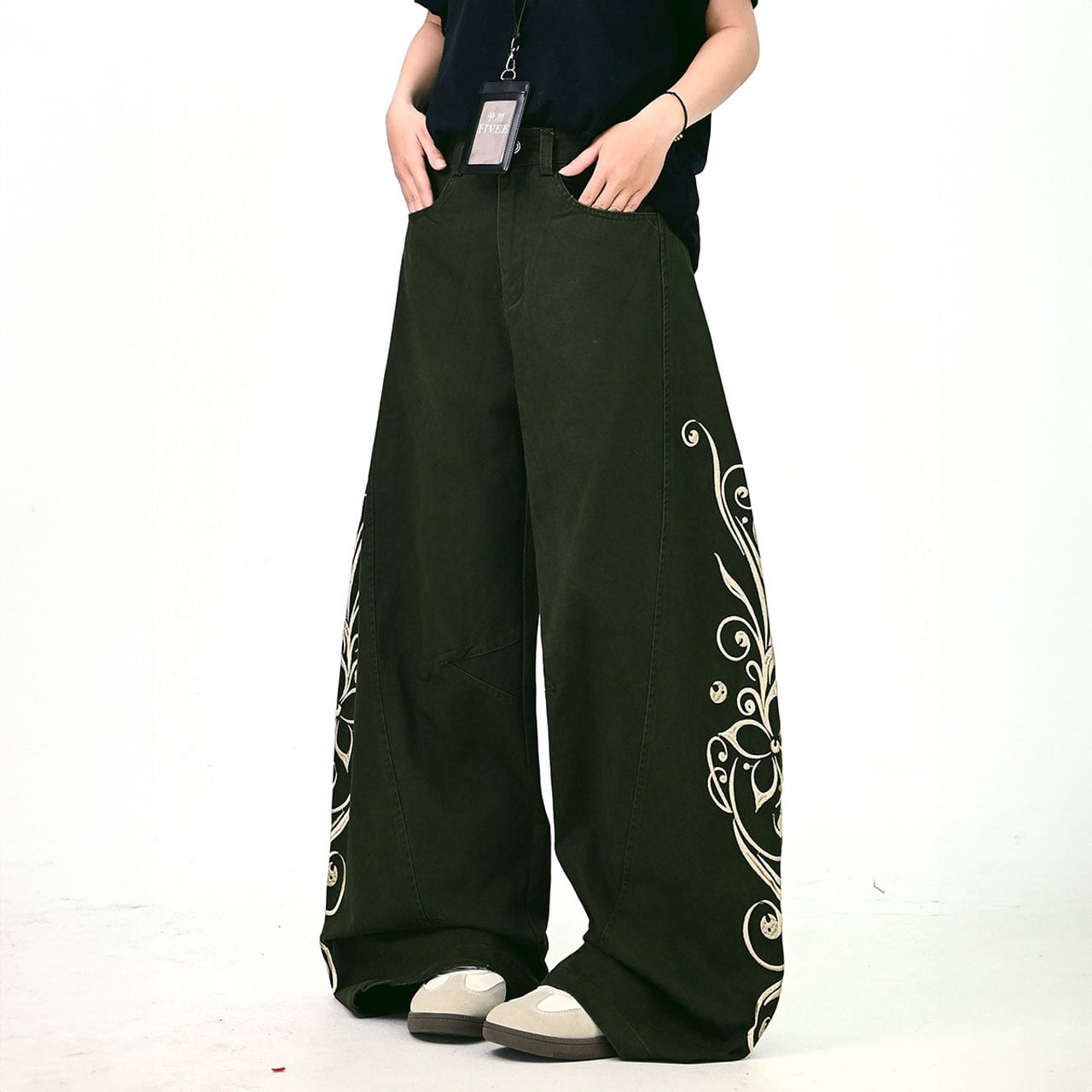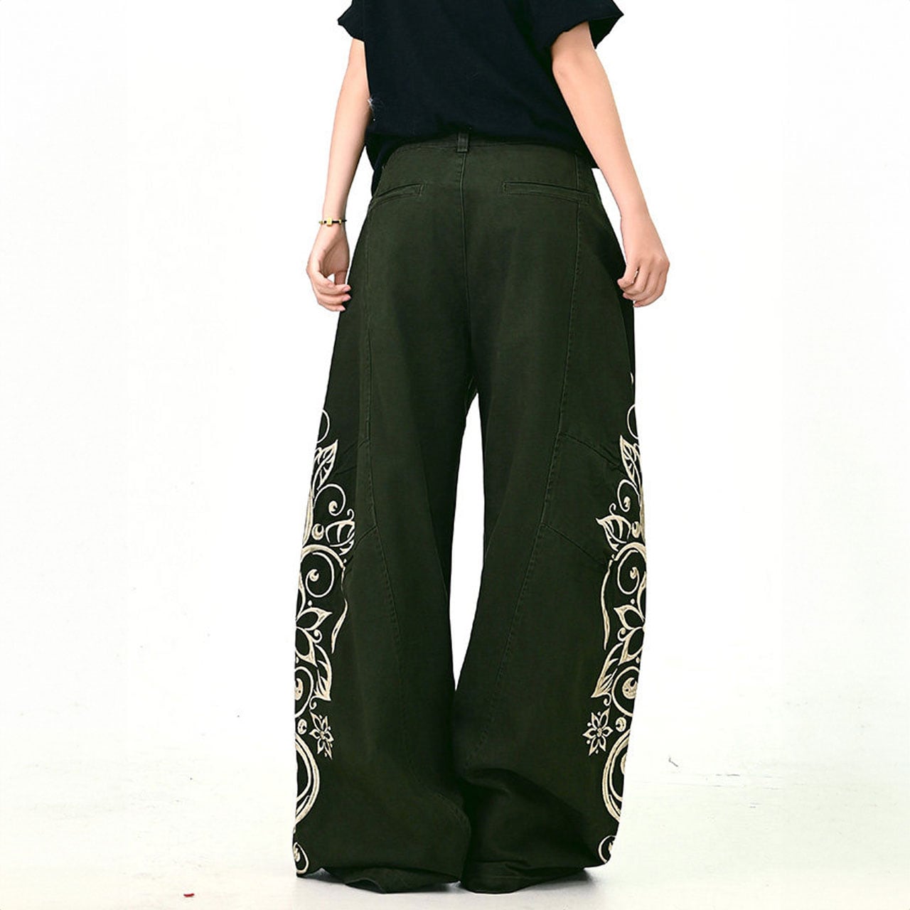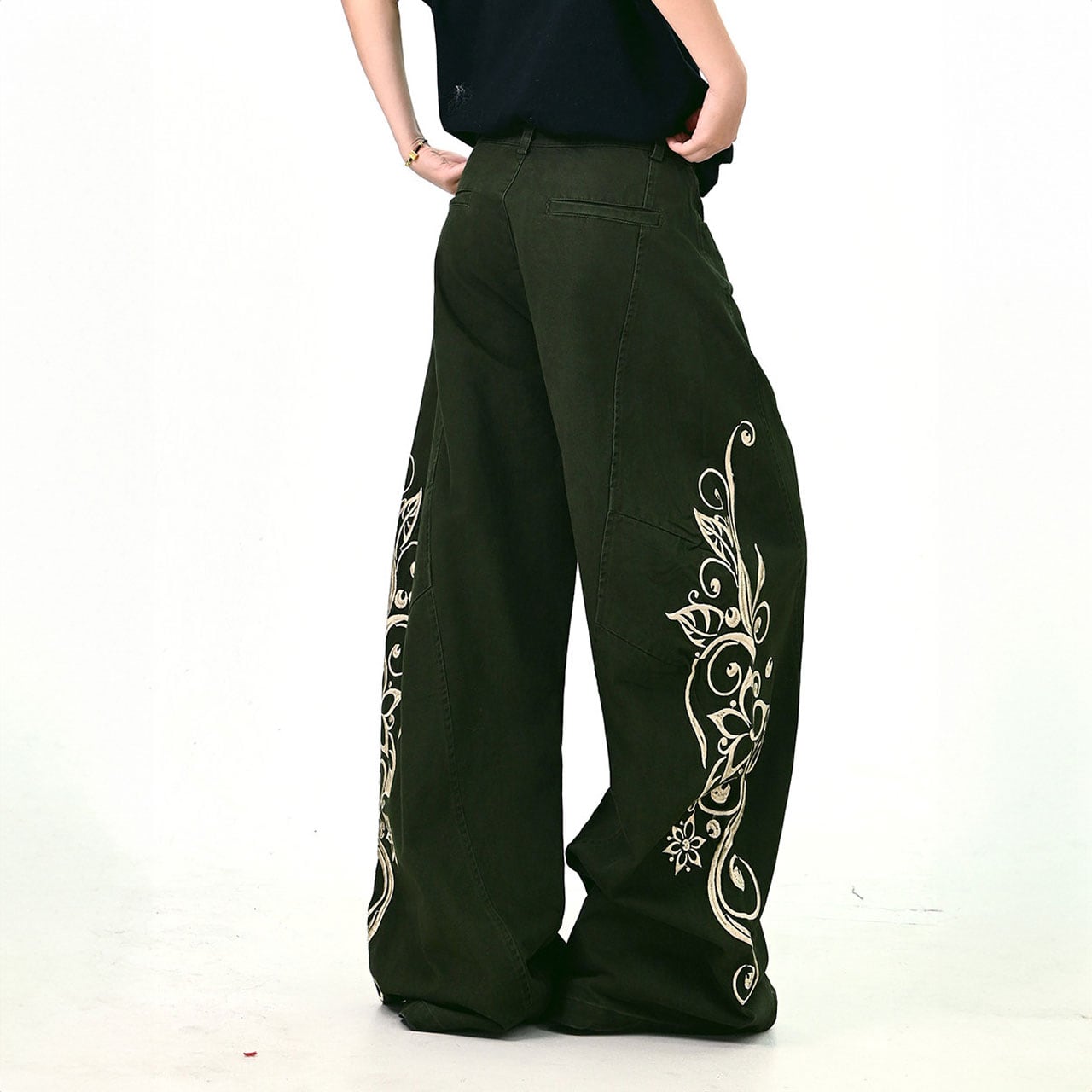 サイドに描かれたフローラルモチーフが印象的なワイドパンツ。