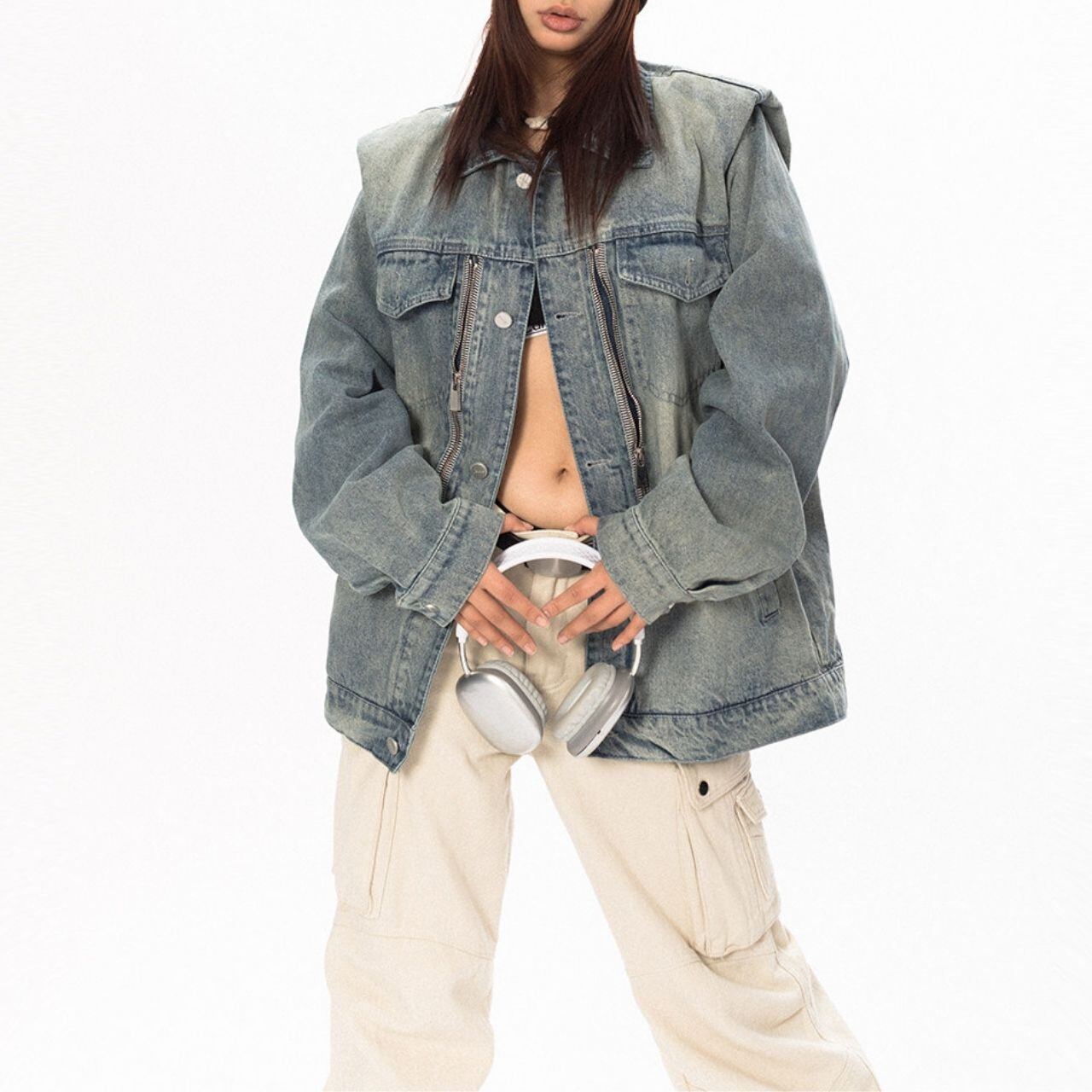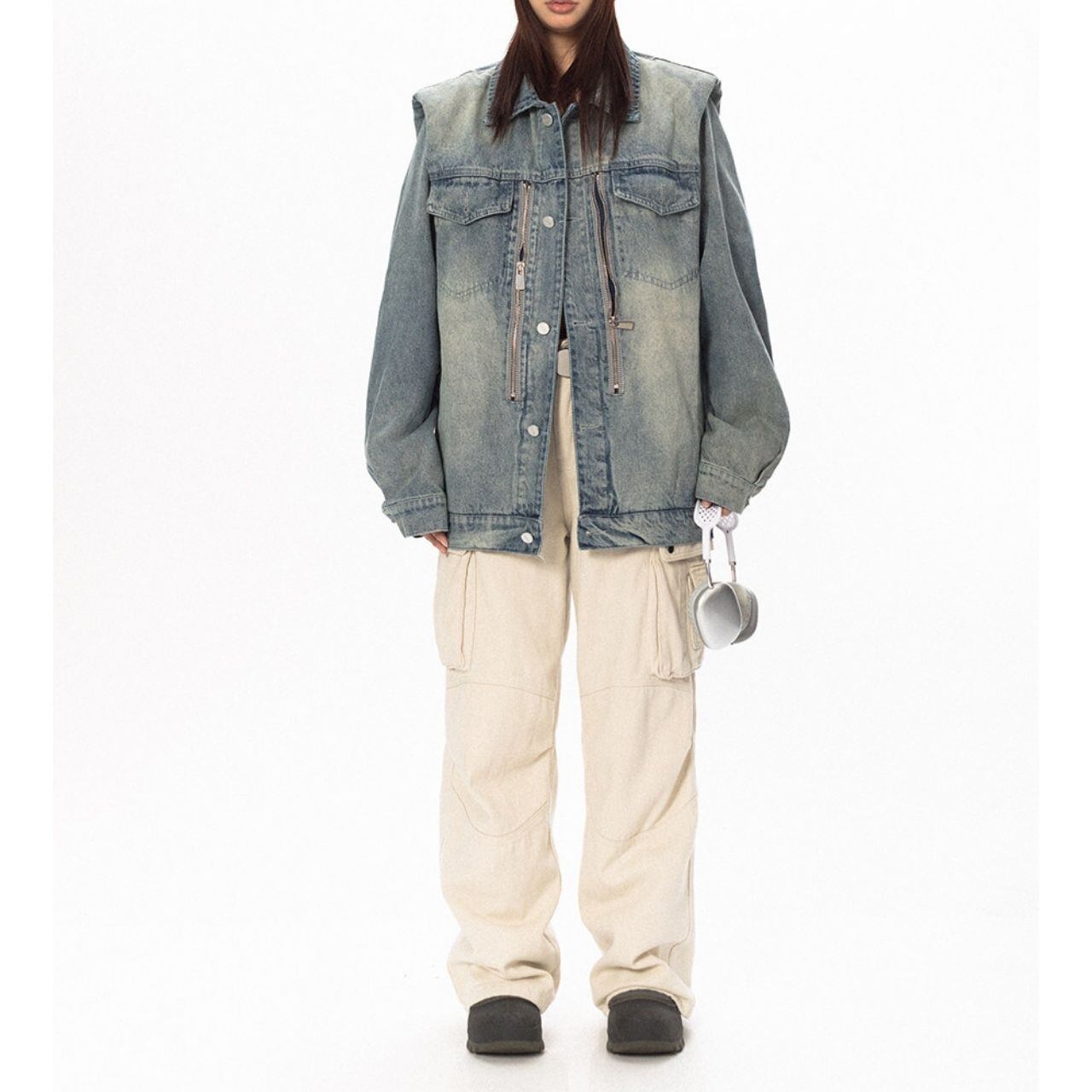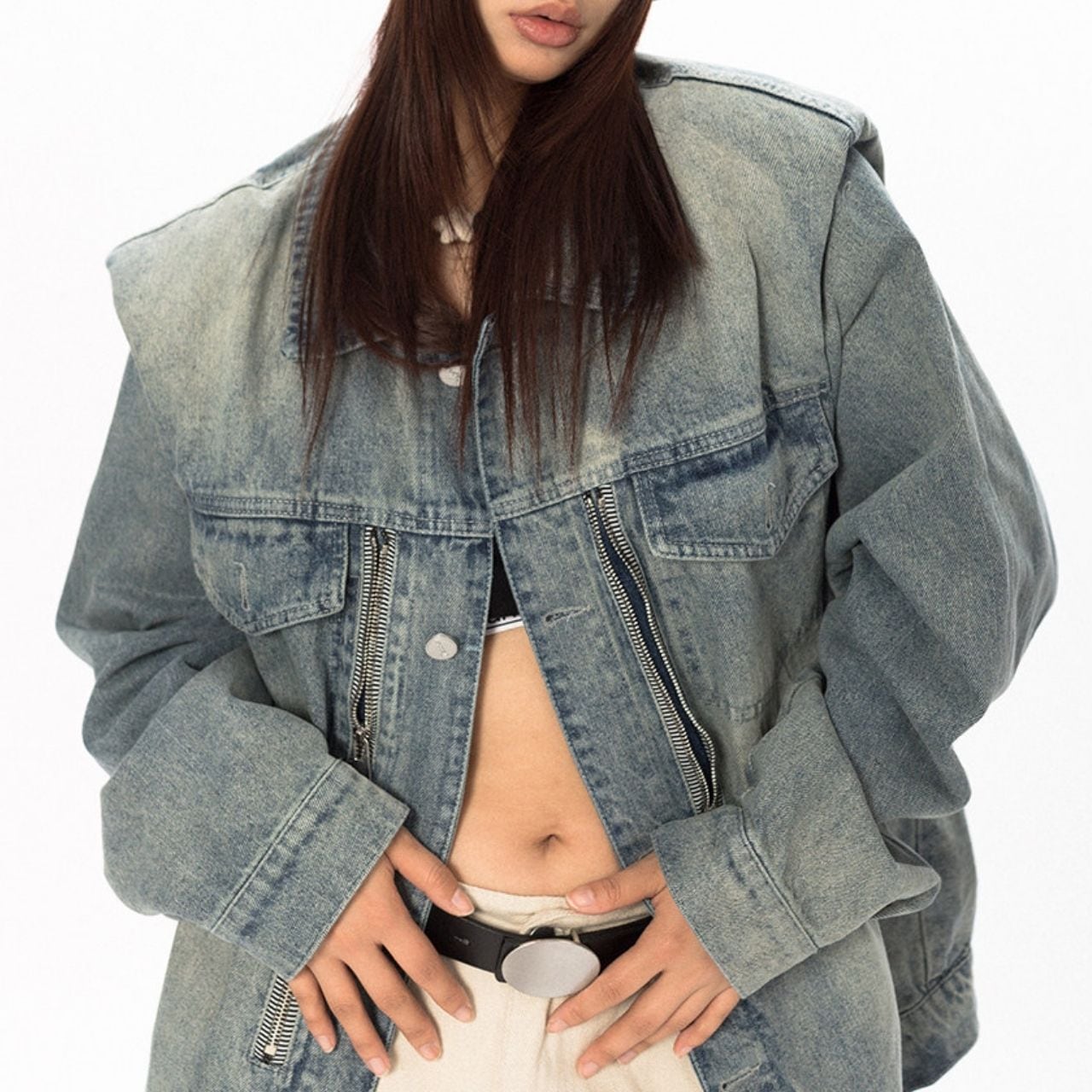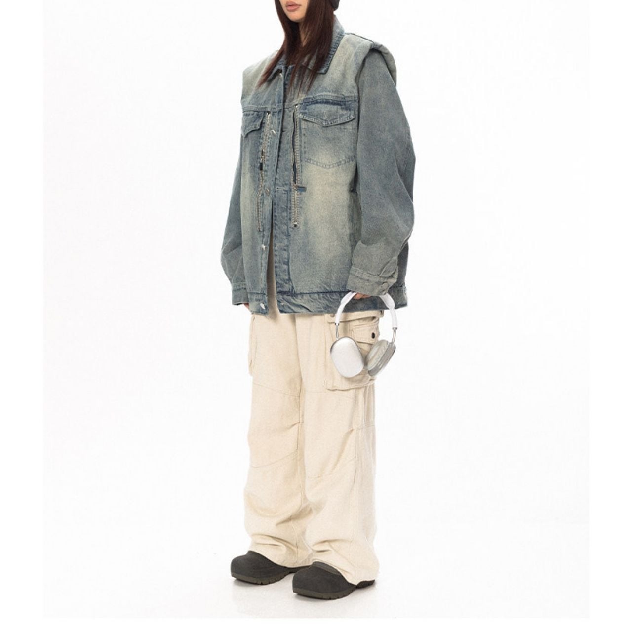 立体感のあるショルダーデザインが目を引く、存在感抜群のデニムジャケット。