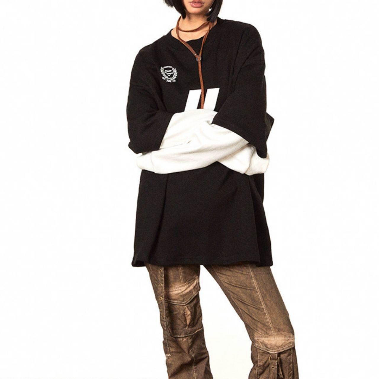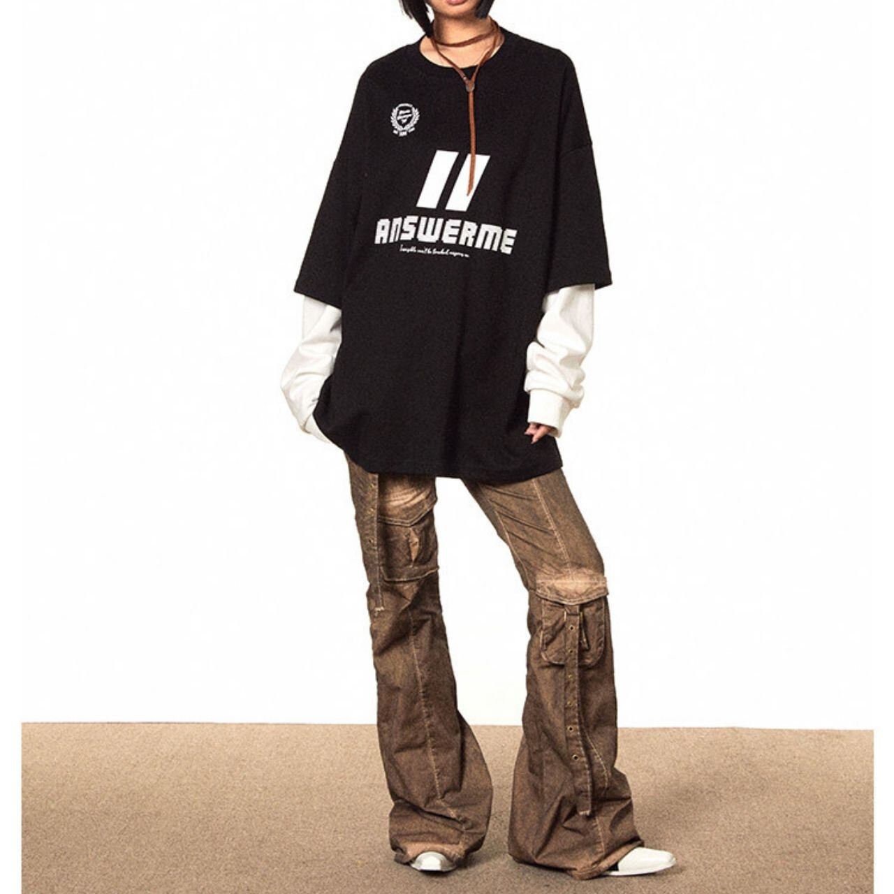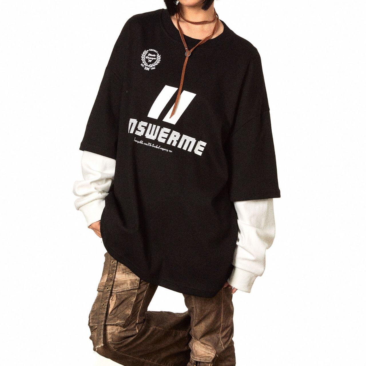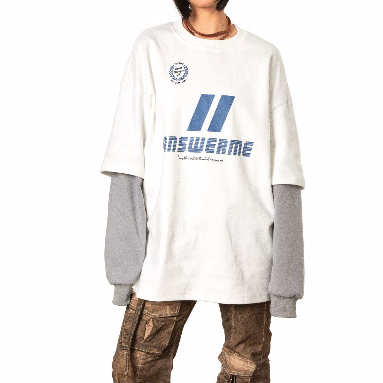レイヤード風の袖デザインが目を引く、ストリート感漂うロングスリーブトップス。