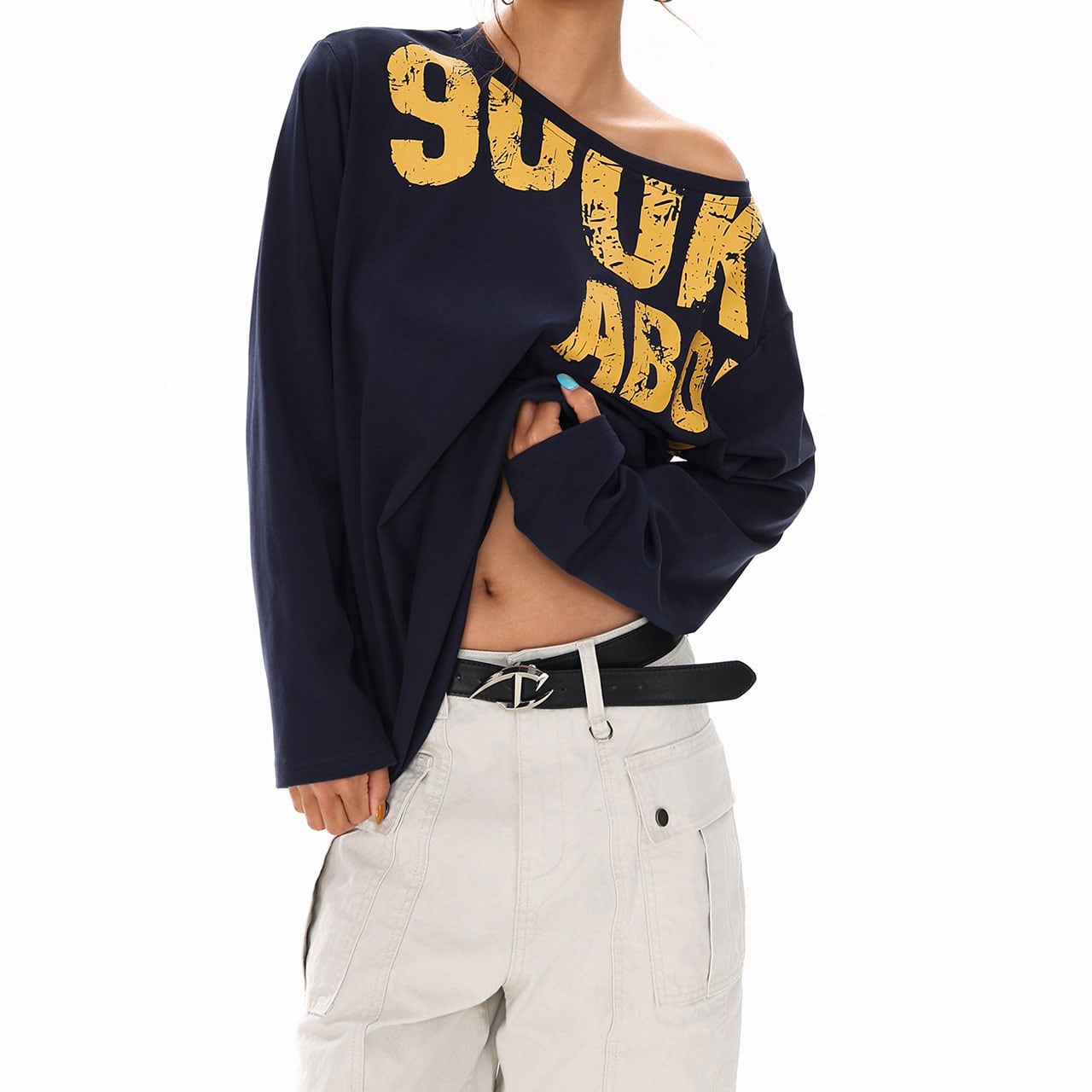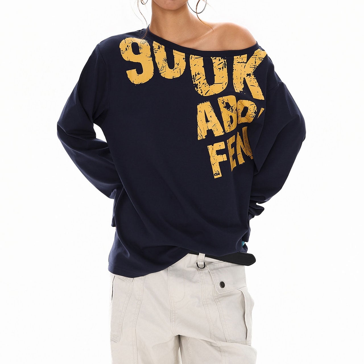 大胆なロゴプリントとワンショル風のネックラインが目を引くトップス。