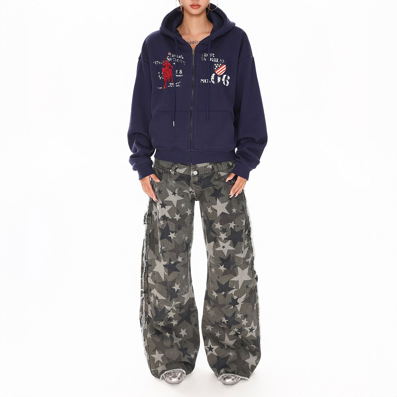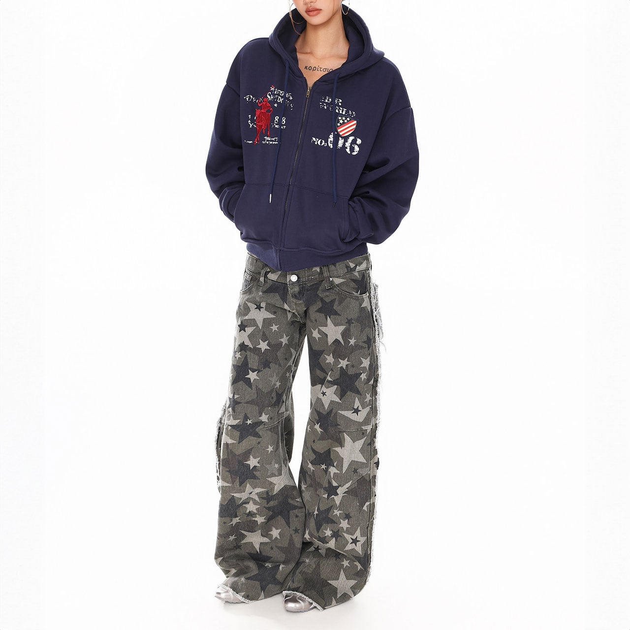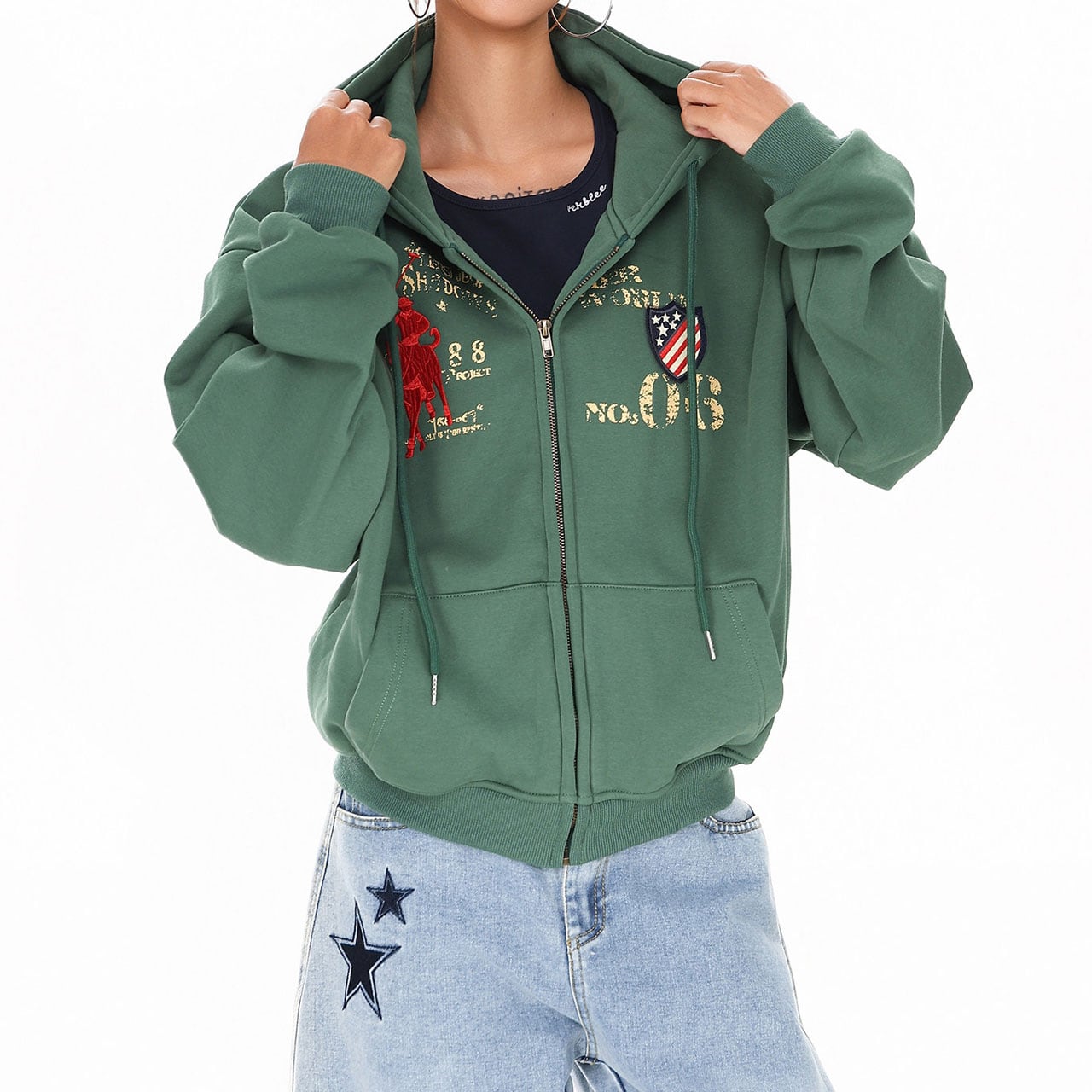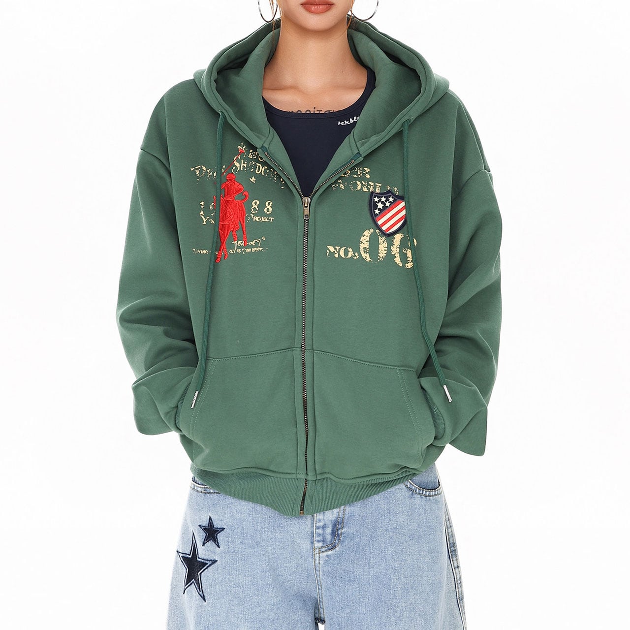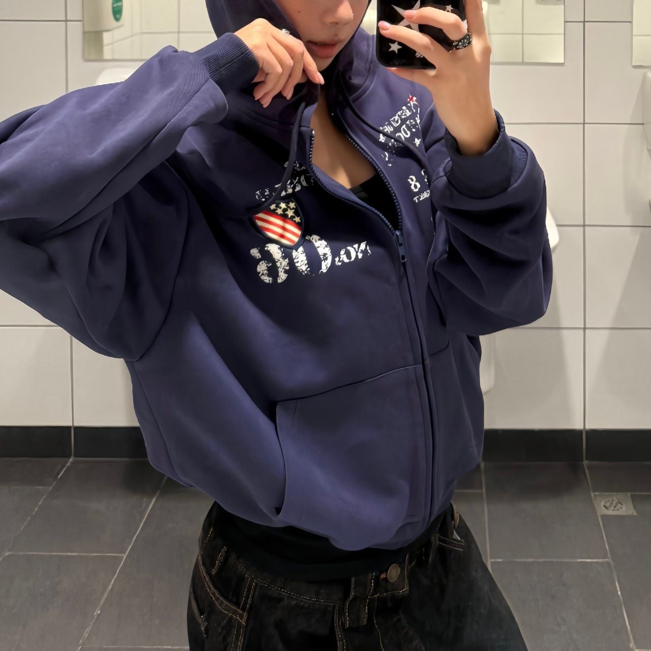 ヴィンテージライクなプリントが目を引く、ジップアップフーディー。