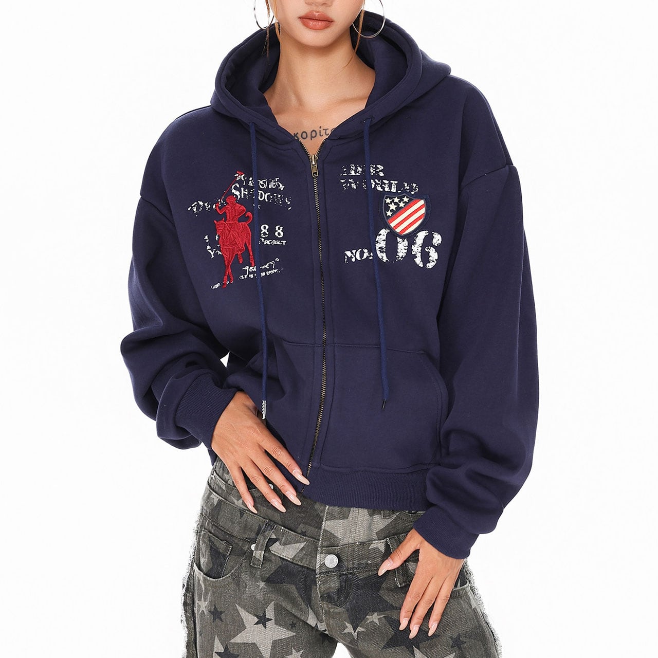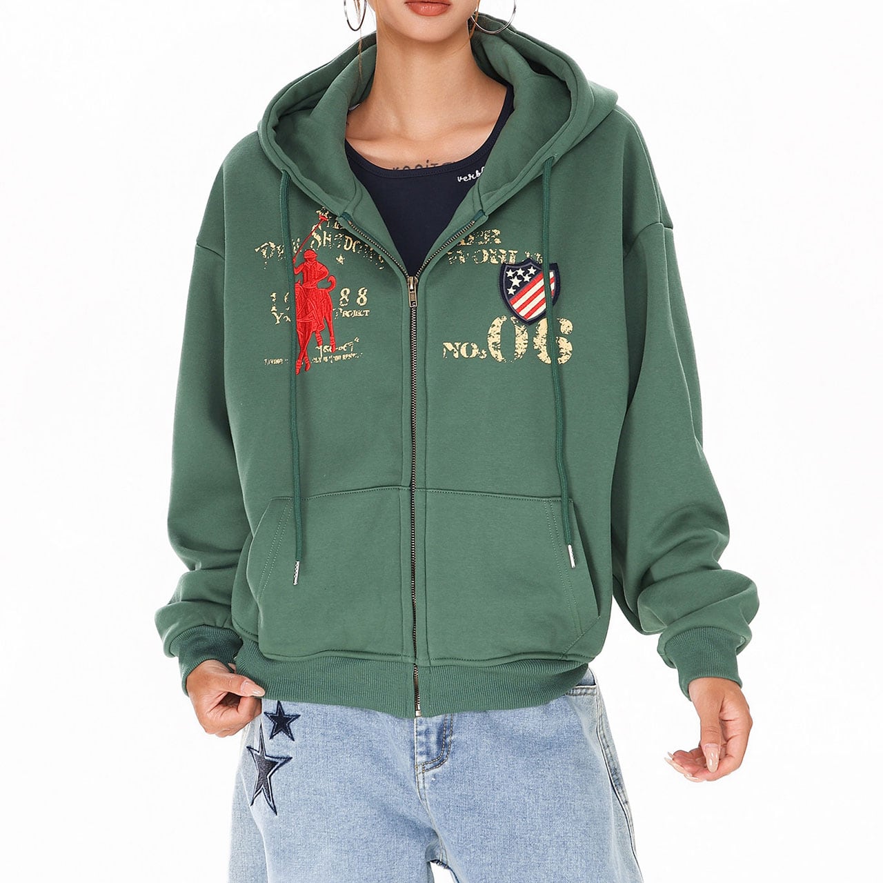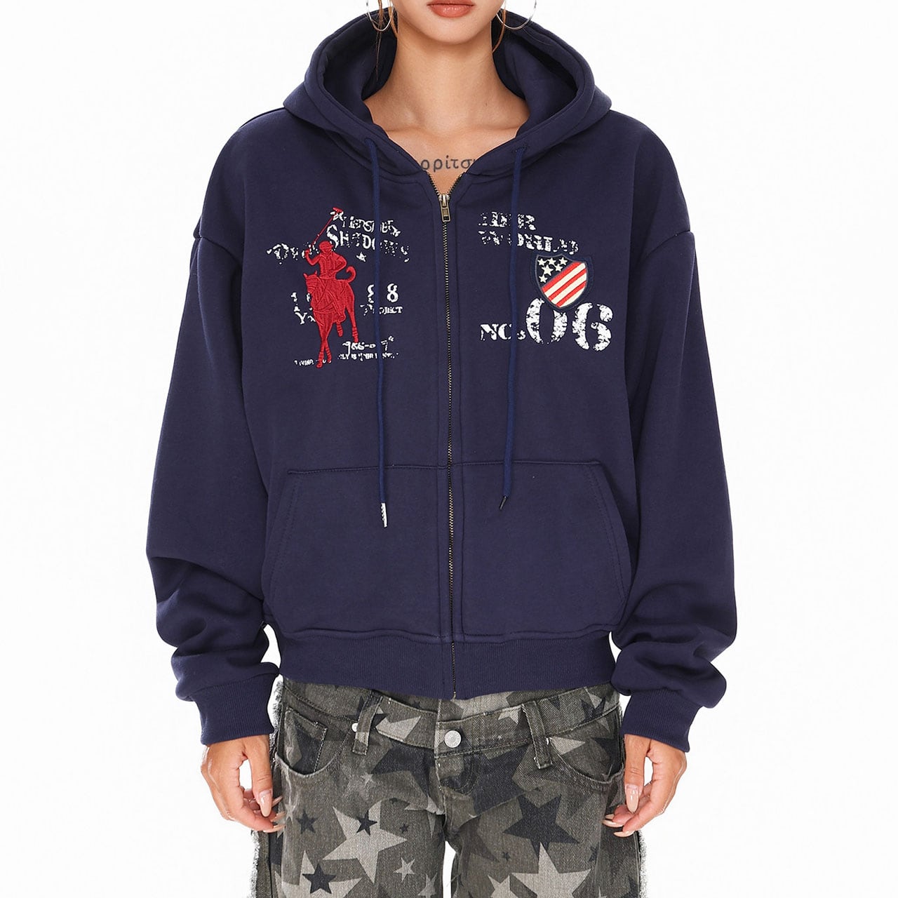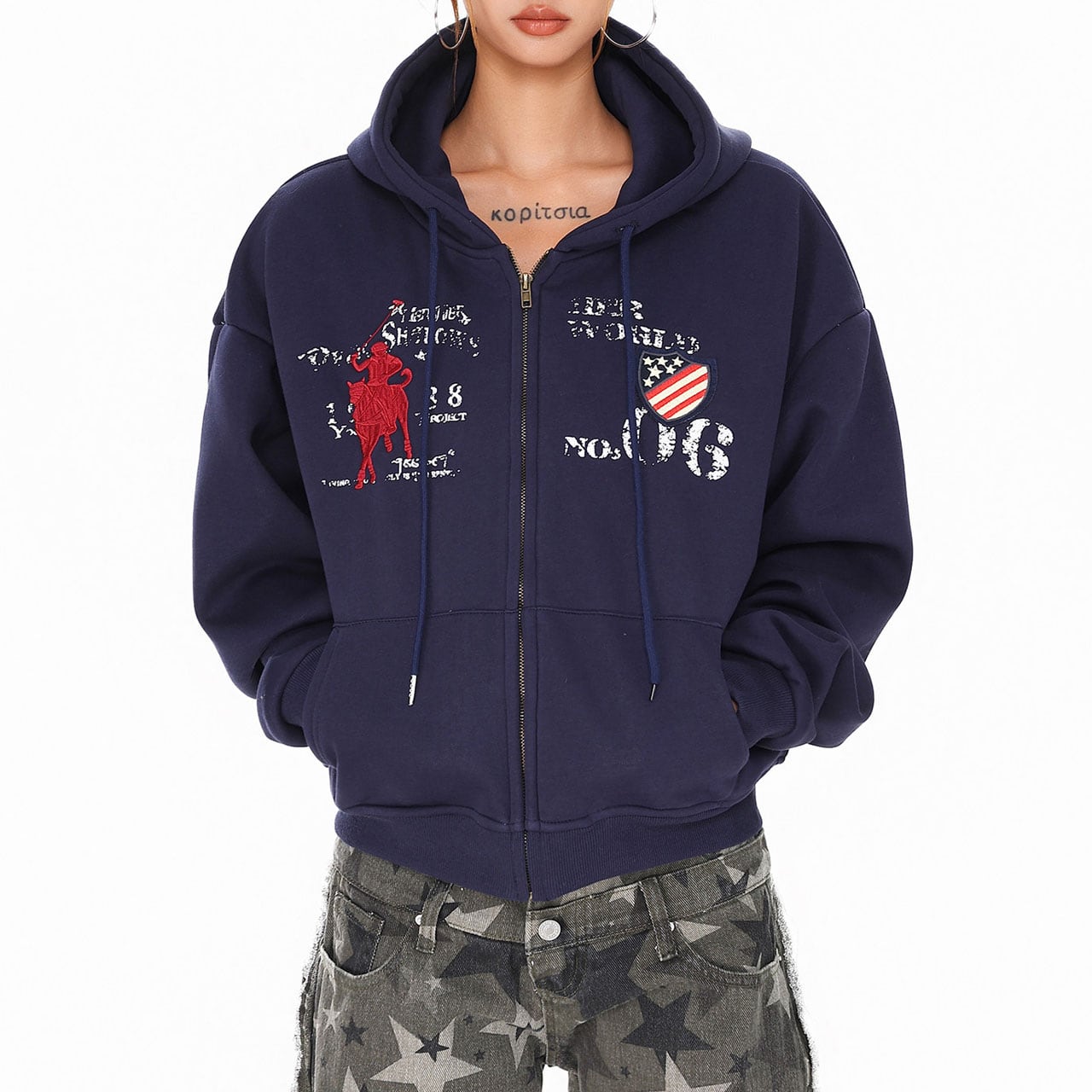 ヴィンテージライクなプリントが目を引く、ジップアップフーディー。