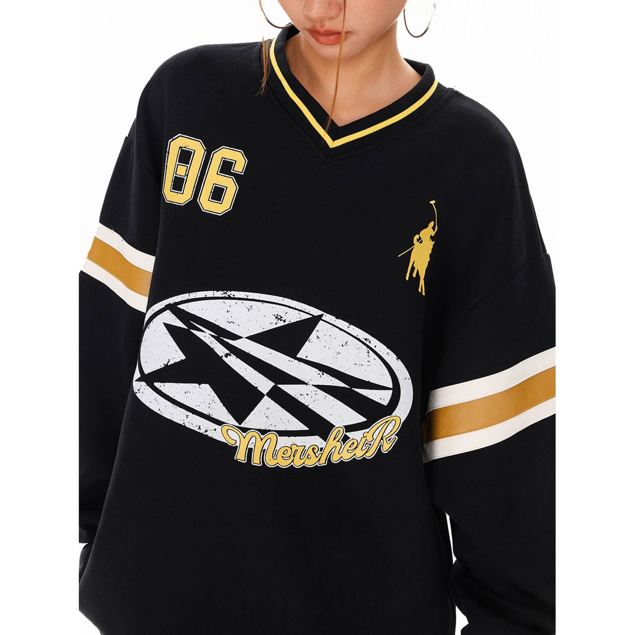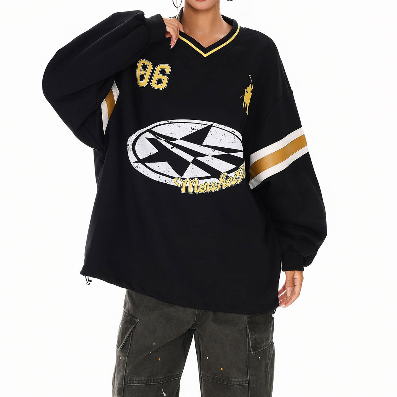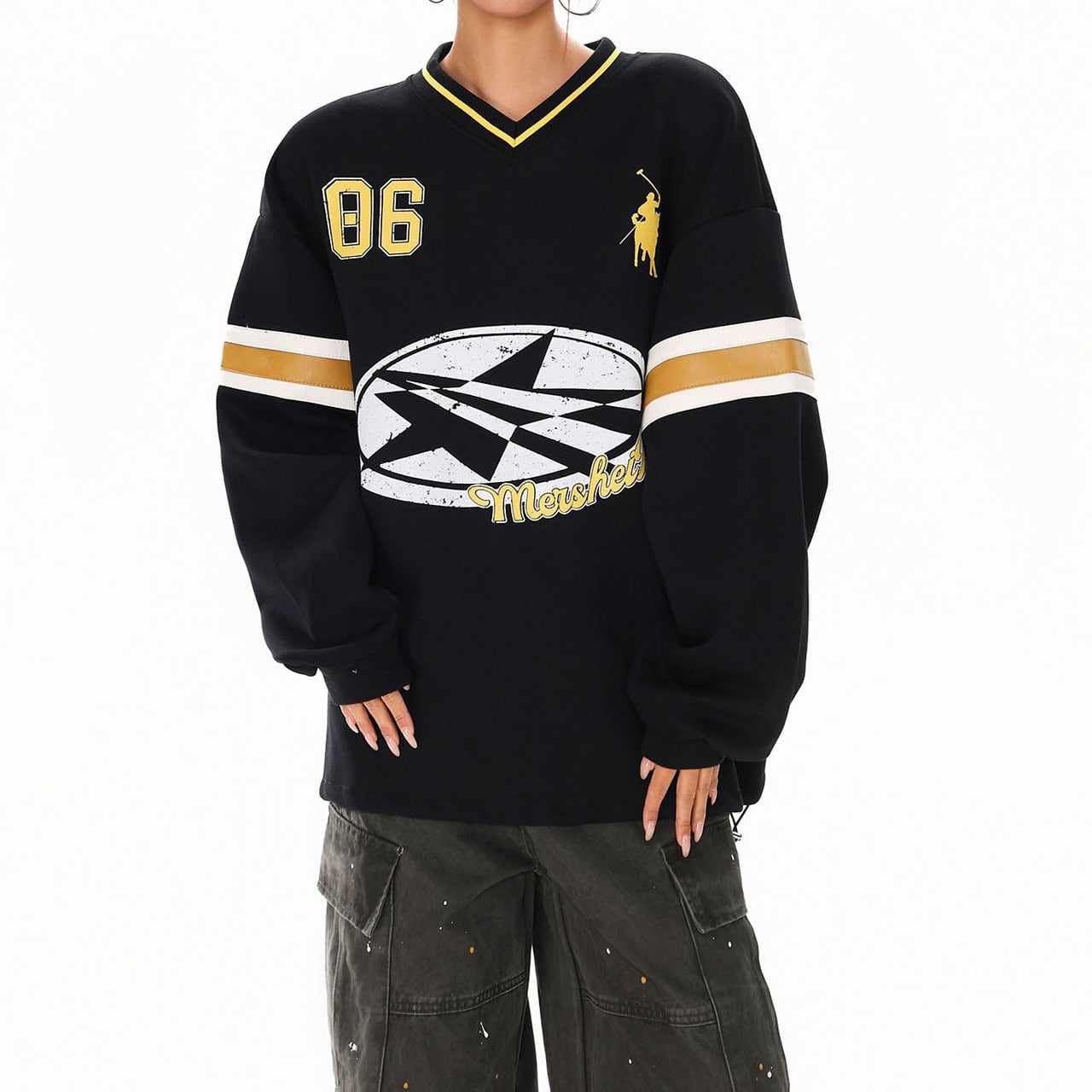 スポーティーな配色とロゴデザインが目を引く、存在感のあるトップス。