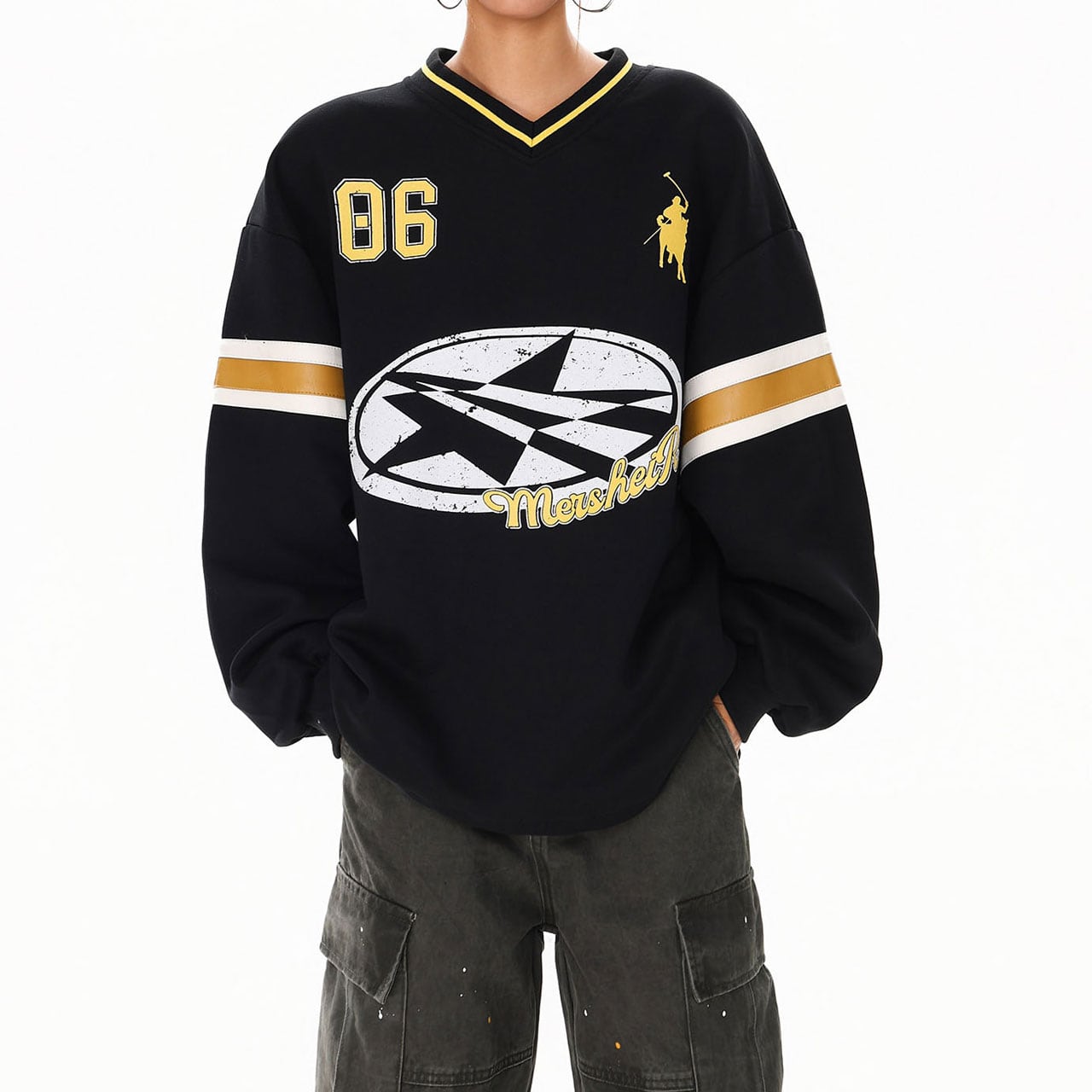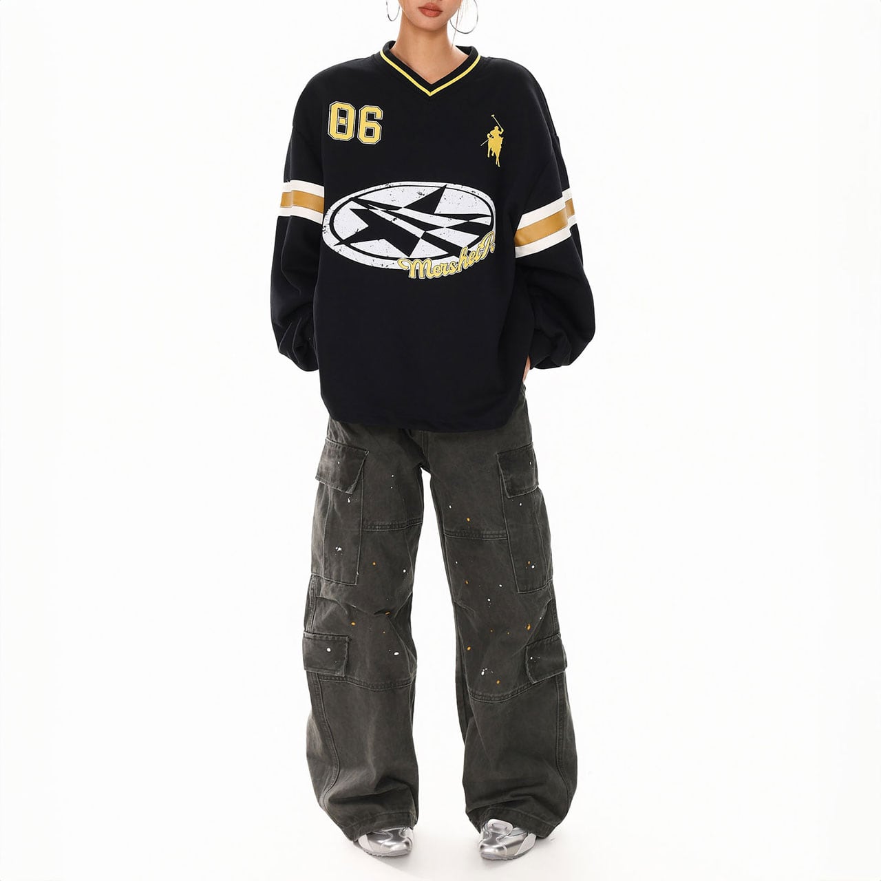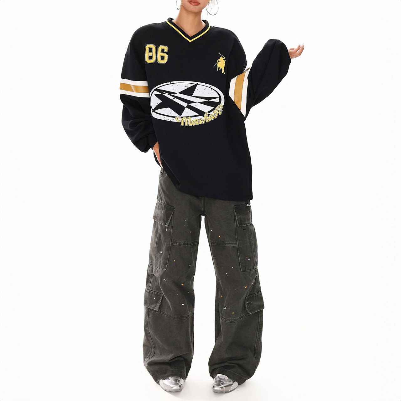 スポーティーな配色とロゴデザインが目を引く、存在感のあるトップス。