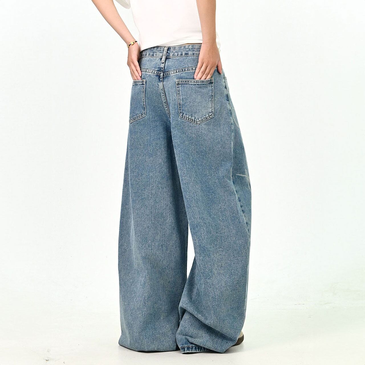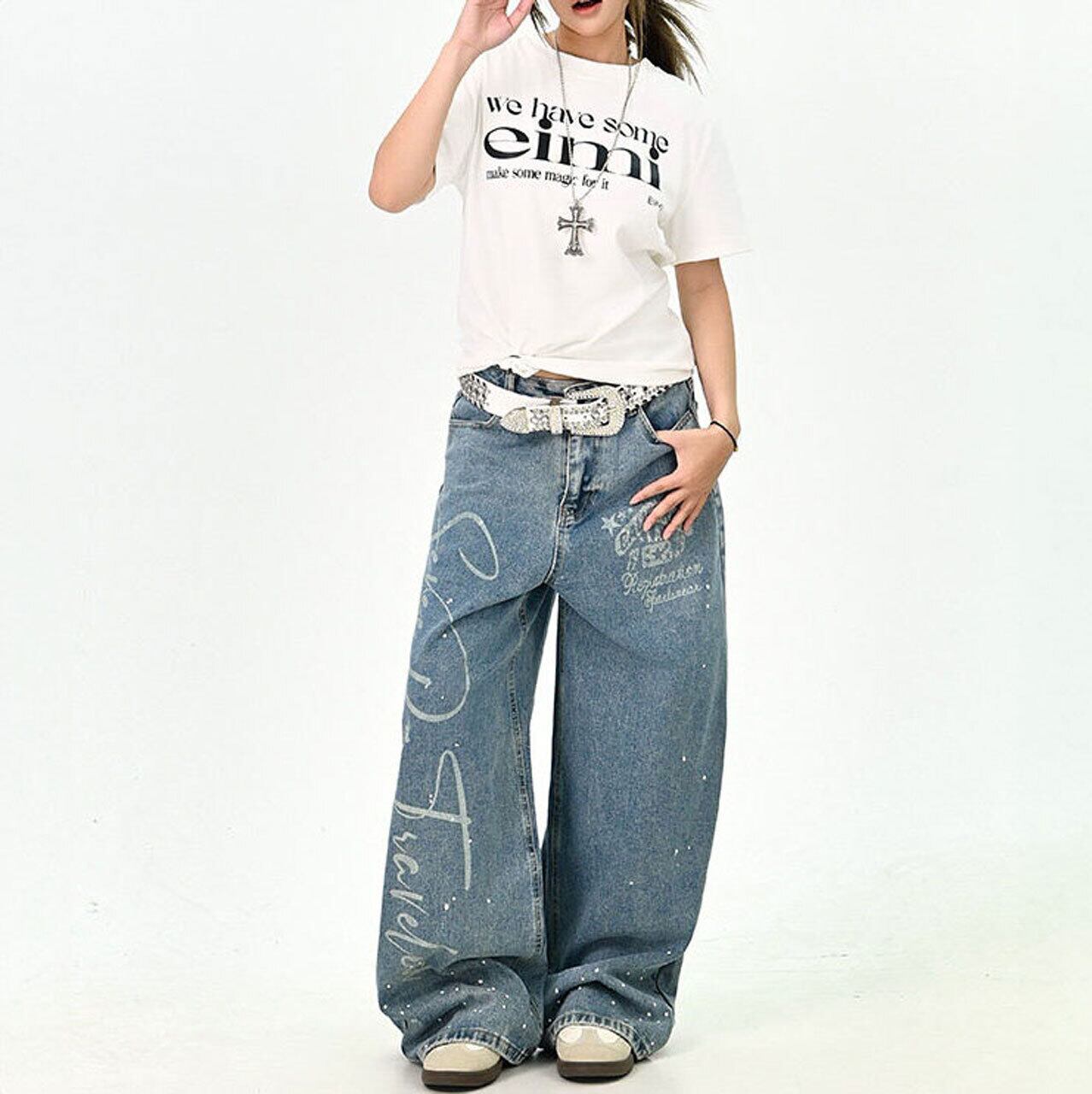 大胆なロゴプリントが目を引く、存在感たっぷりのデニムパンツ。