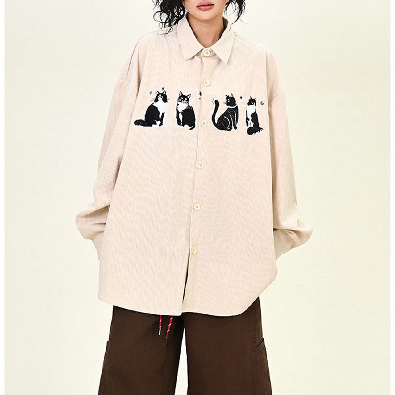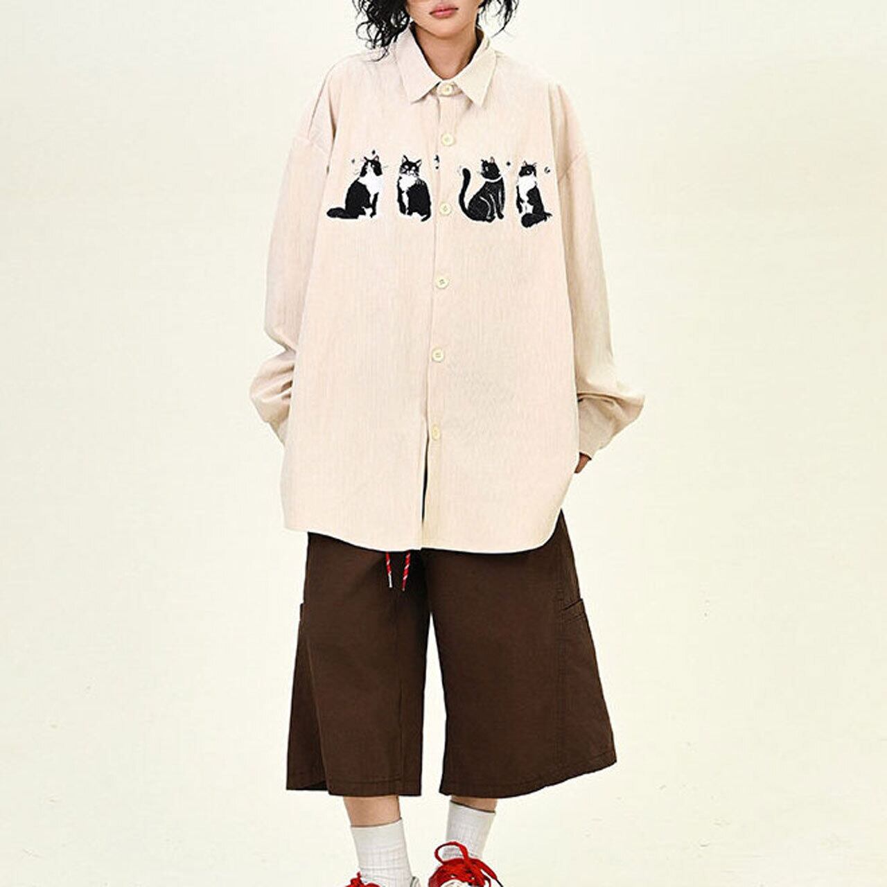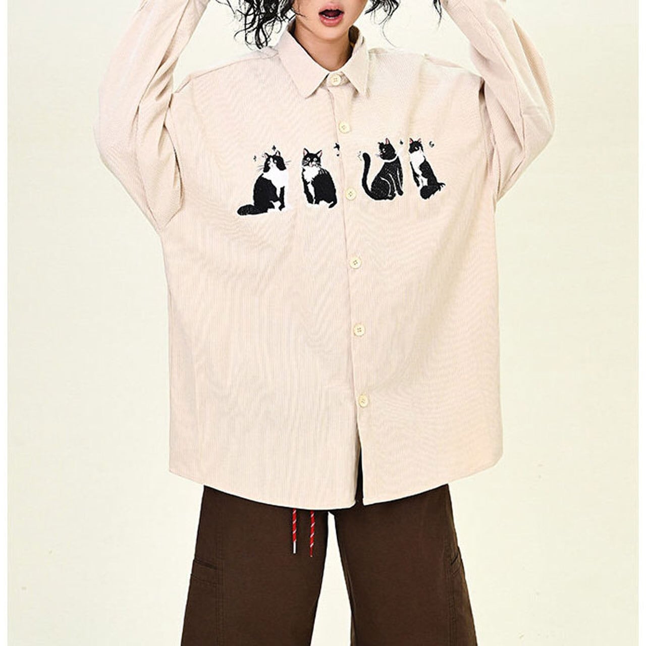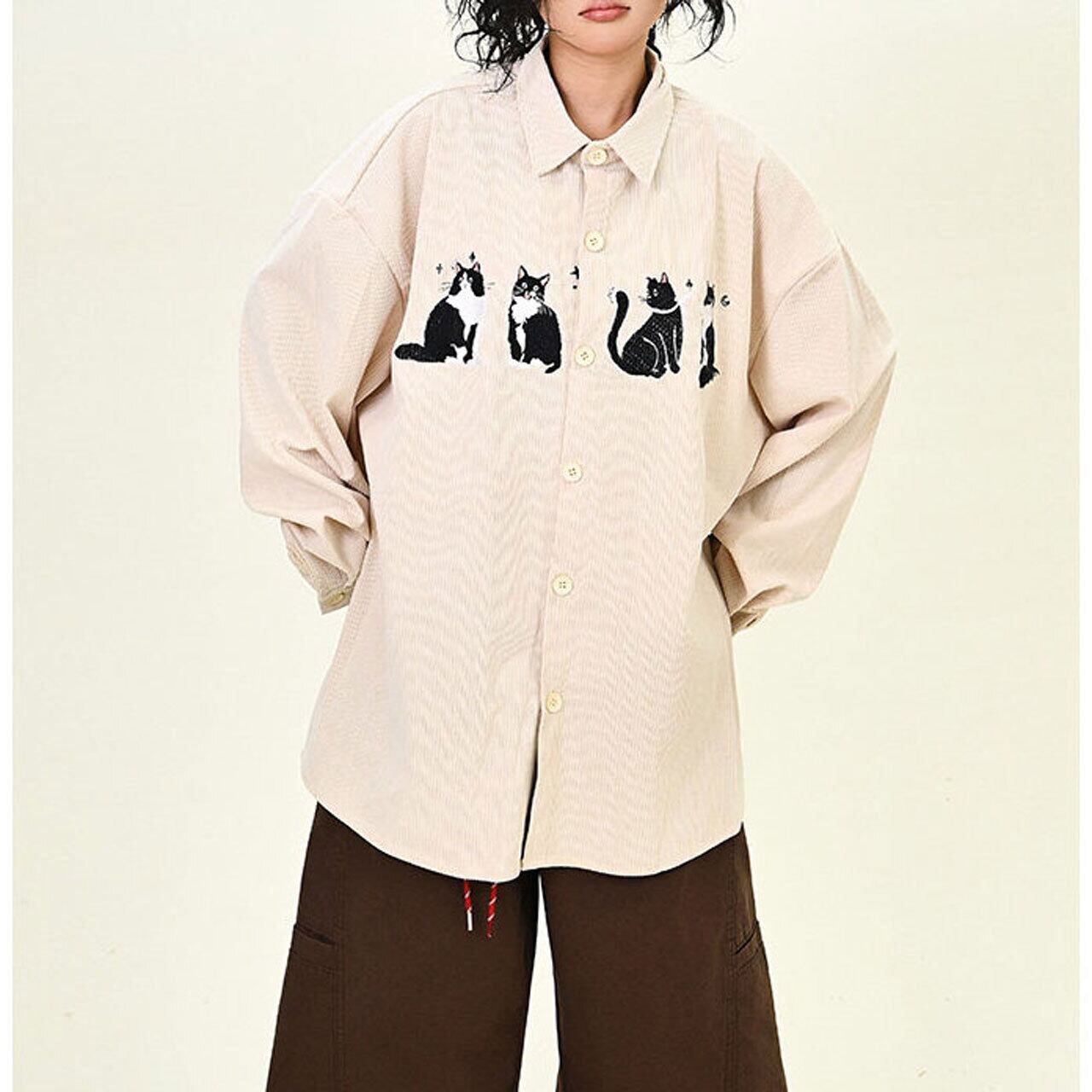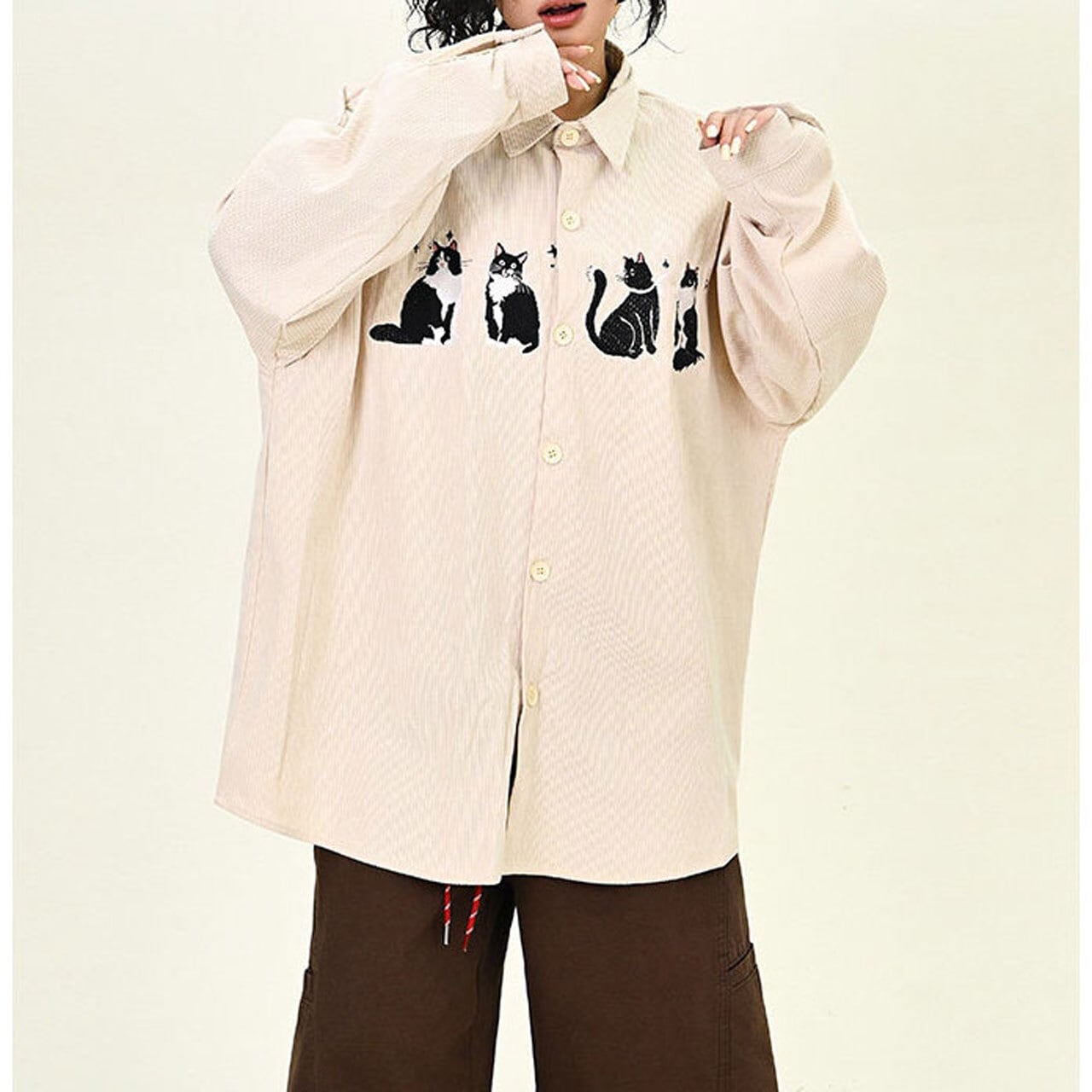 胸元に並んだキャットモチーフが目を引く、遊び心のあるシャツ。