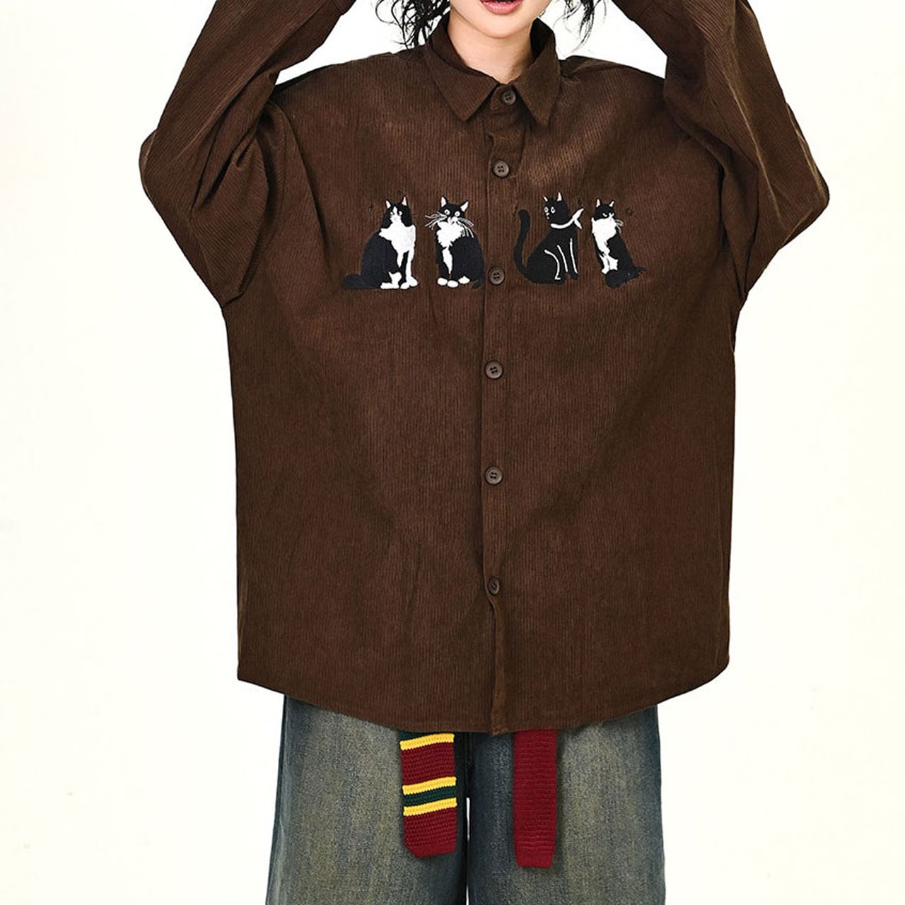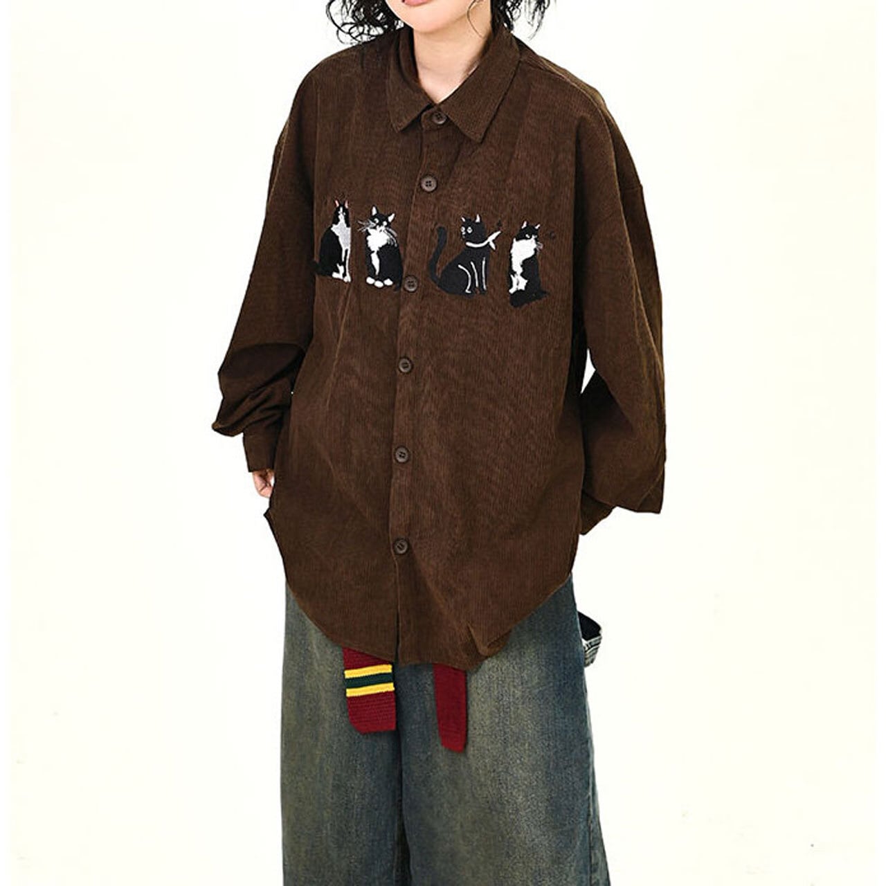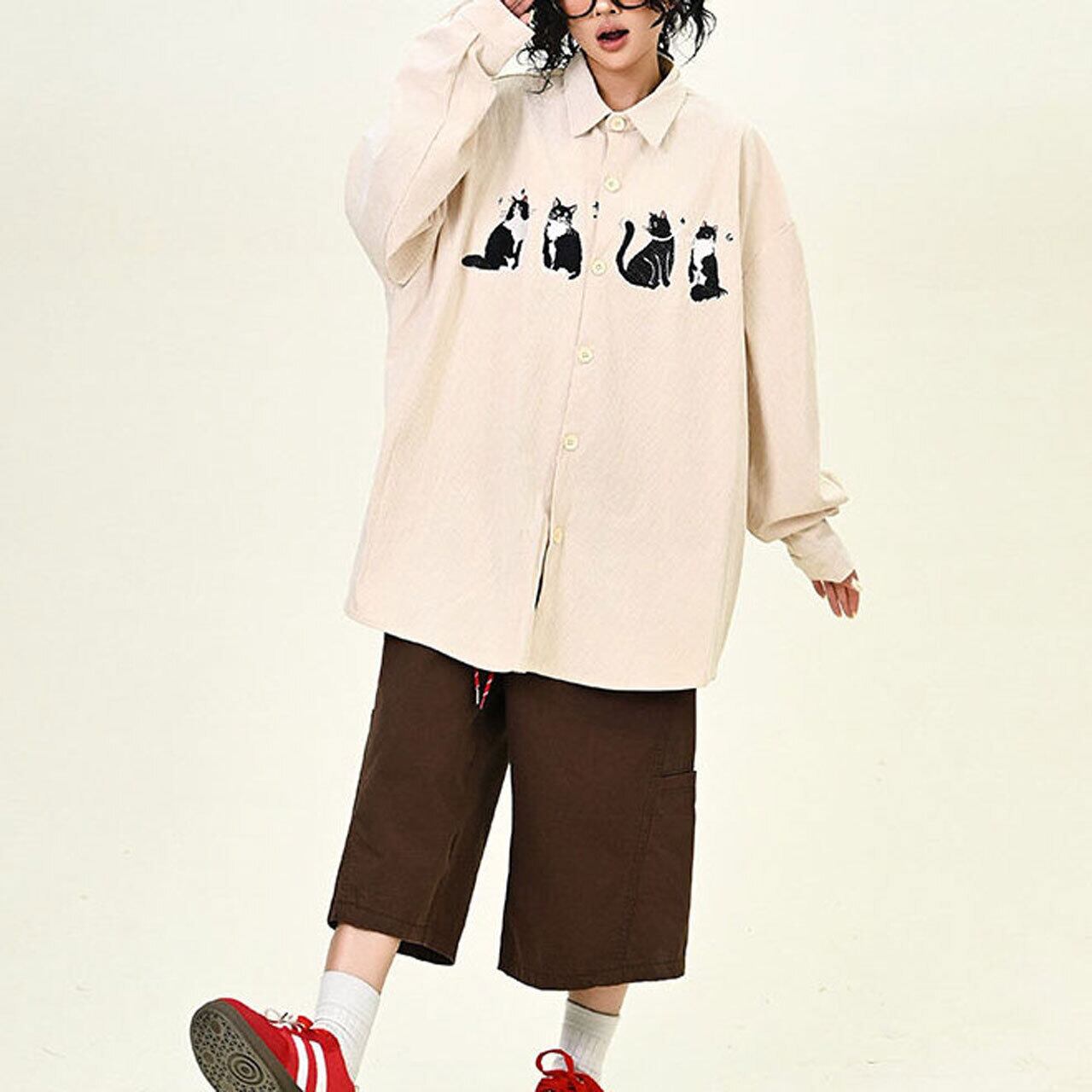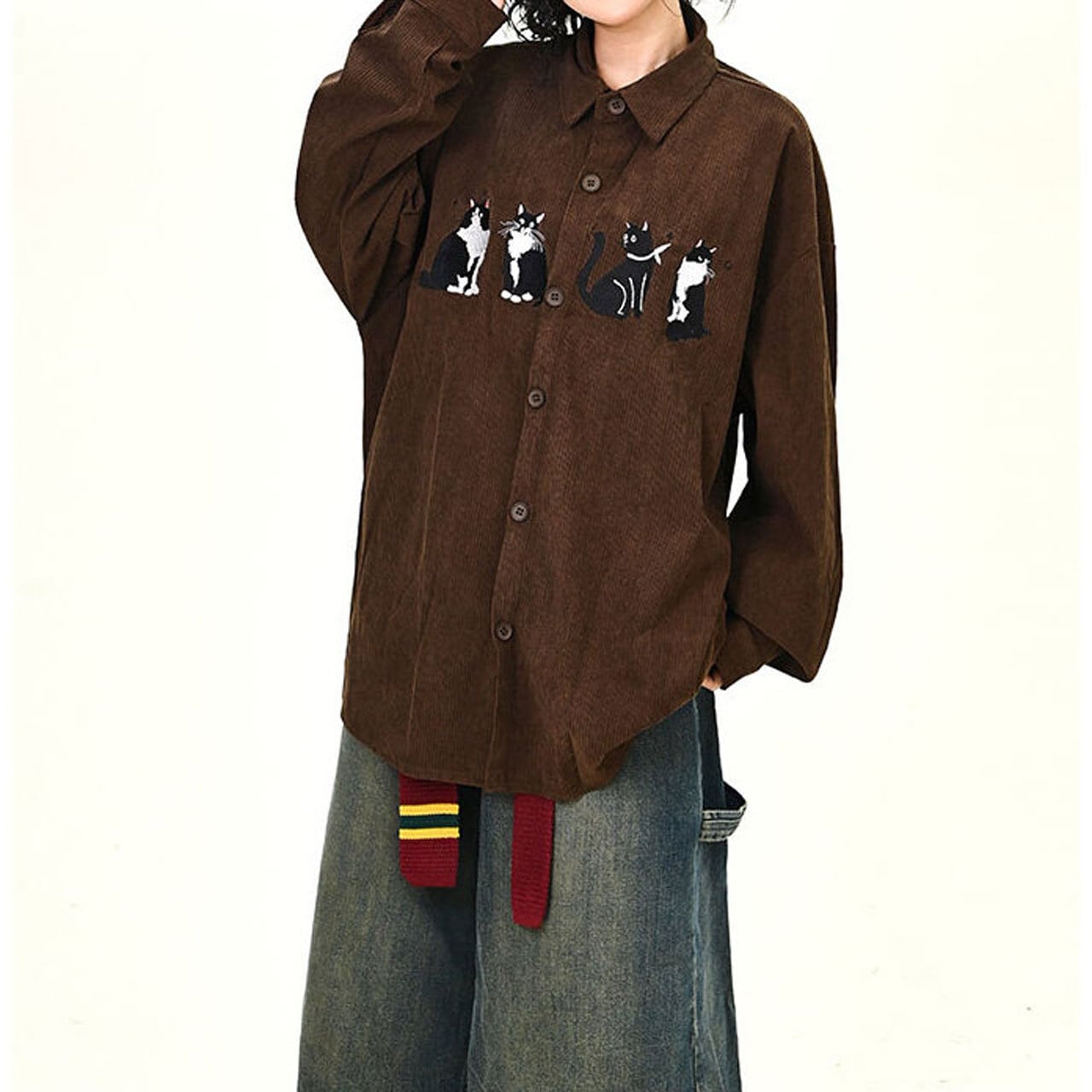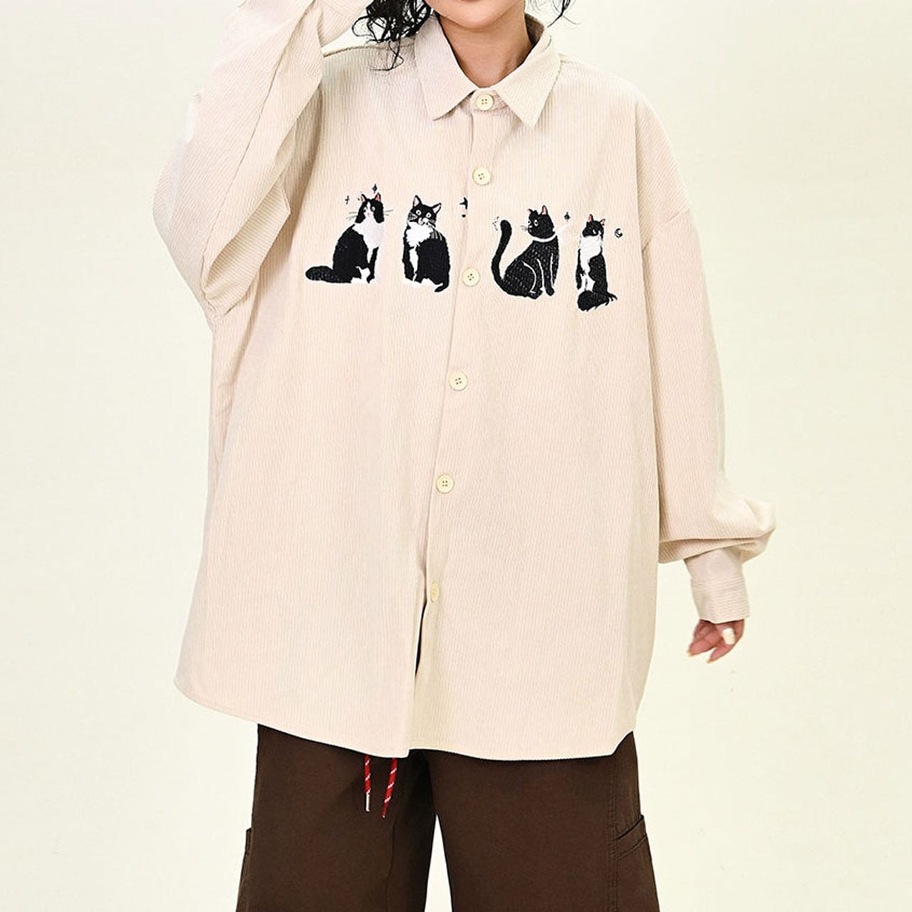 胸元に並んだキャットモチーフが目を引く、遊び心のあるシャツ。