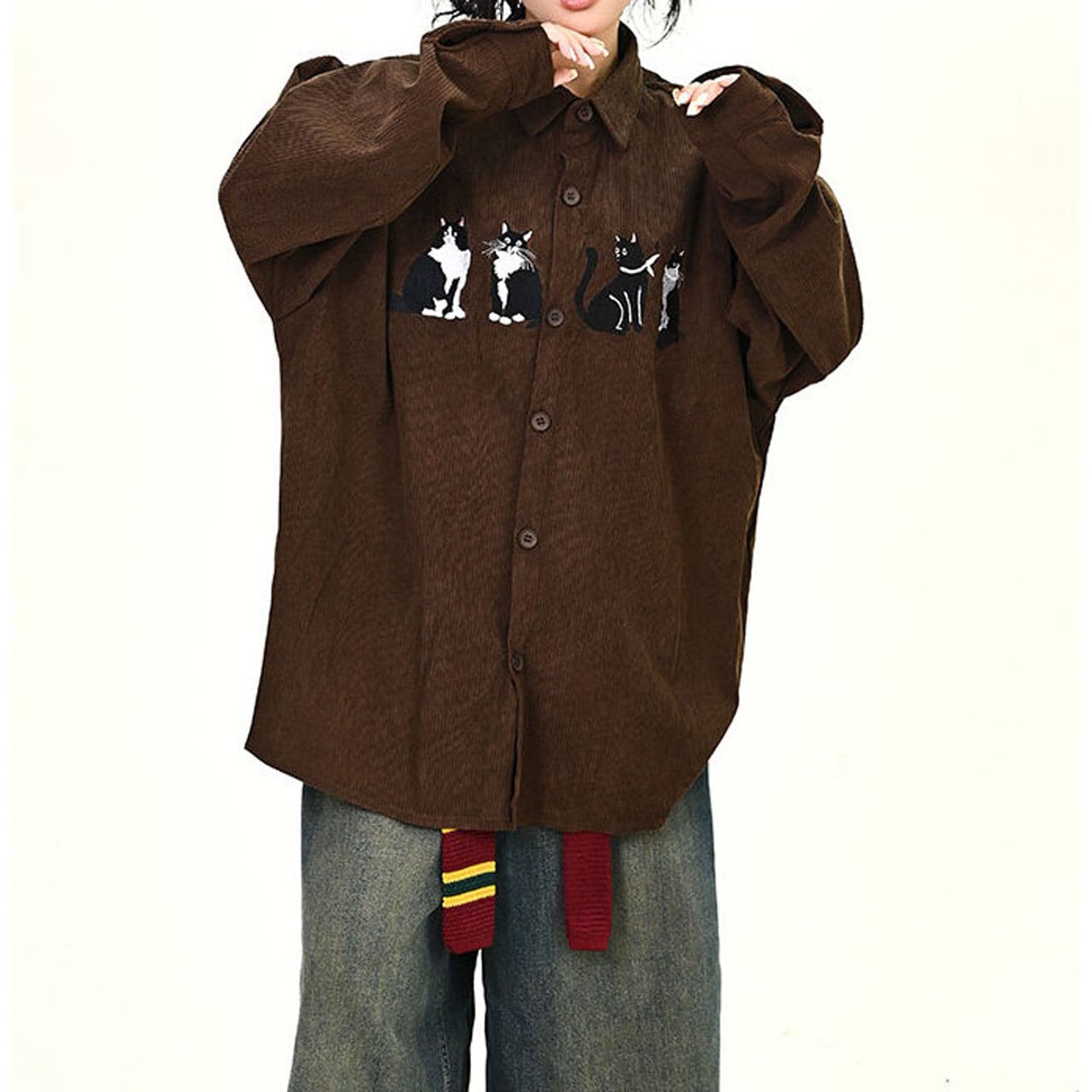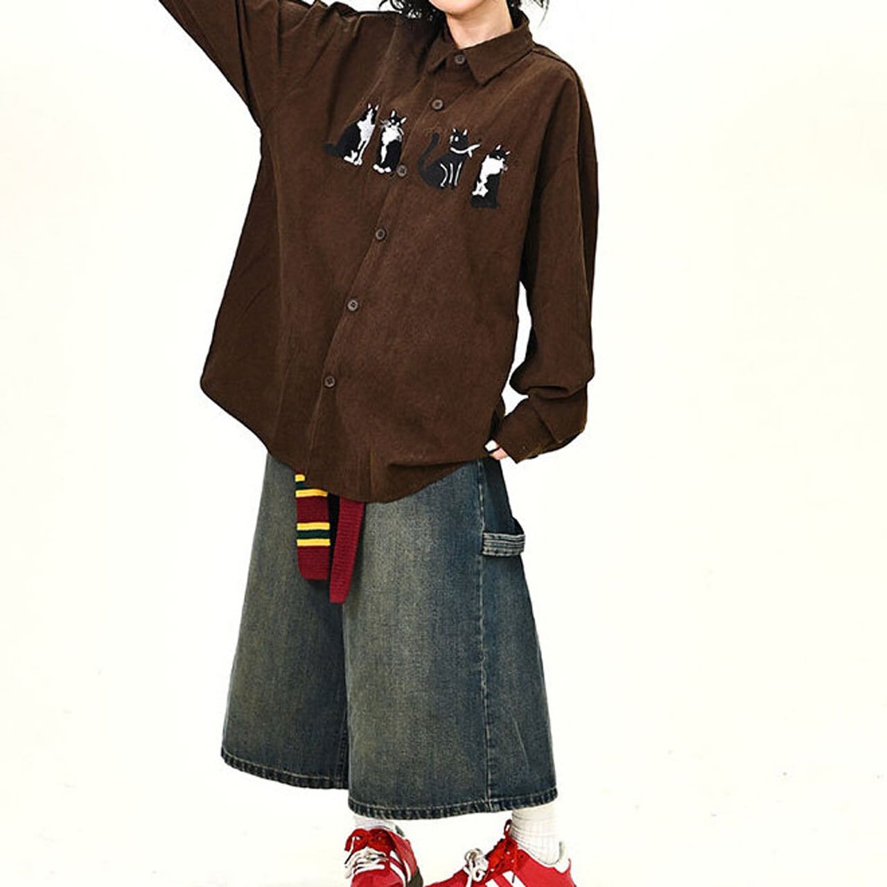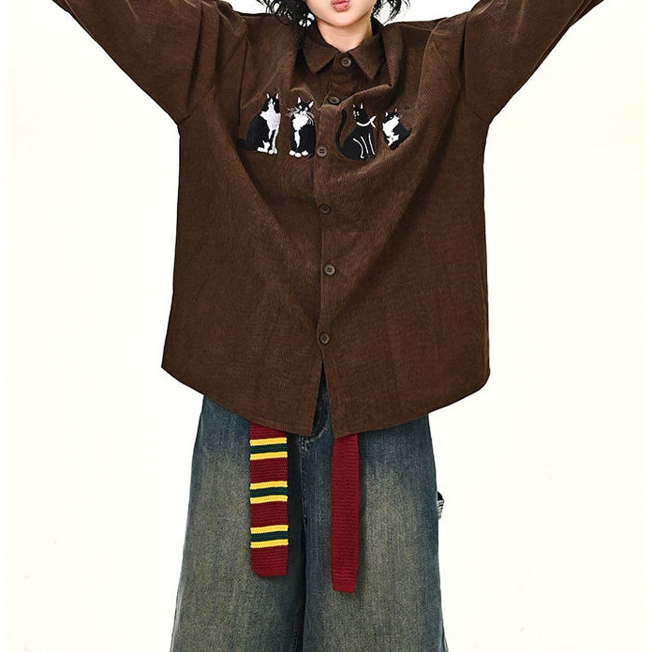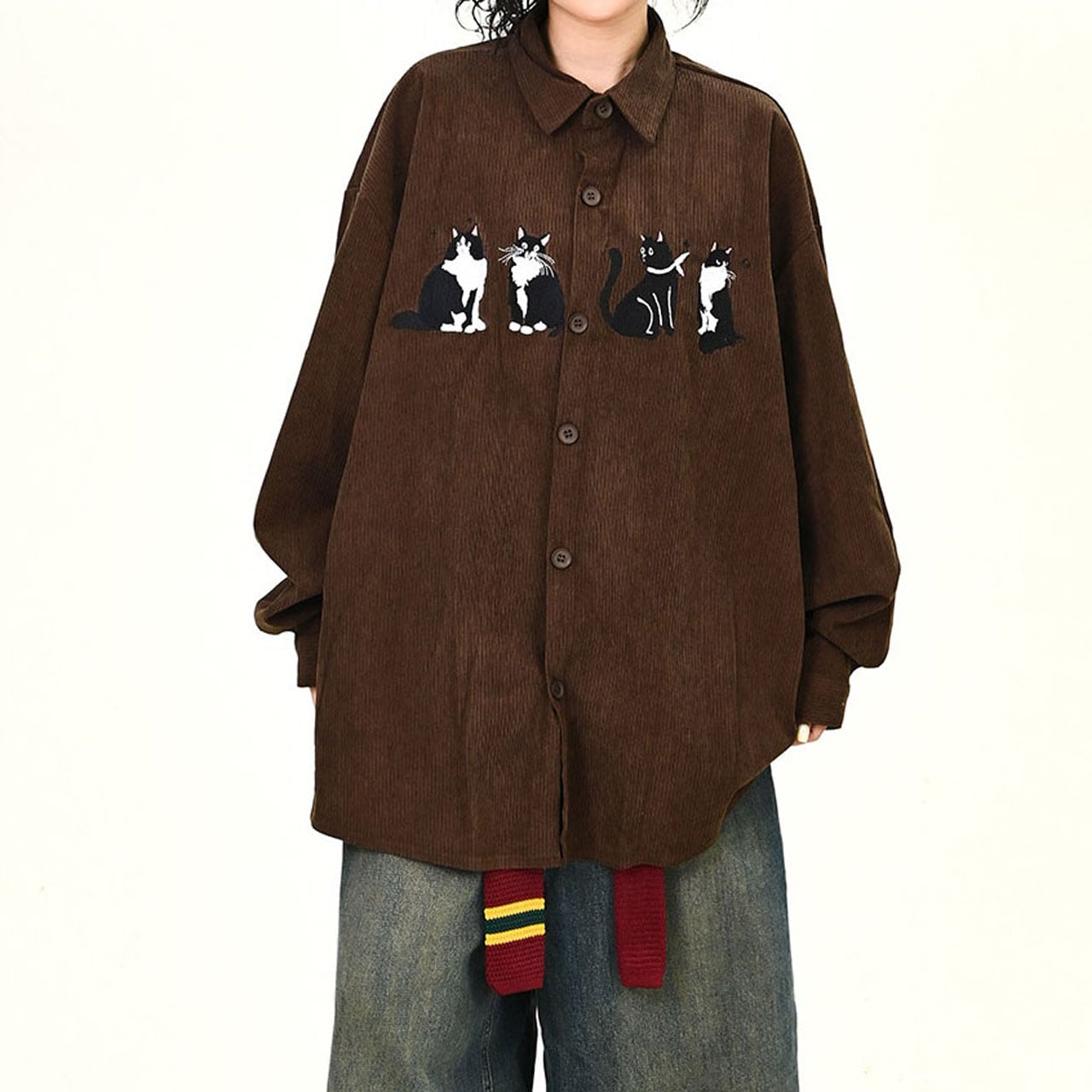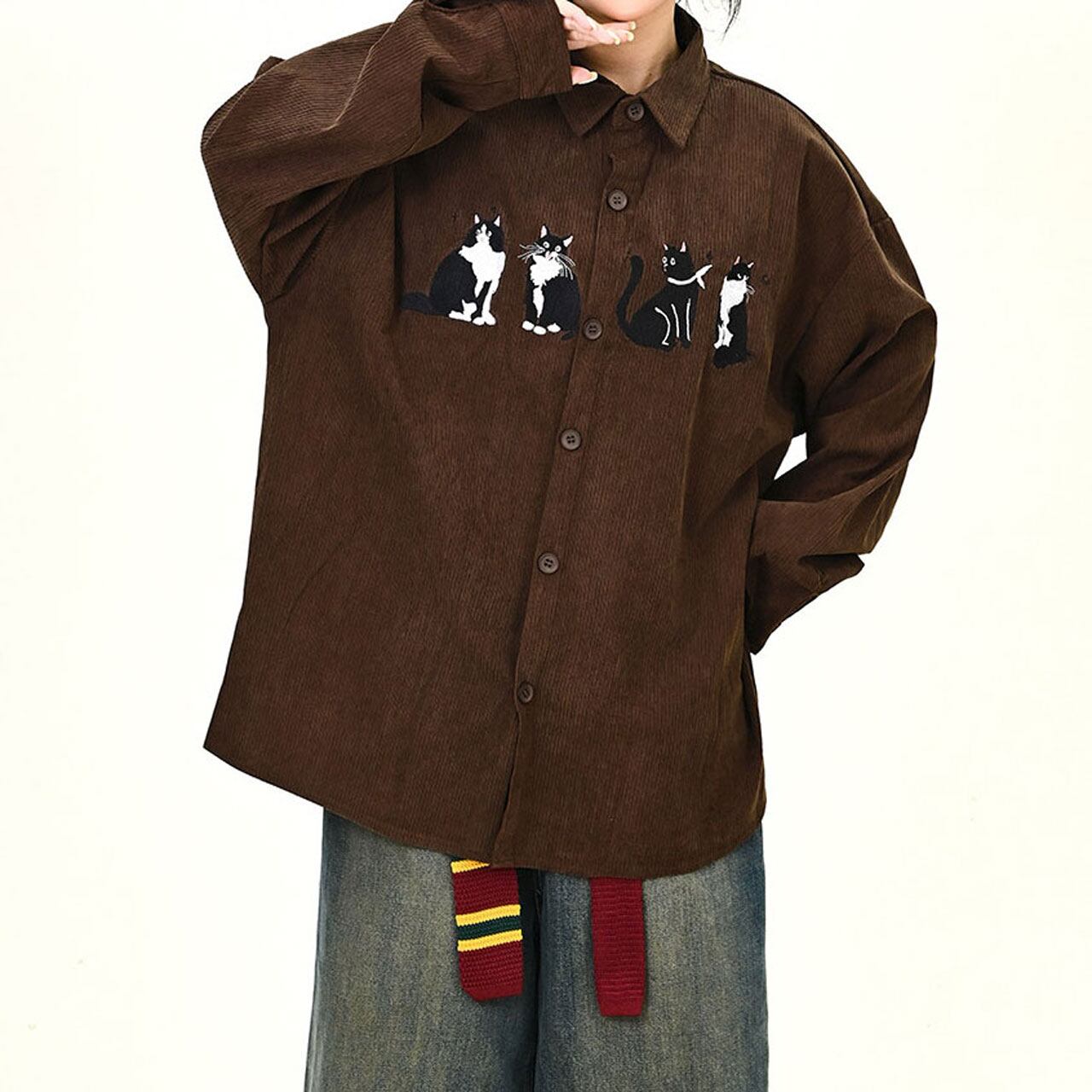 胸元に並んだキャットモチーフが目を引く、遊び心のあるシャツ。