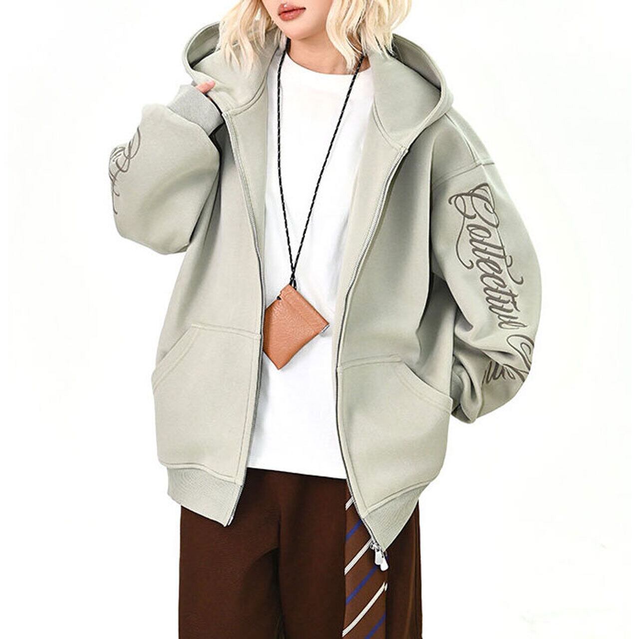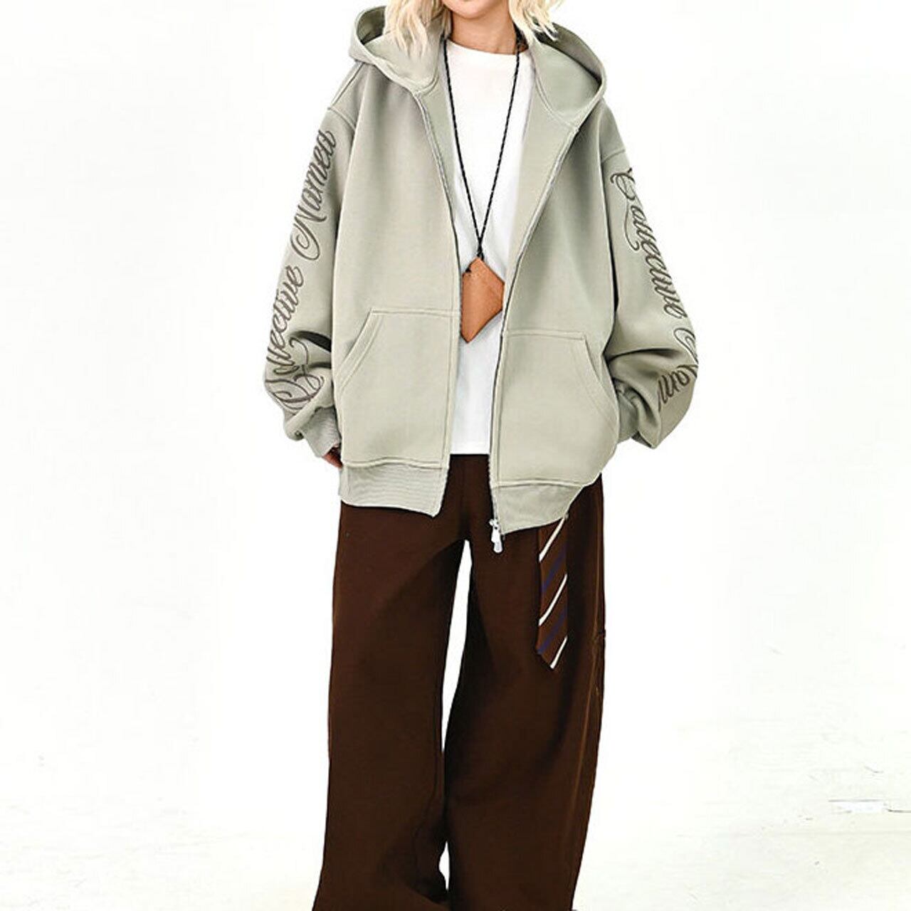 袖に施したレタリングが印象的な、シンプルながら存在感のあるジップパーカー。