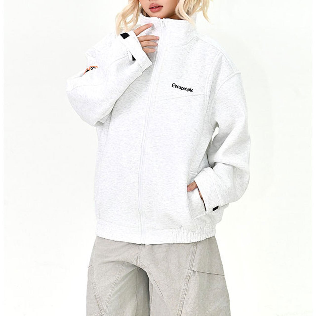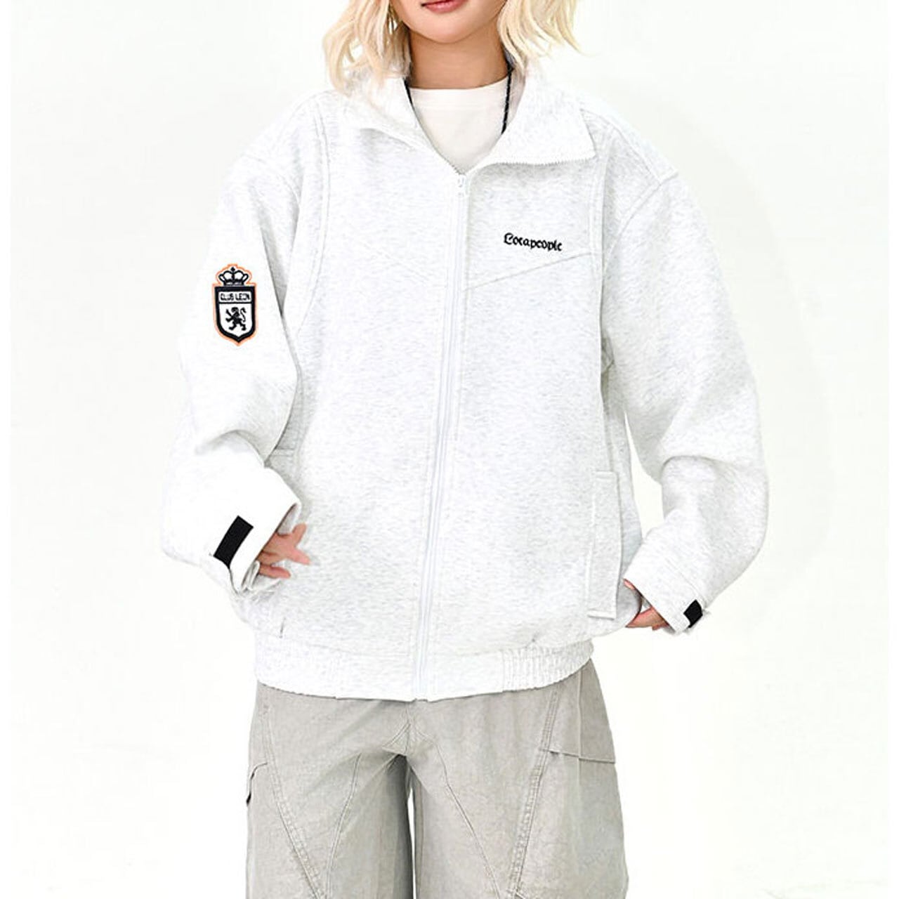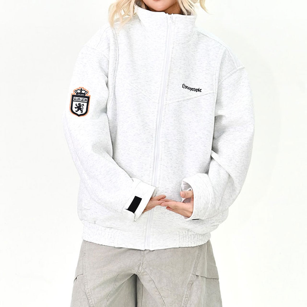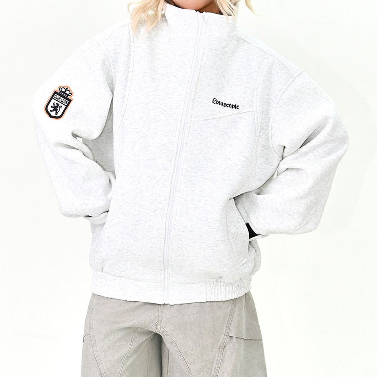 胸元のロゴと袖のワッペンがアクセントになった、スポーティーなジップブルゾン。
