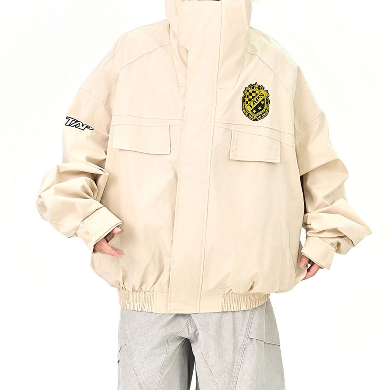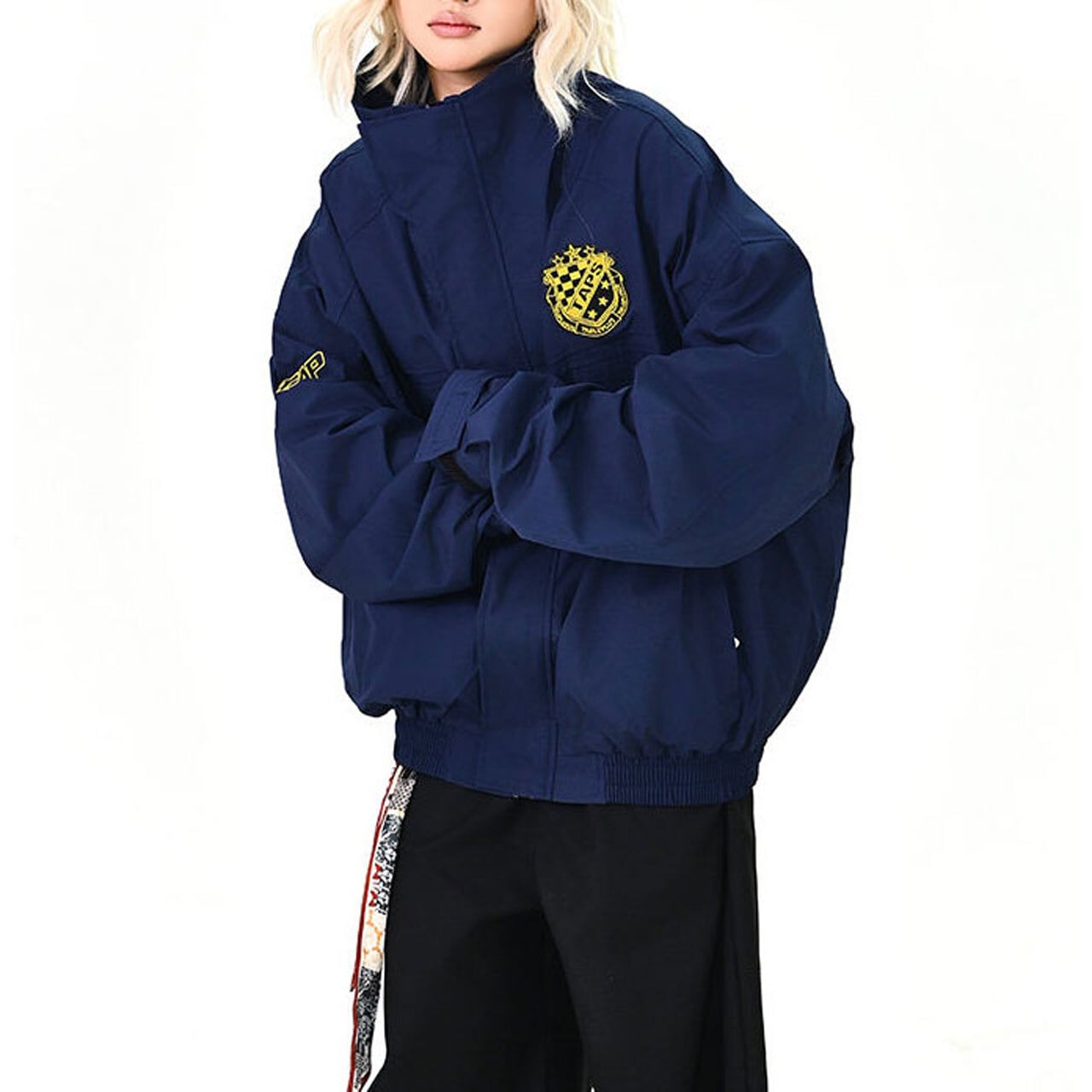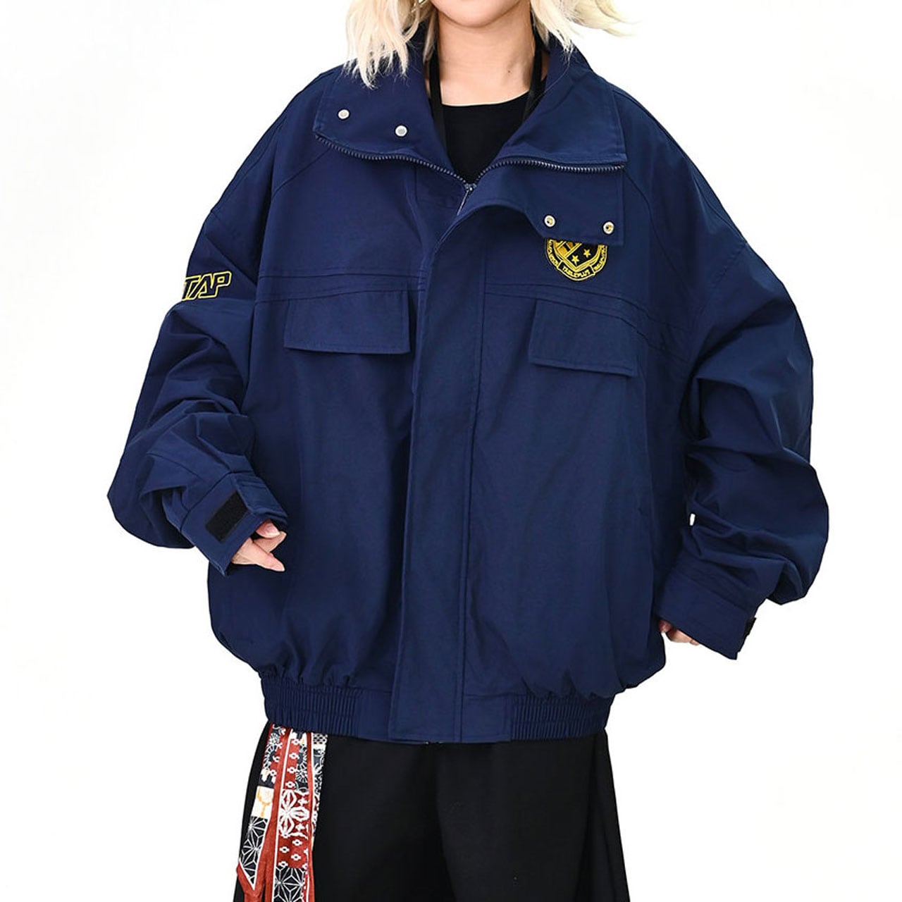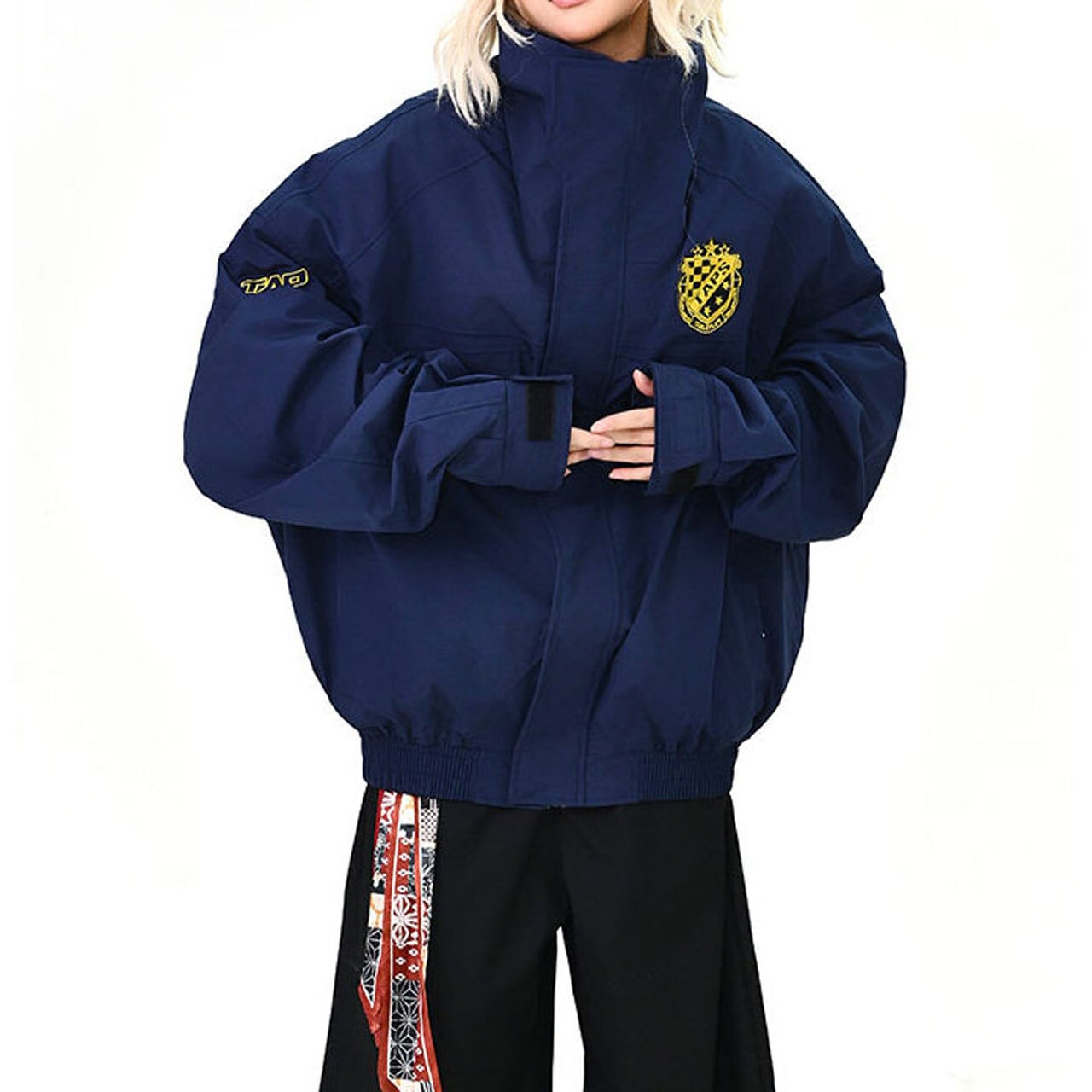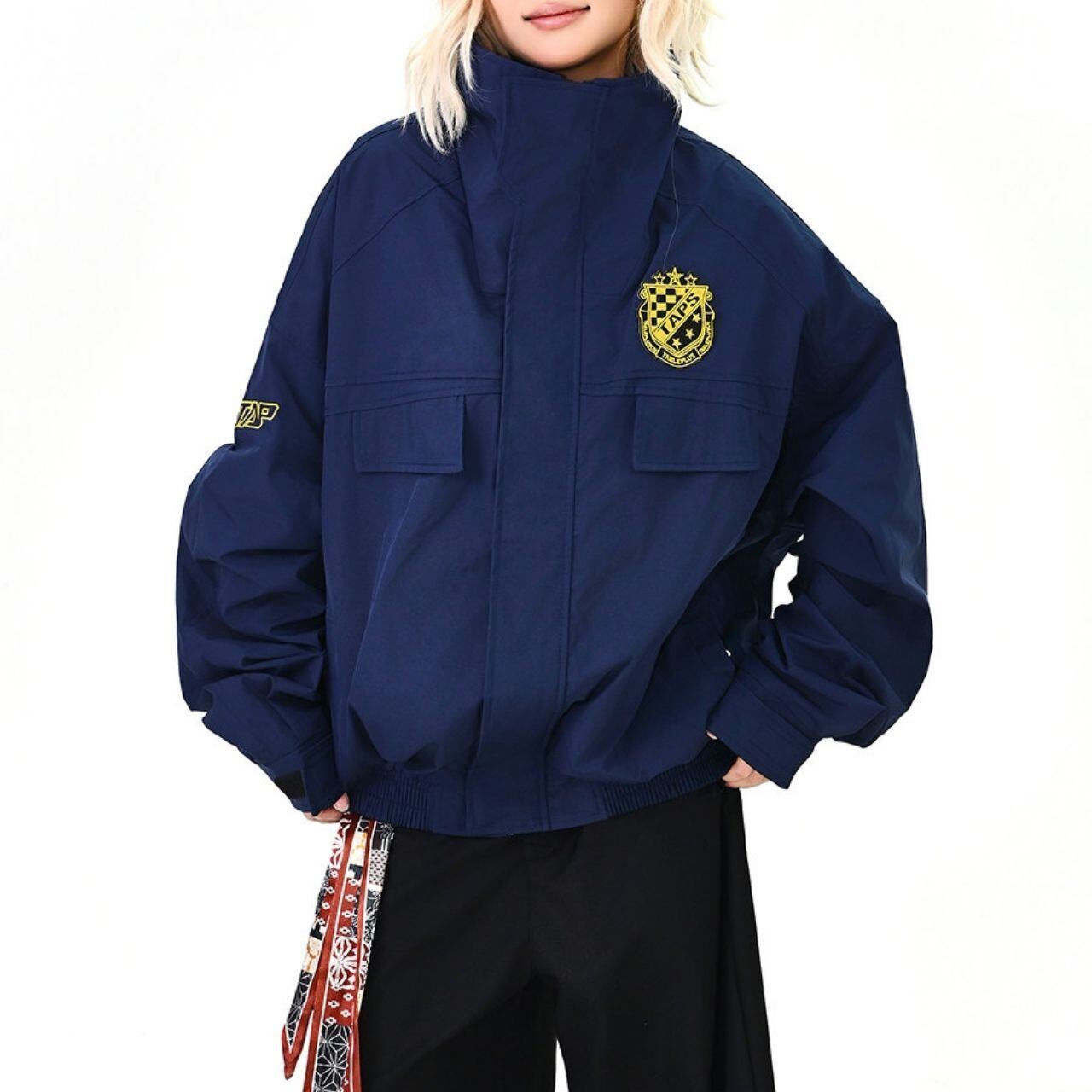 エンブレムデザインが映える、存在感たっぷりのスタンドカラーブルゾン。
