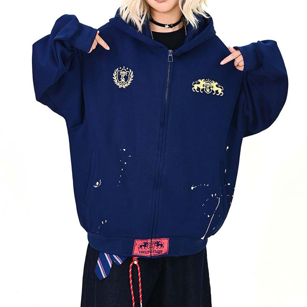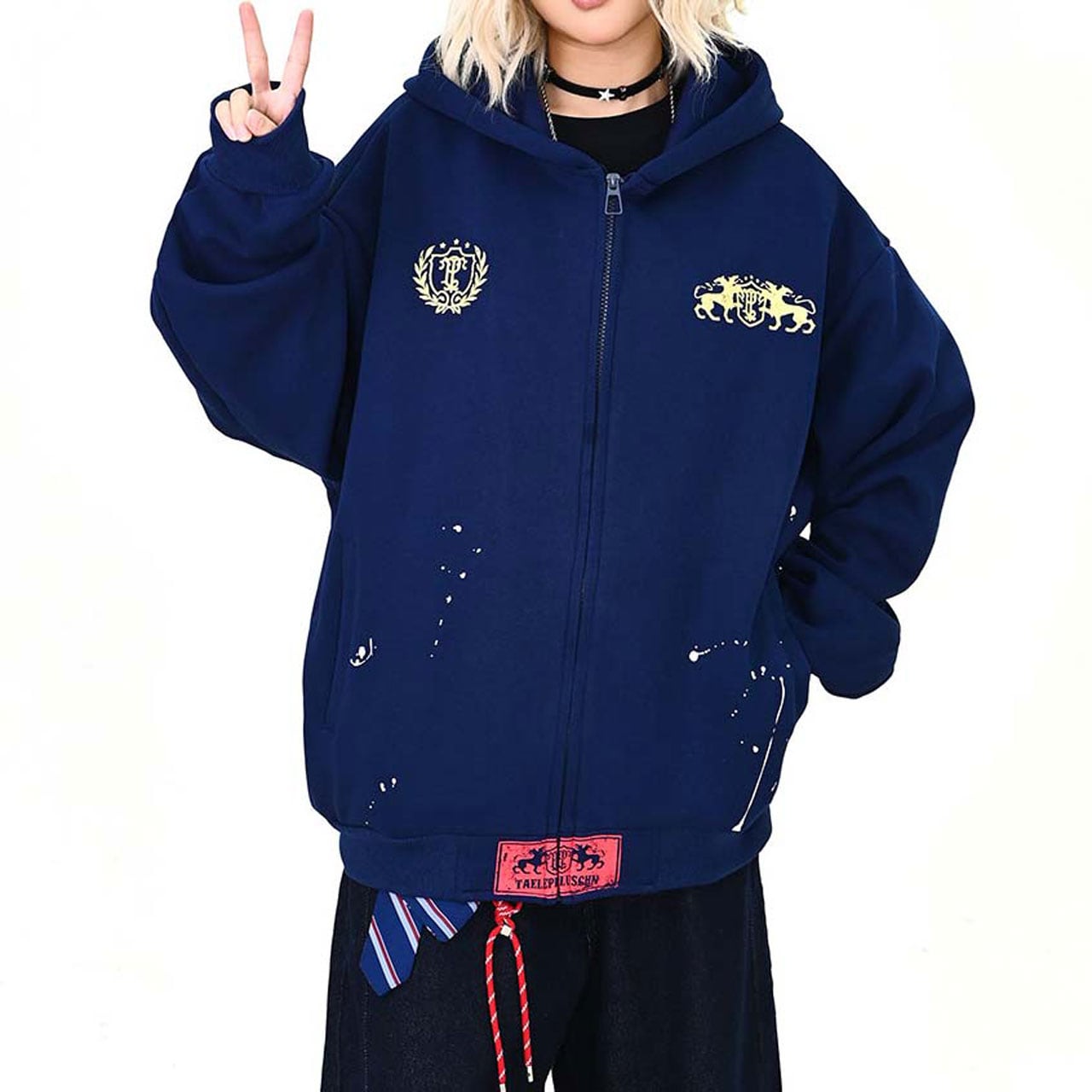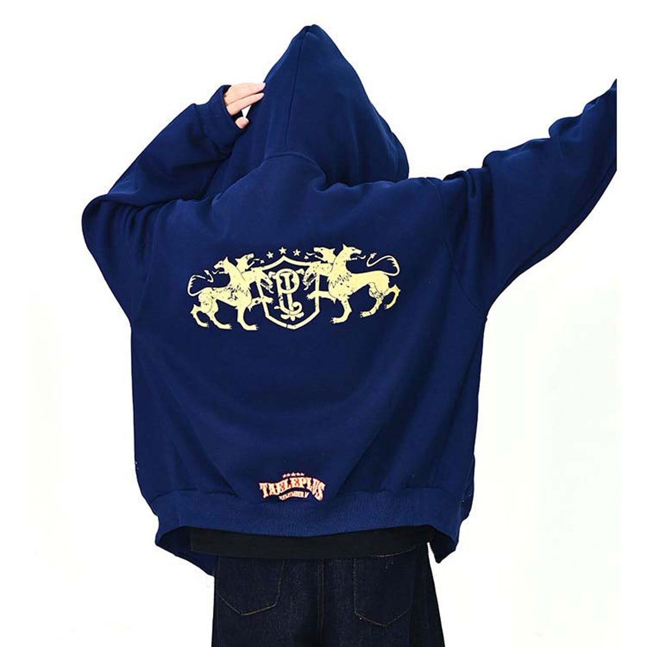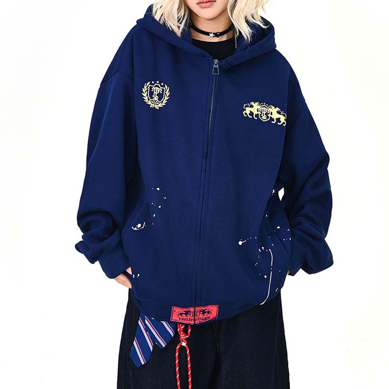 フロントのエンブレム風プリントが、さりげなく主張するジップパーカー。