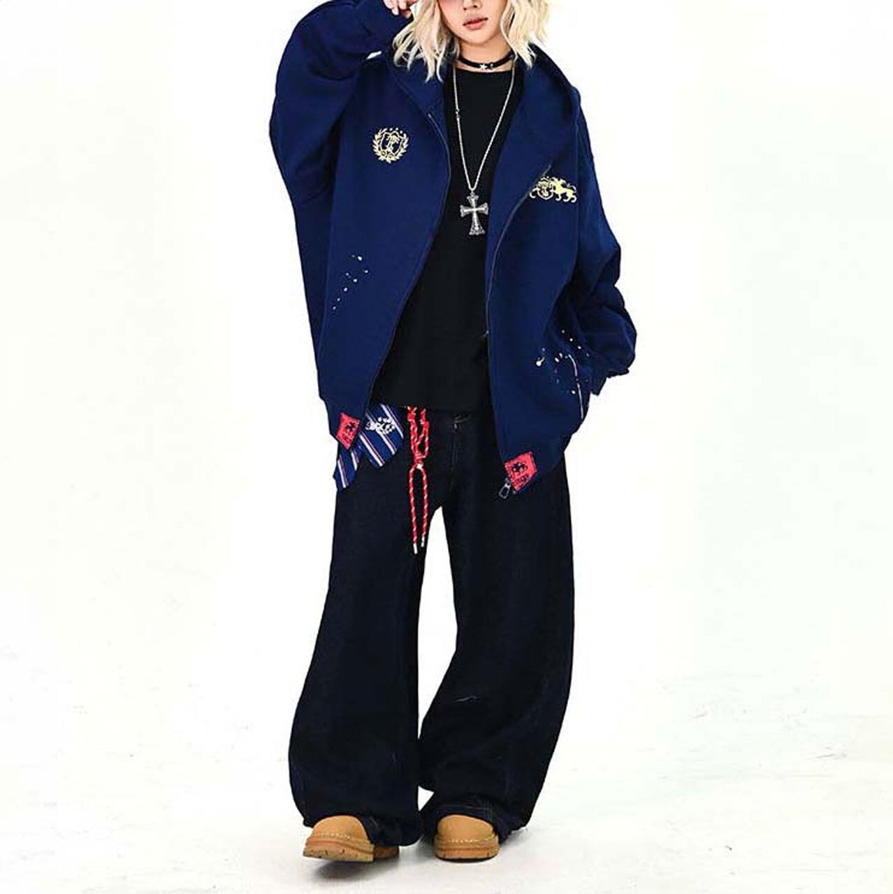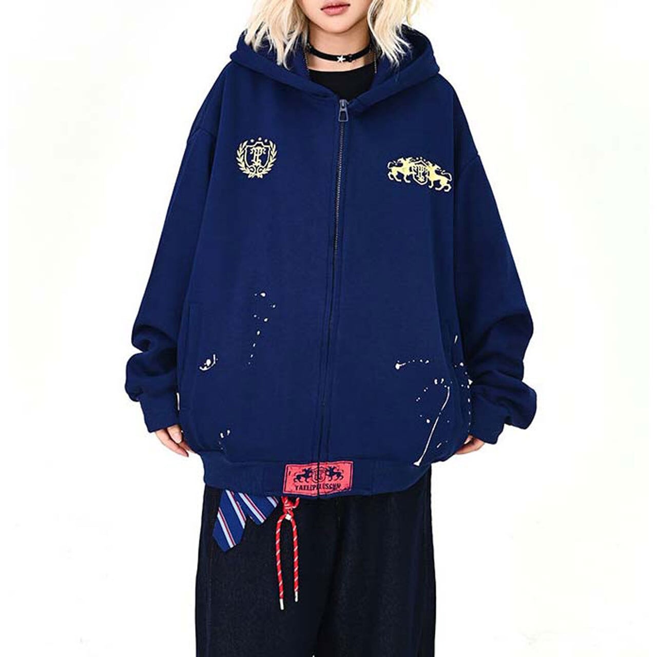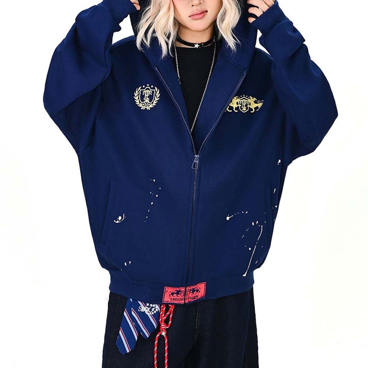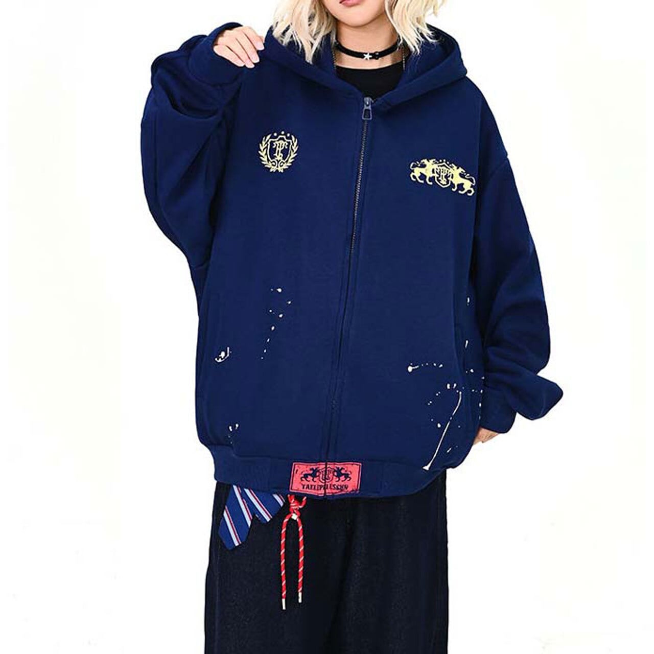 フロントのエンブレム風プリントが、さりげなく主張するジップパーカー。