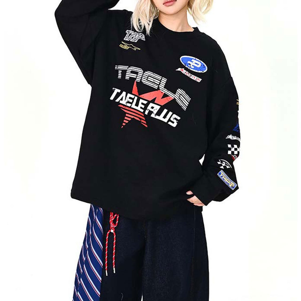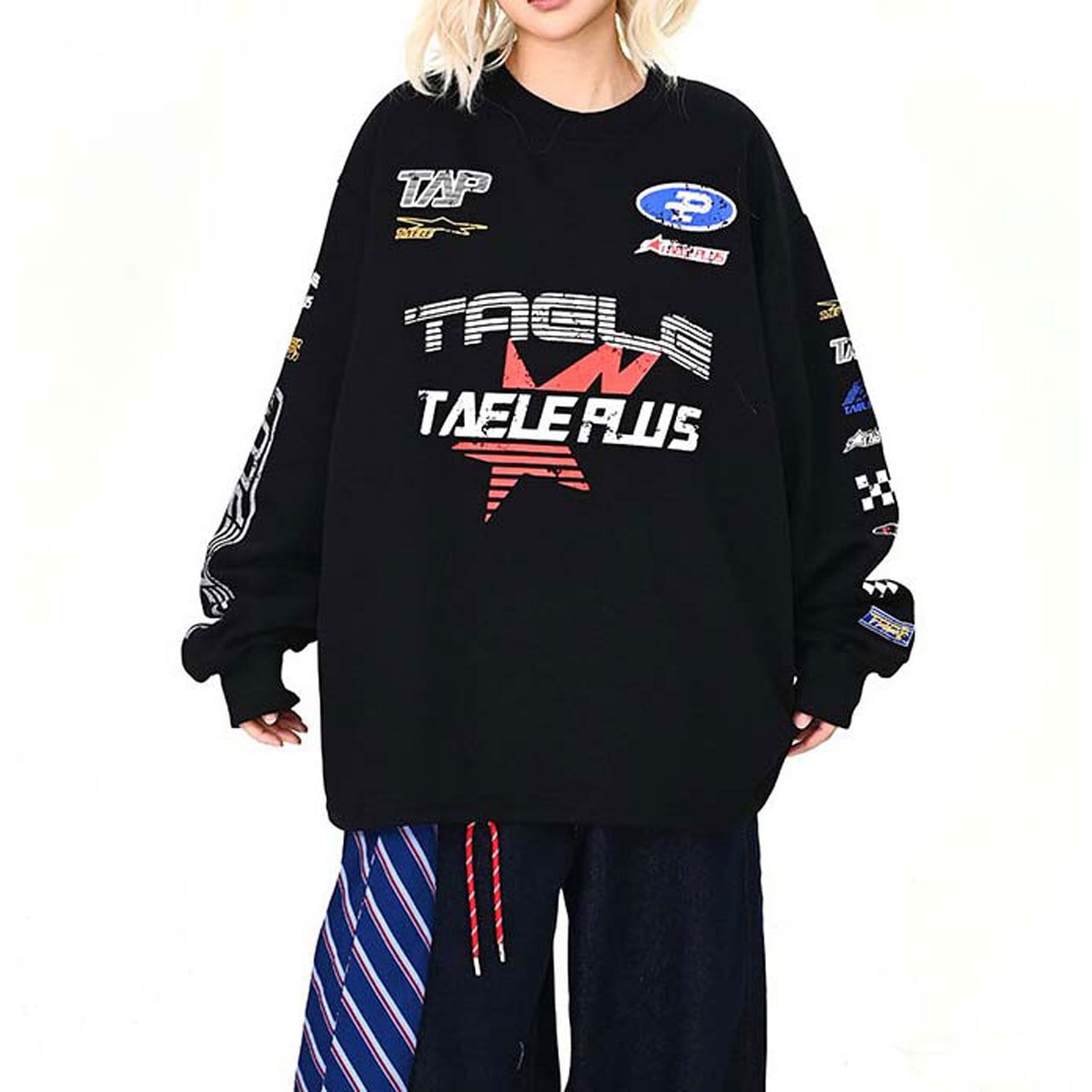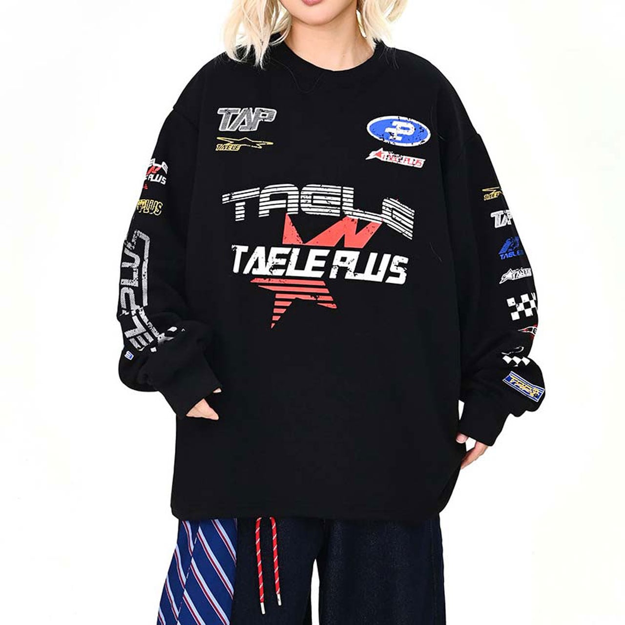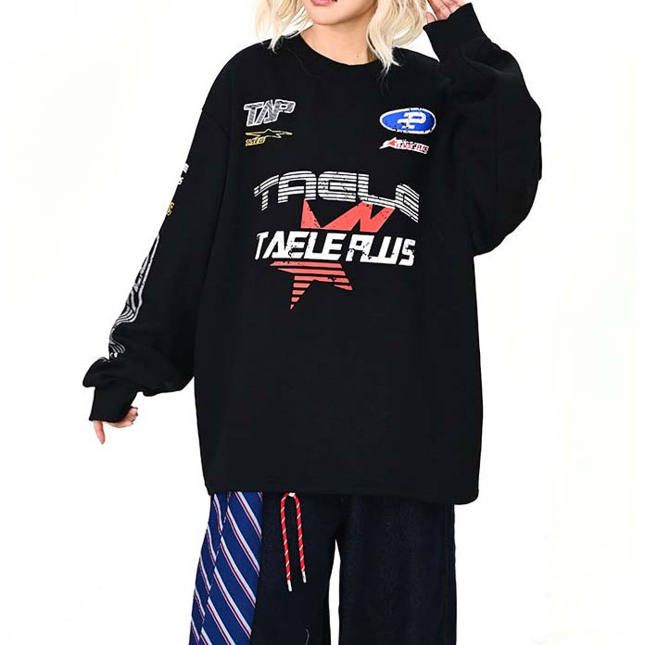 フロントに散りばめたグラフィックが視線を集める主役トップス。