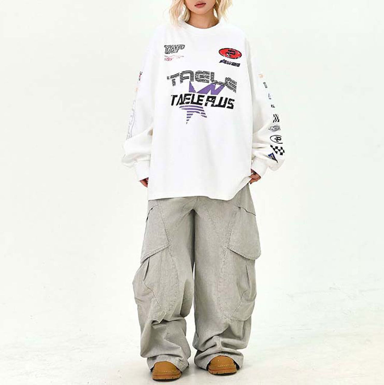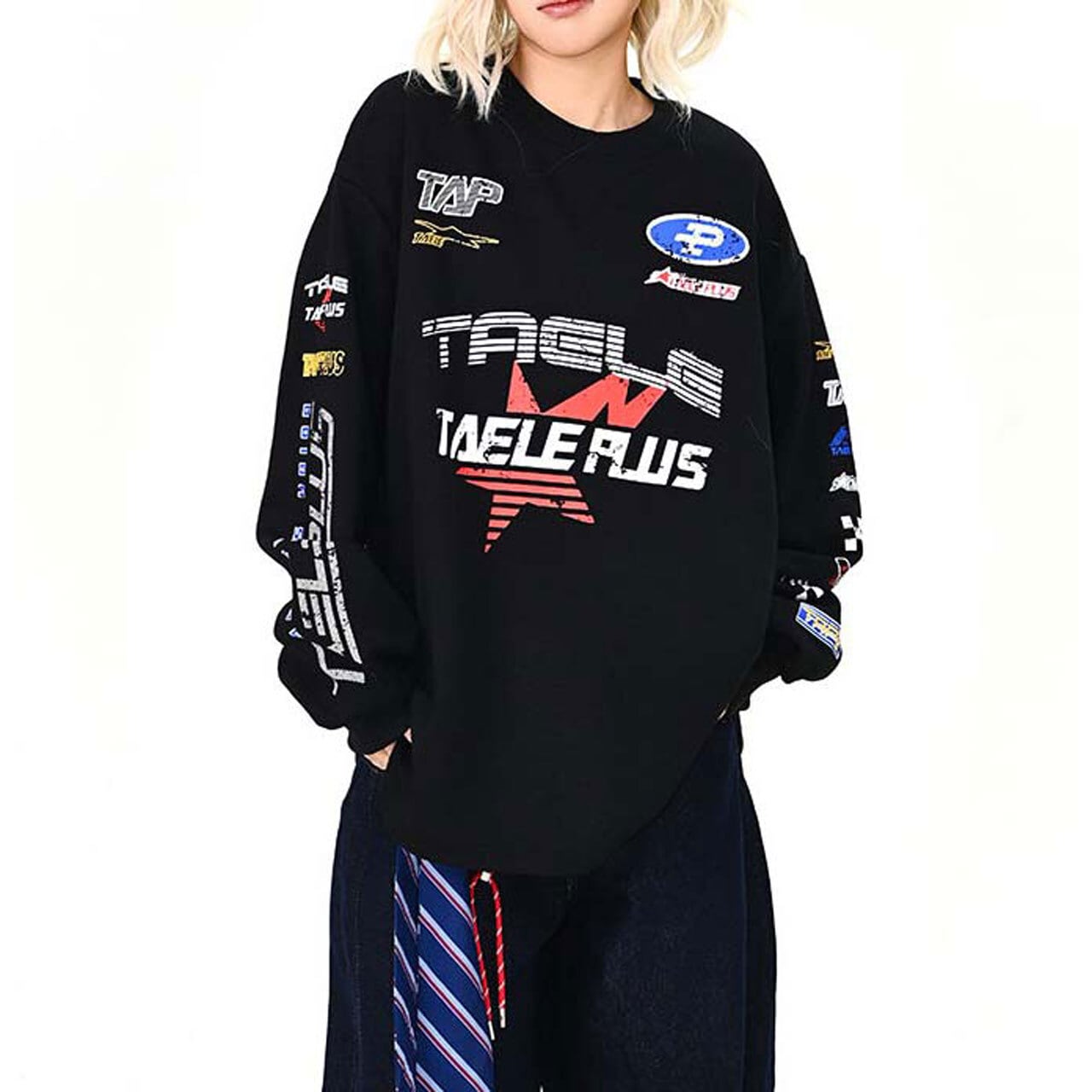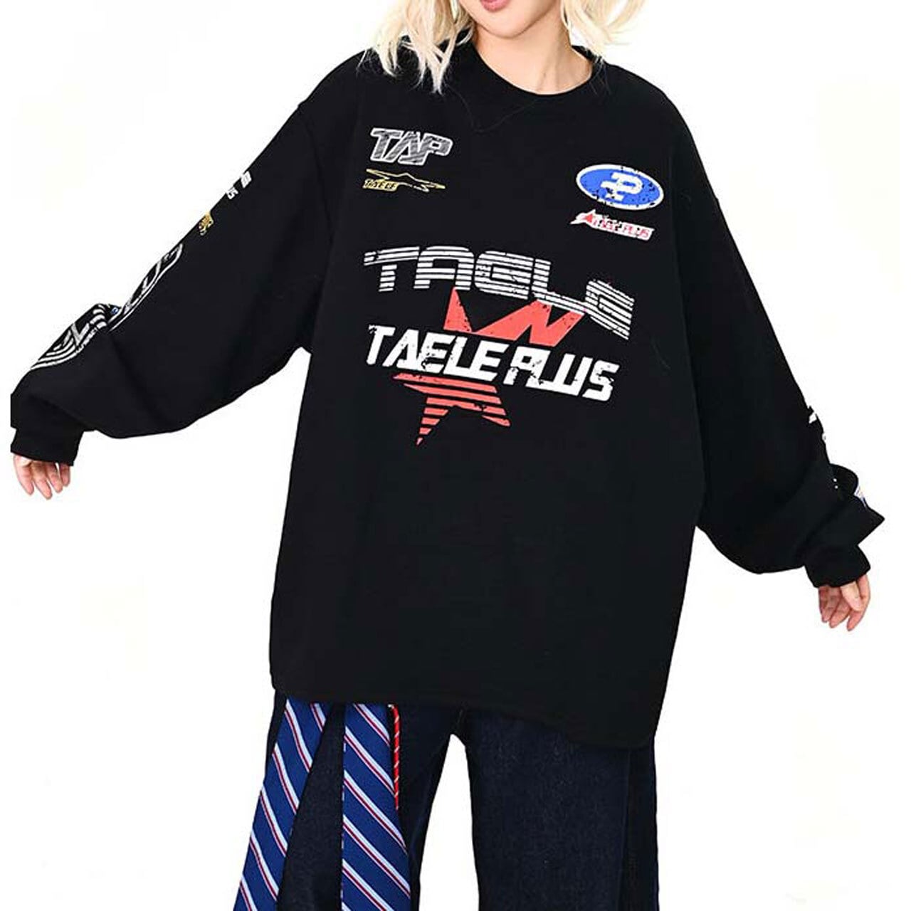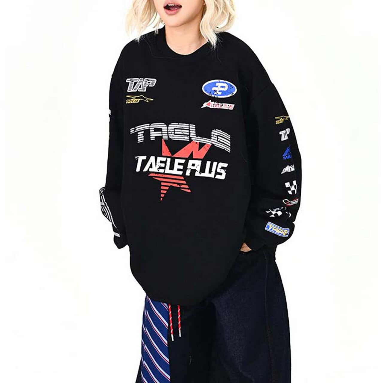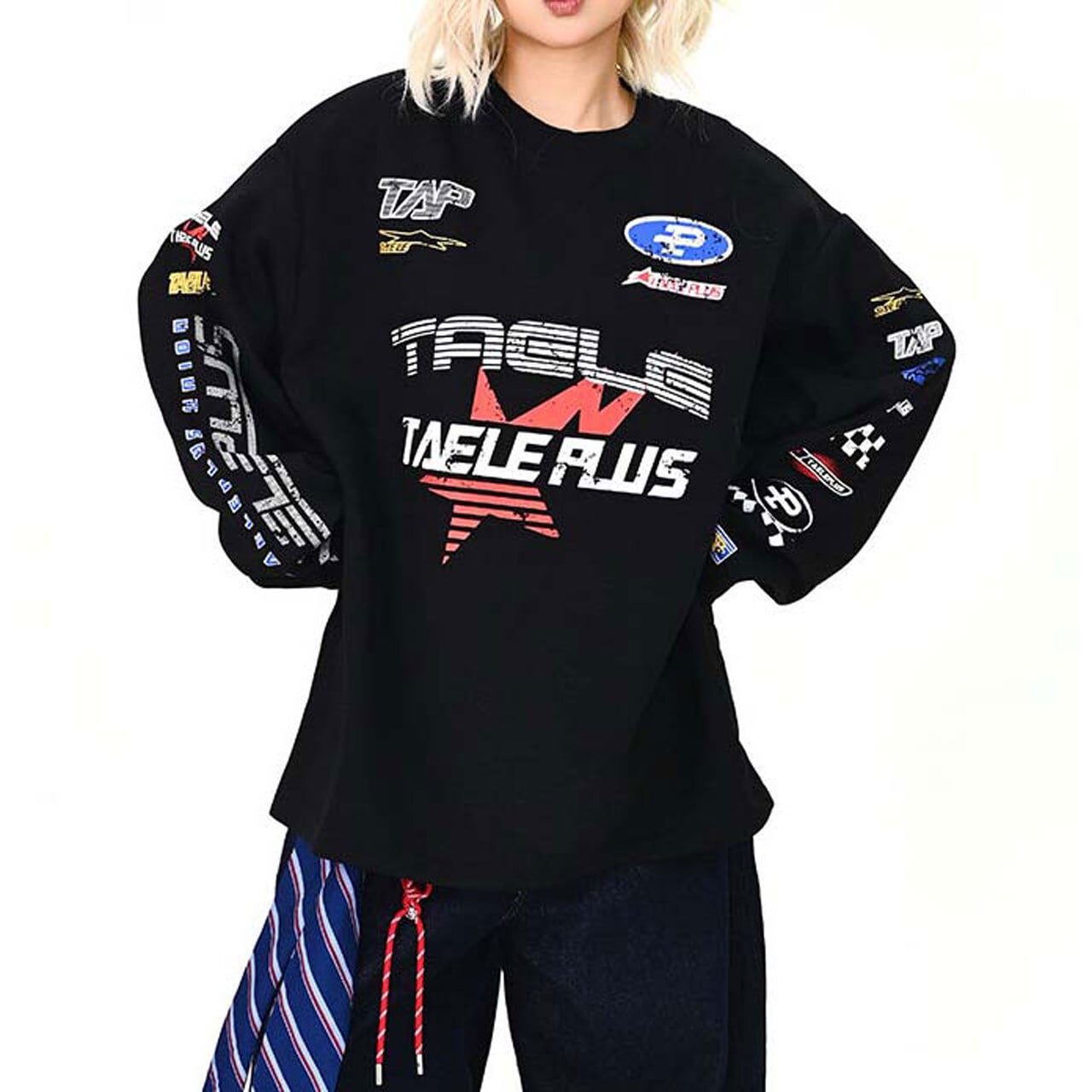フロントに散りばめたグラフィックが視線を集める主役トップス。