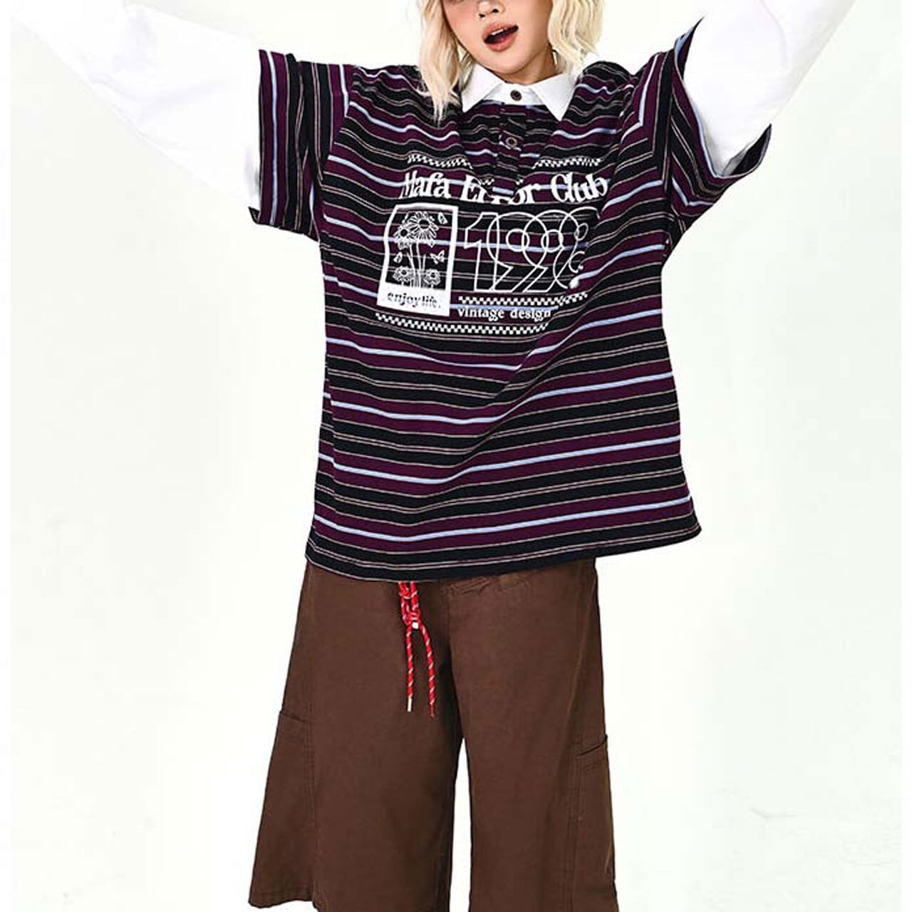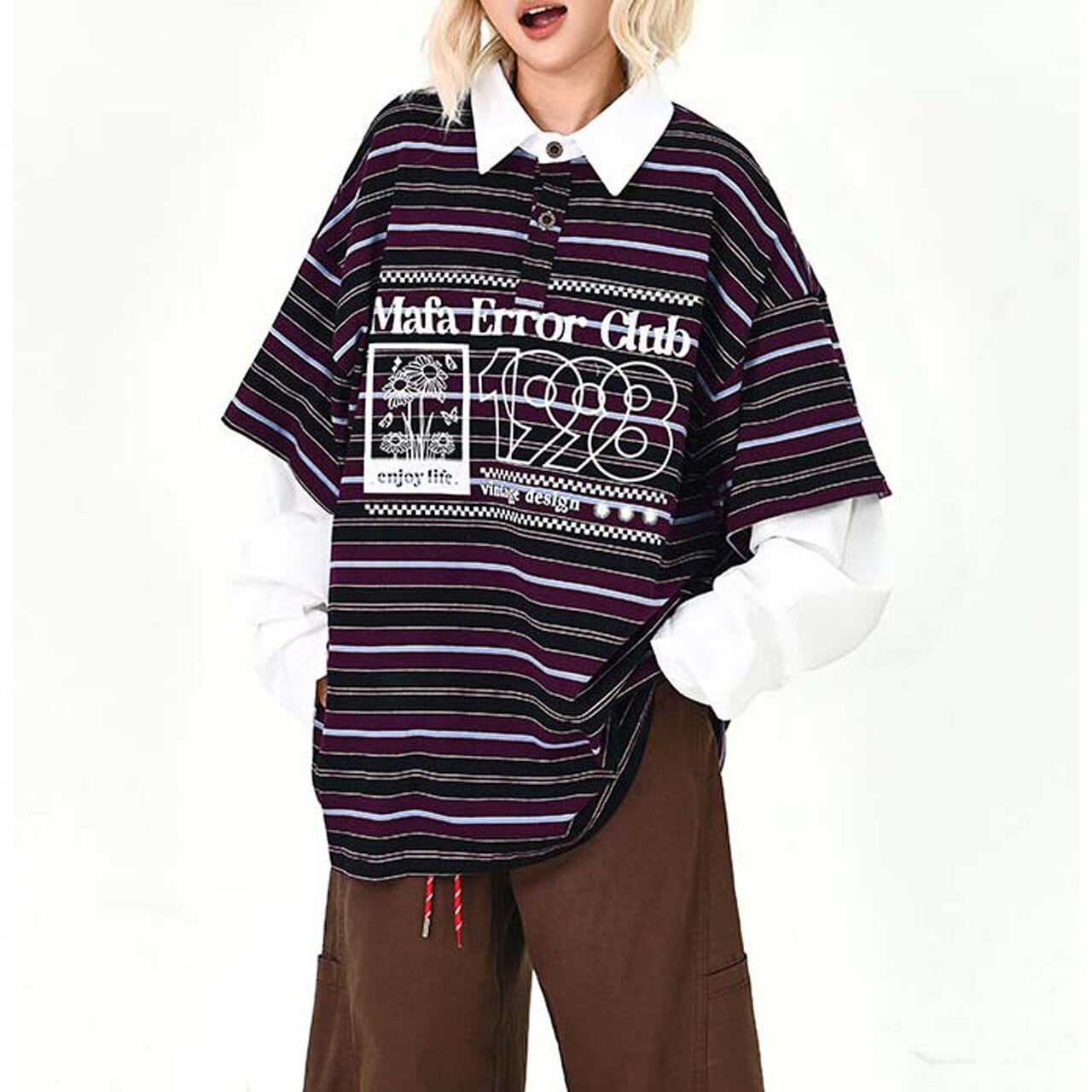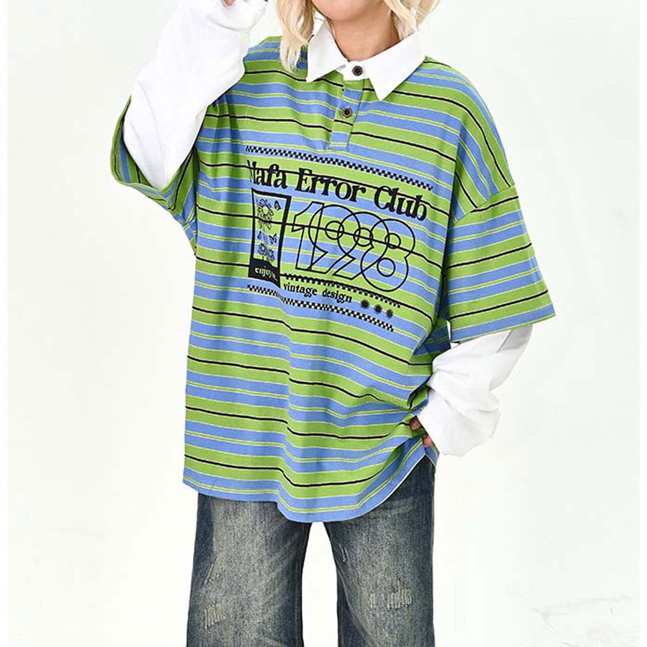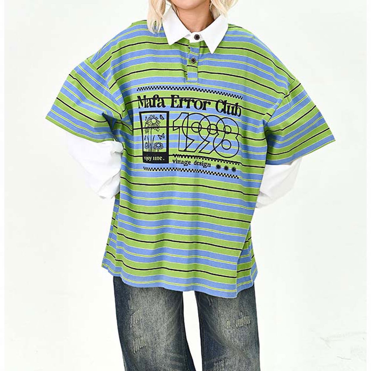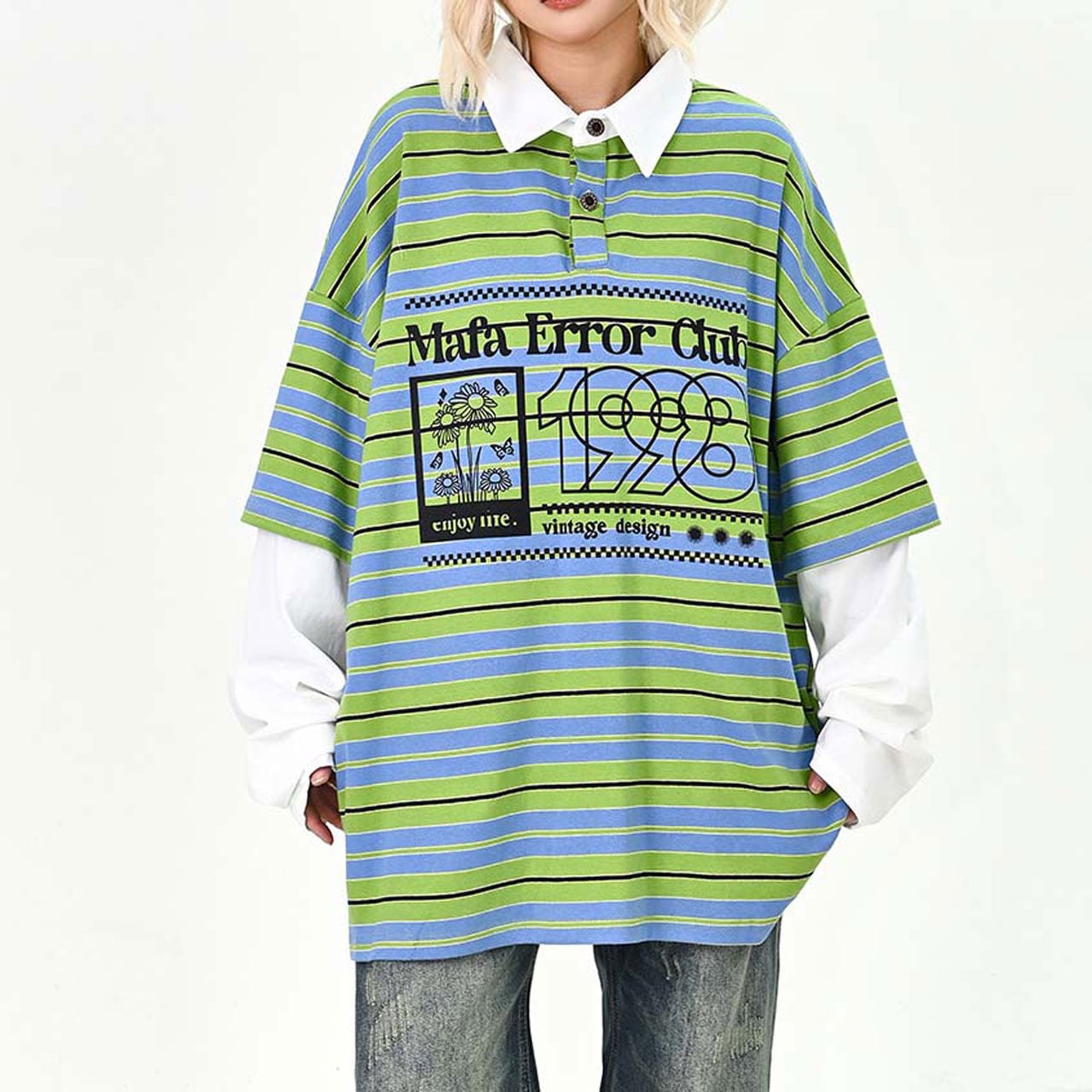 ポップなボーダー柄にロゴプリントを重ねた、存在感たっぷりのトップス。