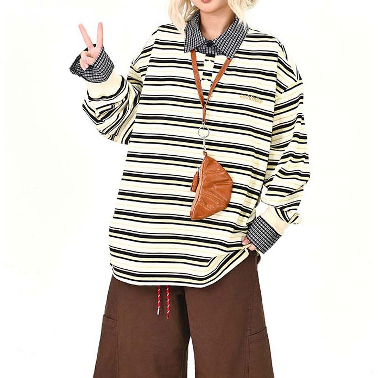 ボーダー×配色襟のレイヤード風デザインが目を引くトップス。