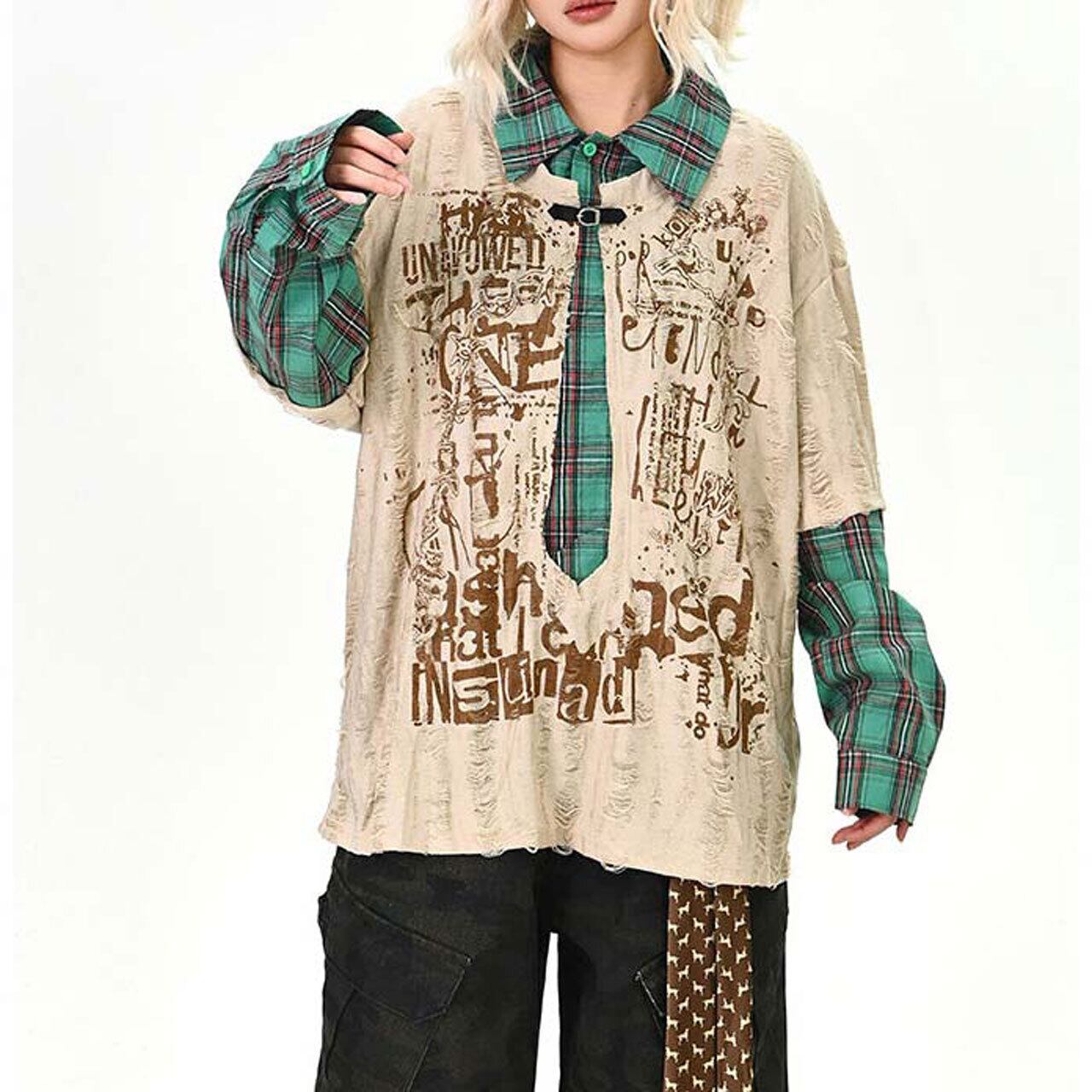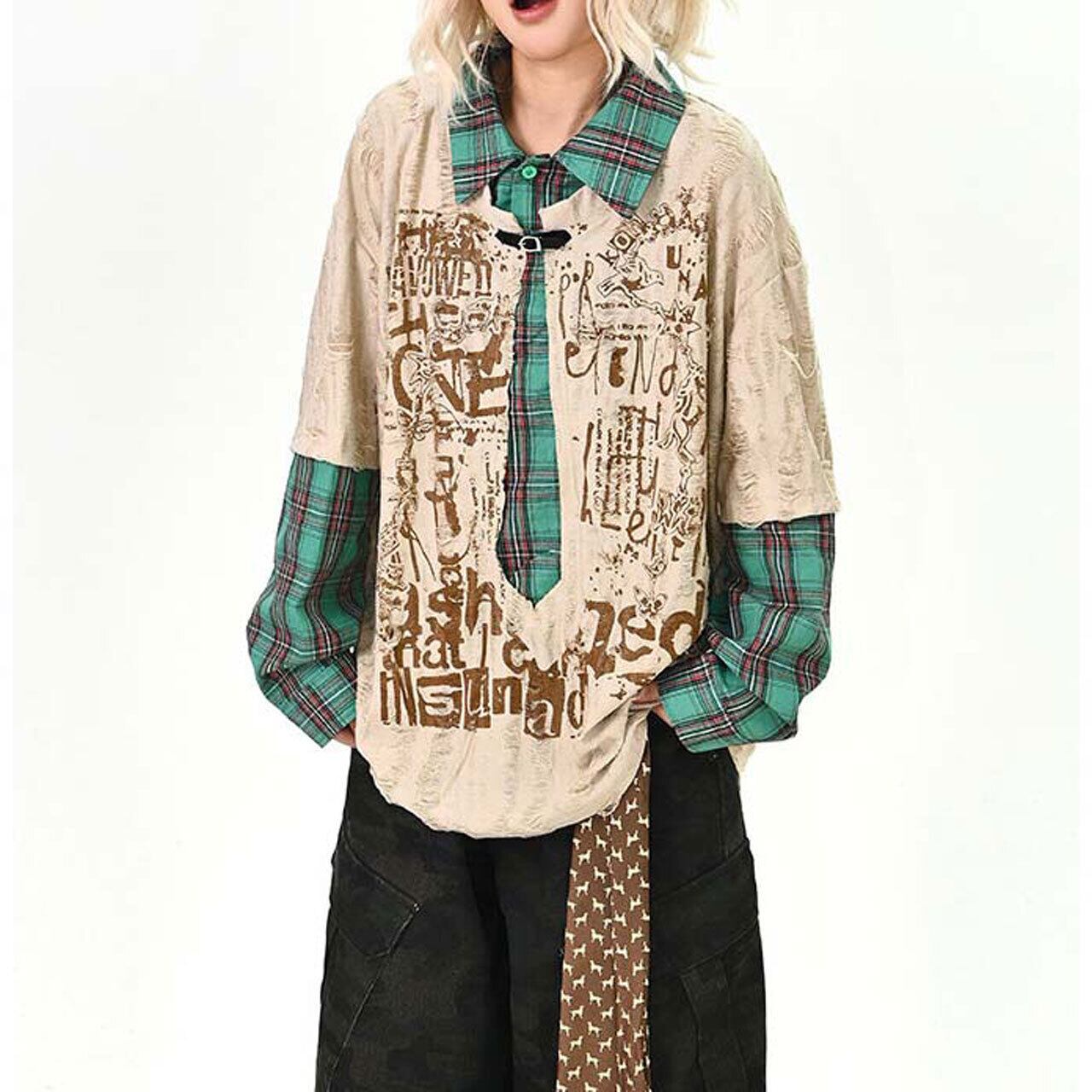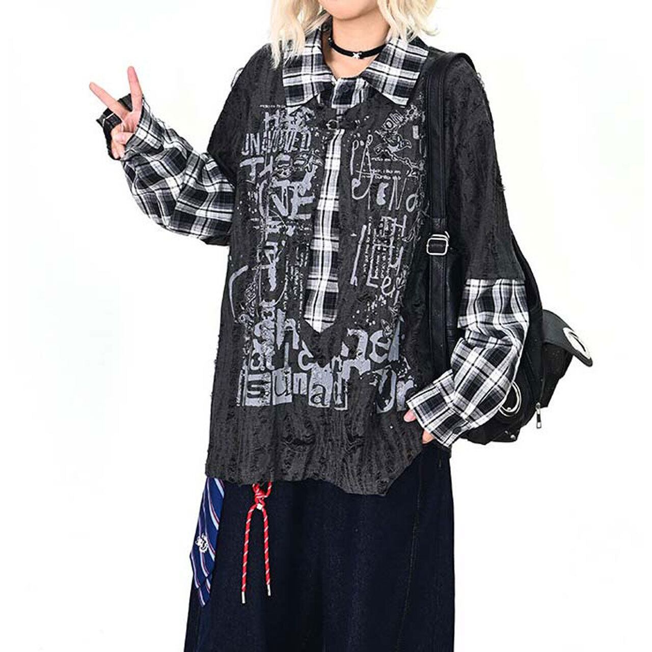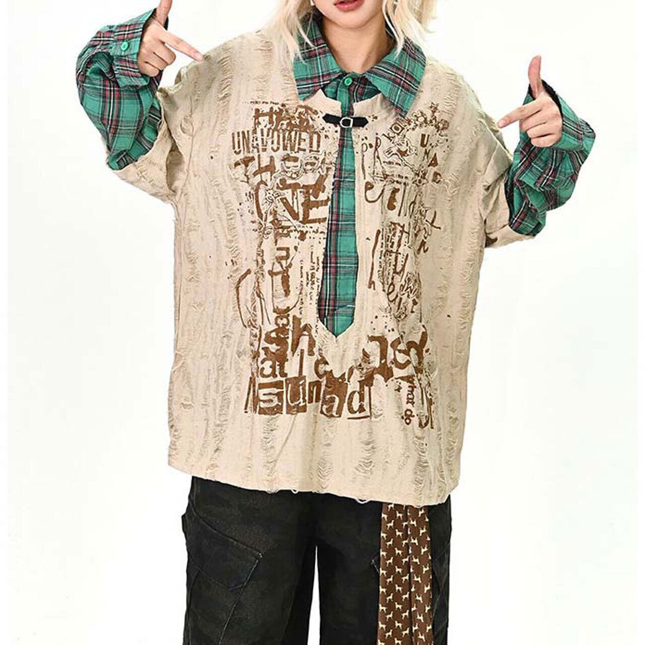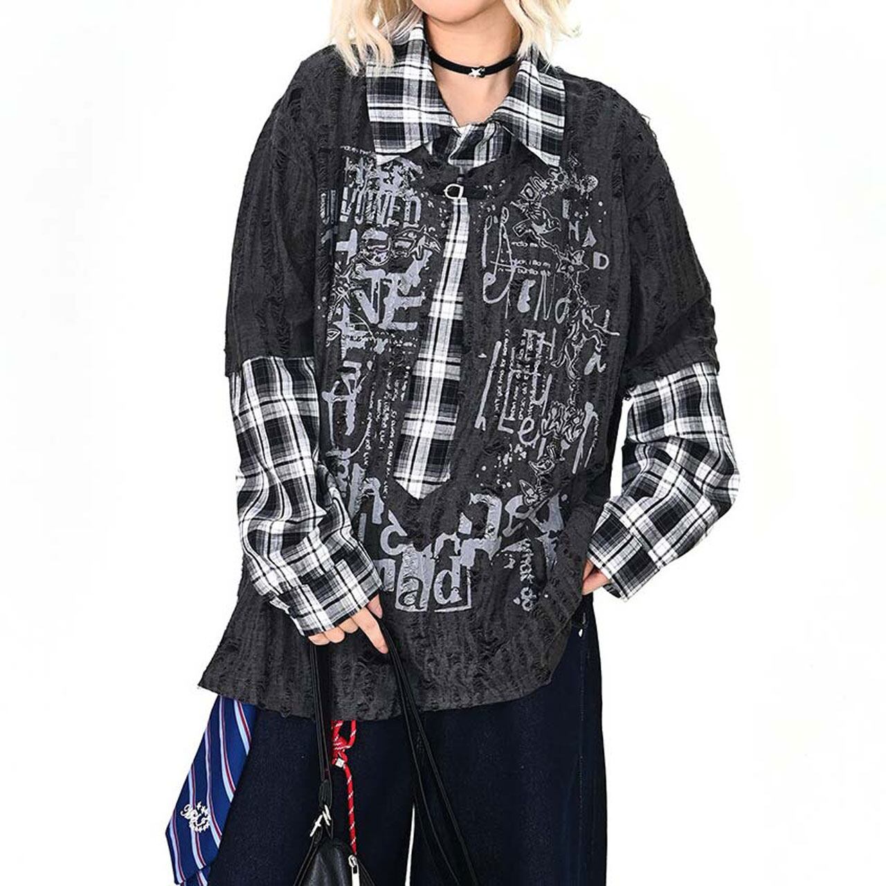 ダメージグラフィックチェックレイヤードトップス 2col R01497