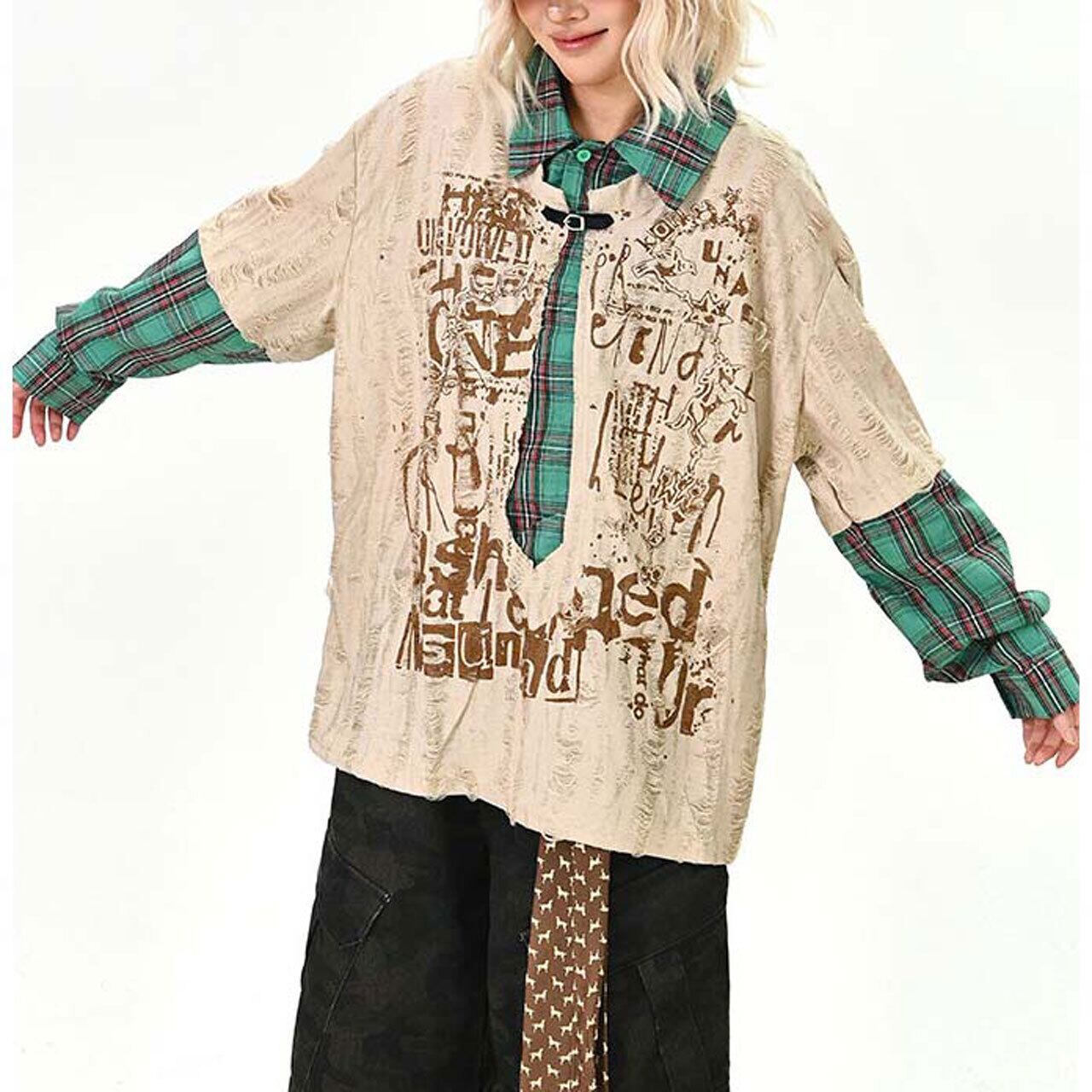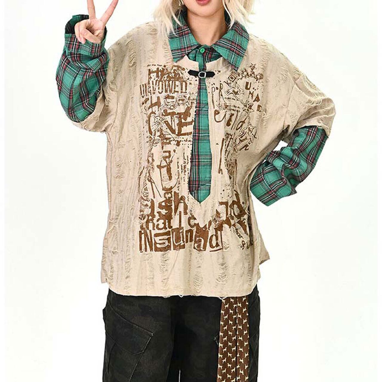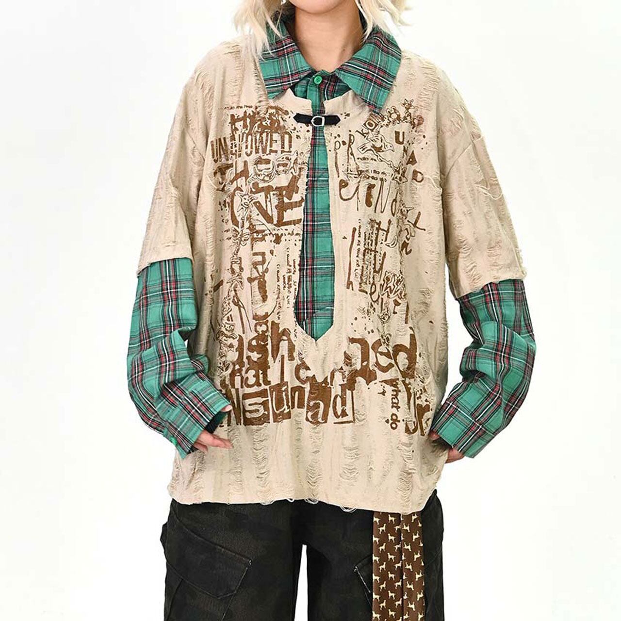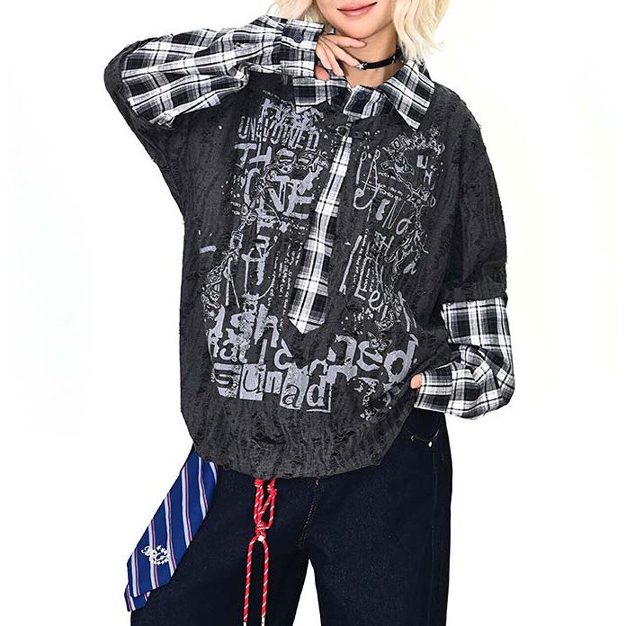 ダメージグラフィックチェックレイヤードトップス 2col R01497