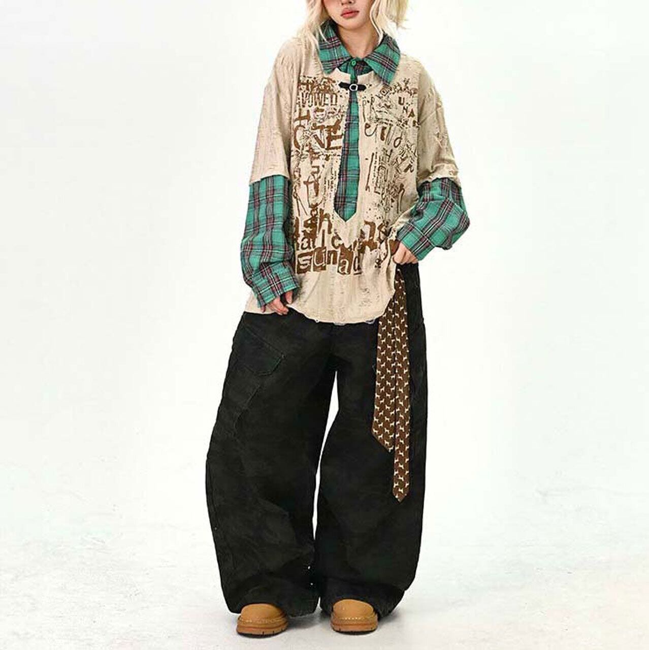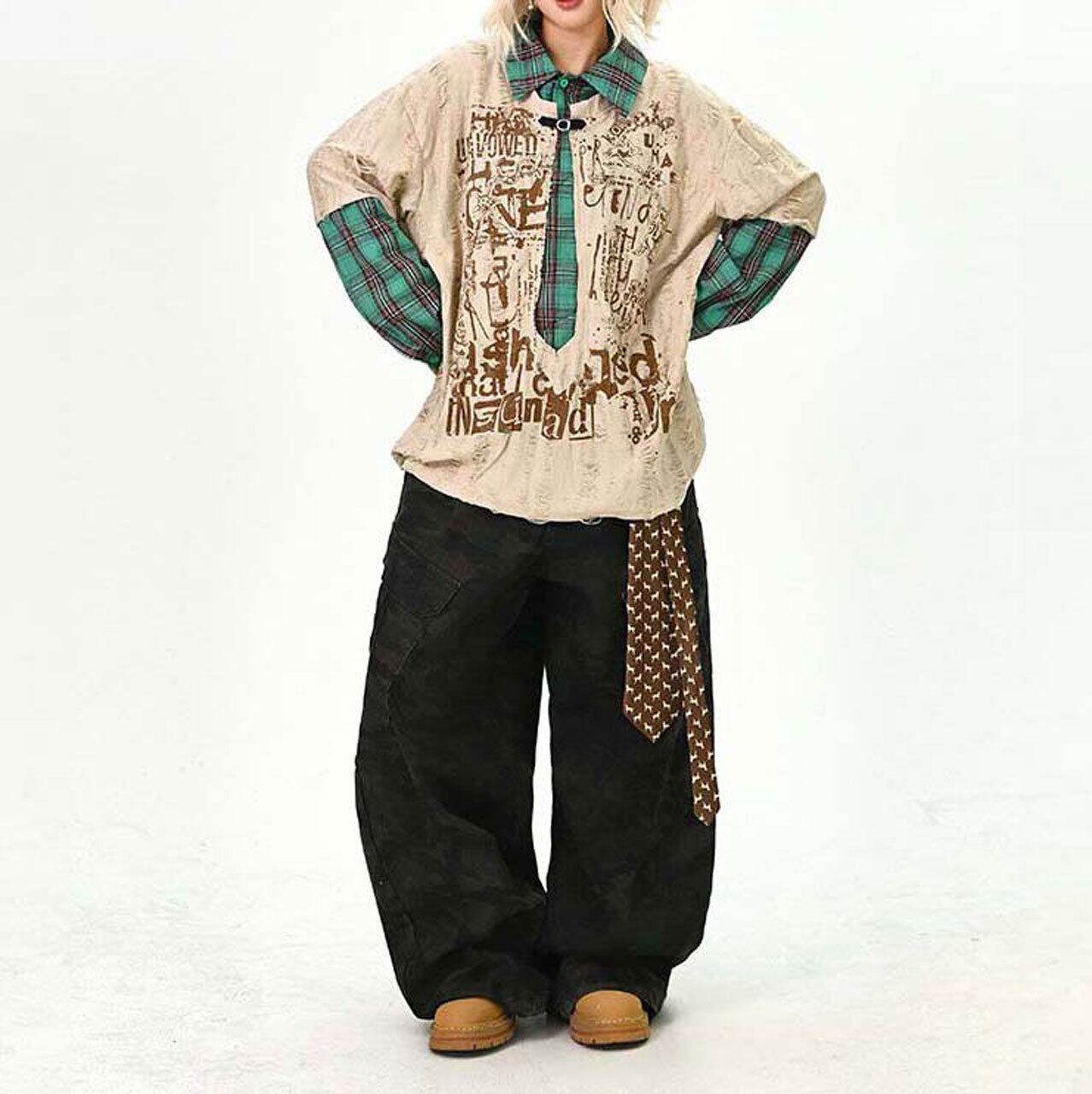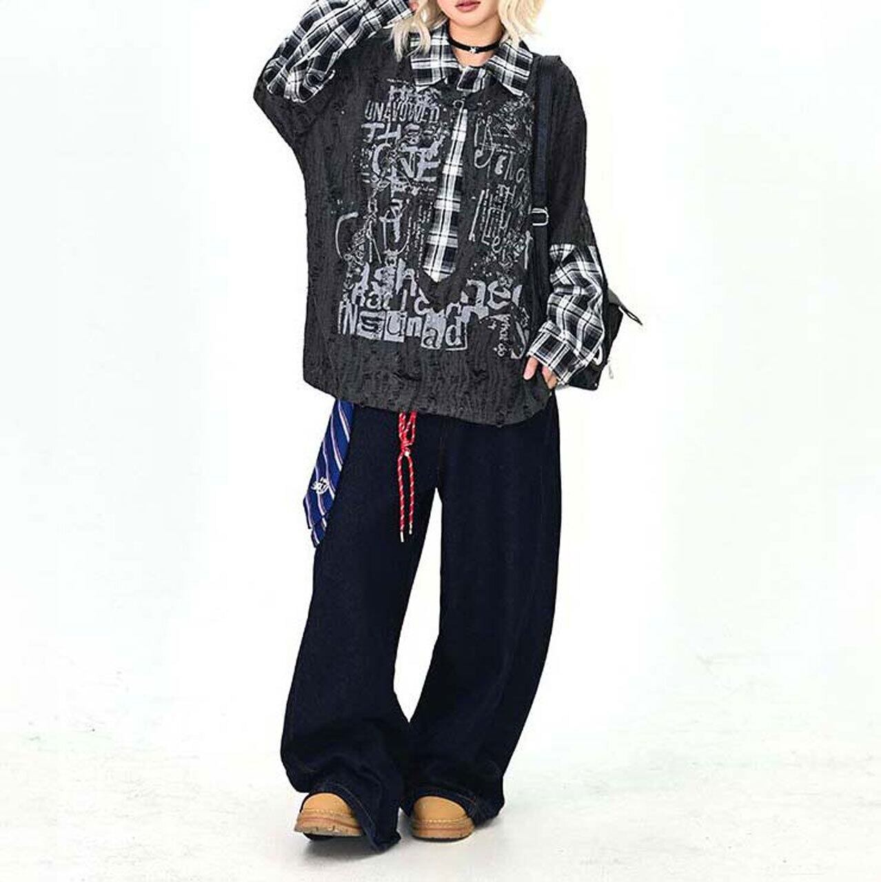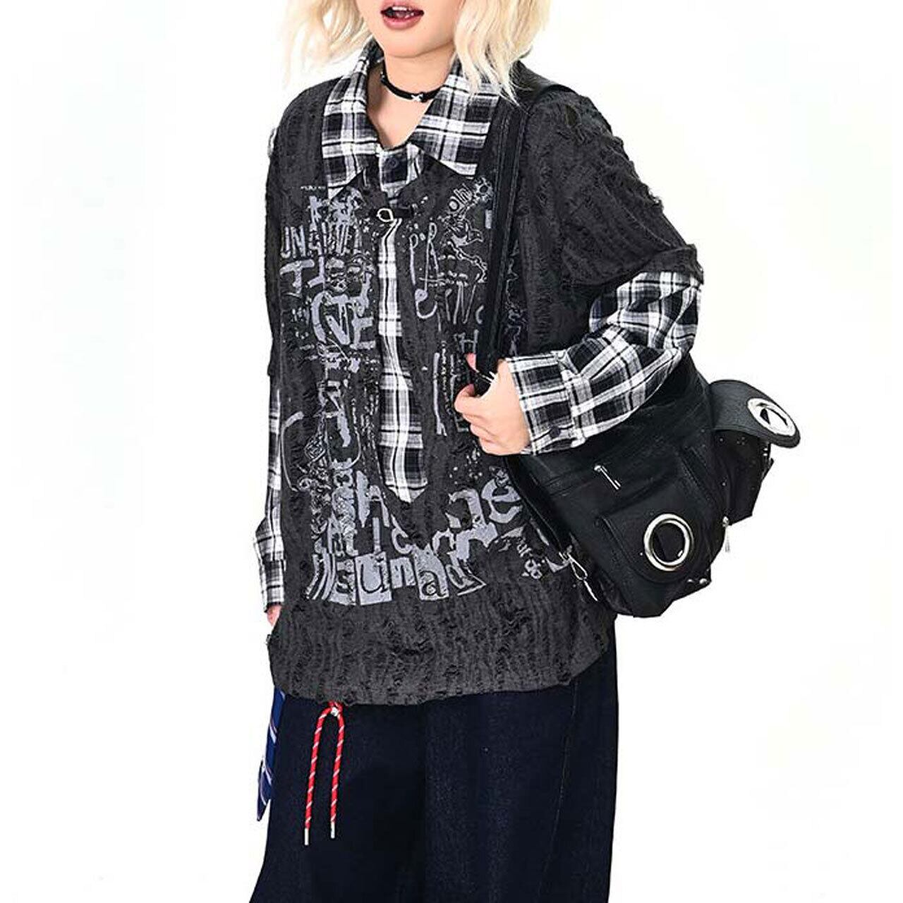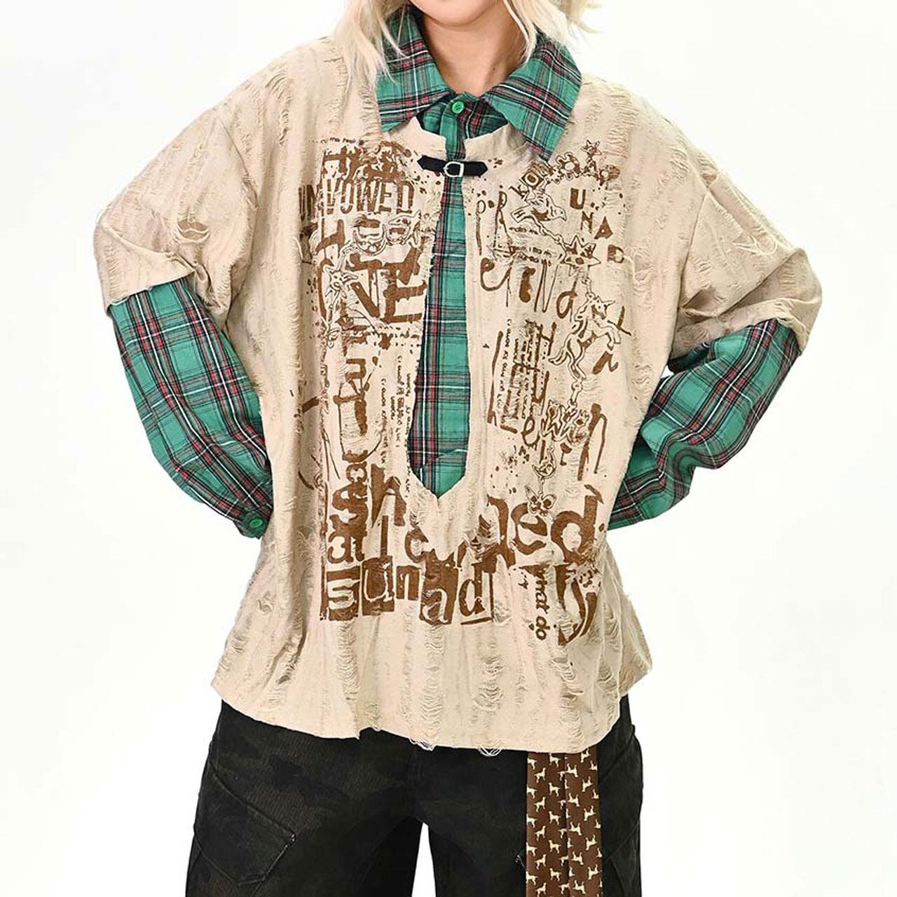 ダメージグラフィックチェックレイヤードトップス 2col R01497