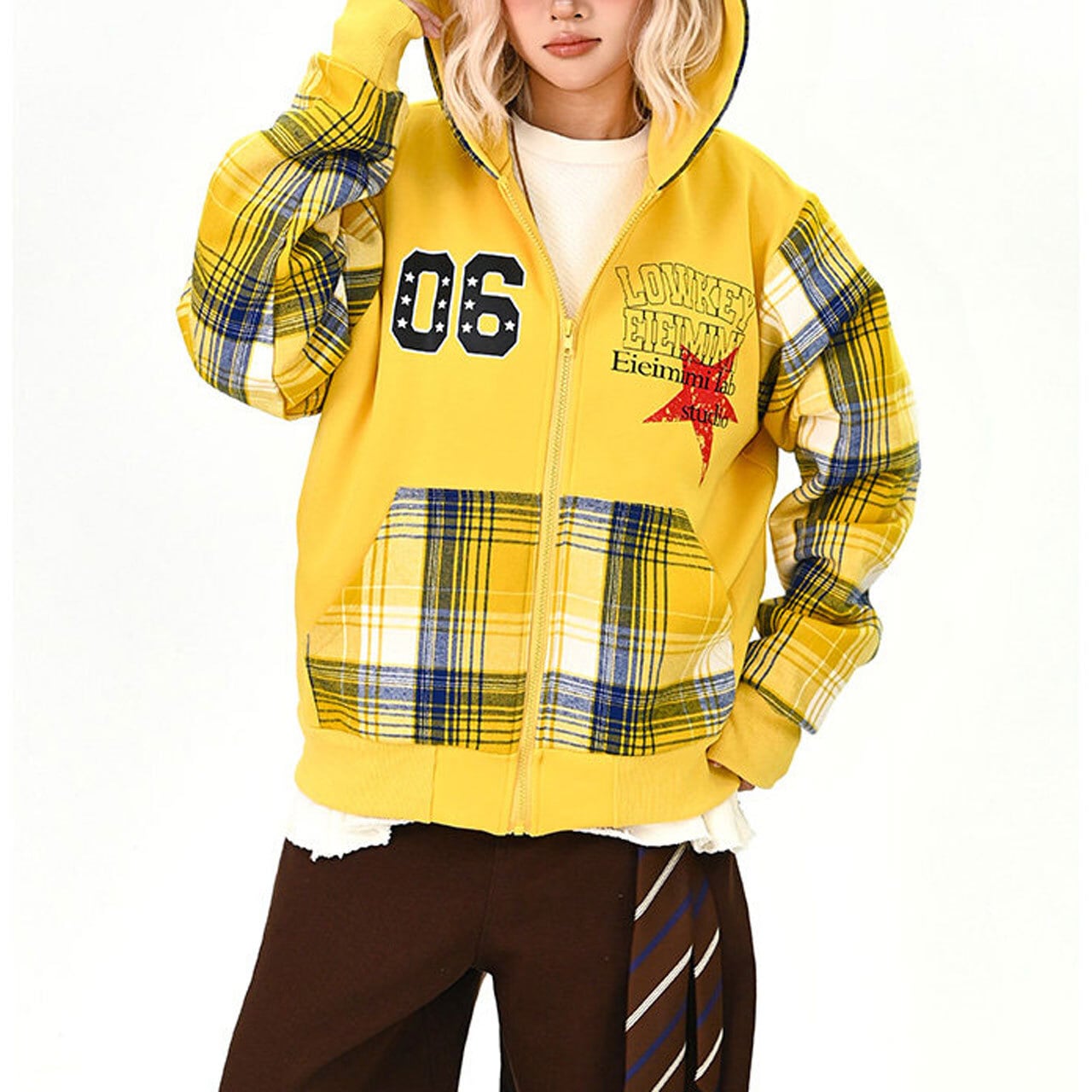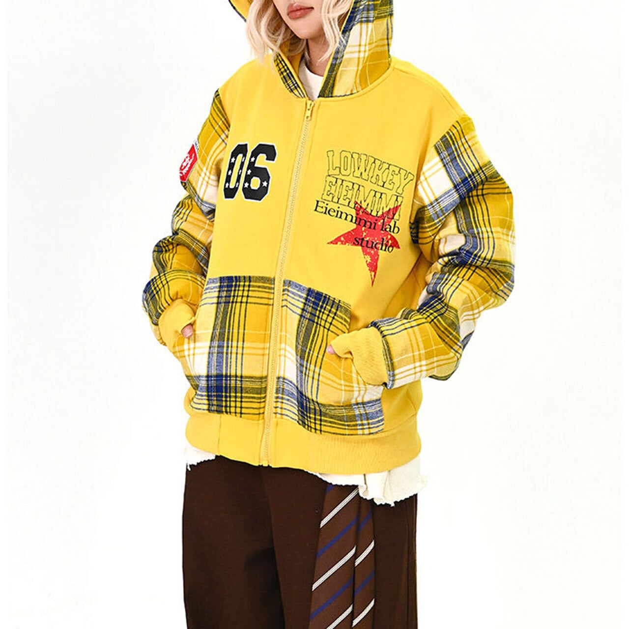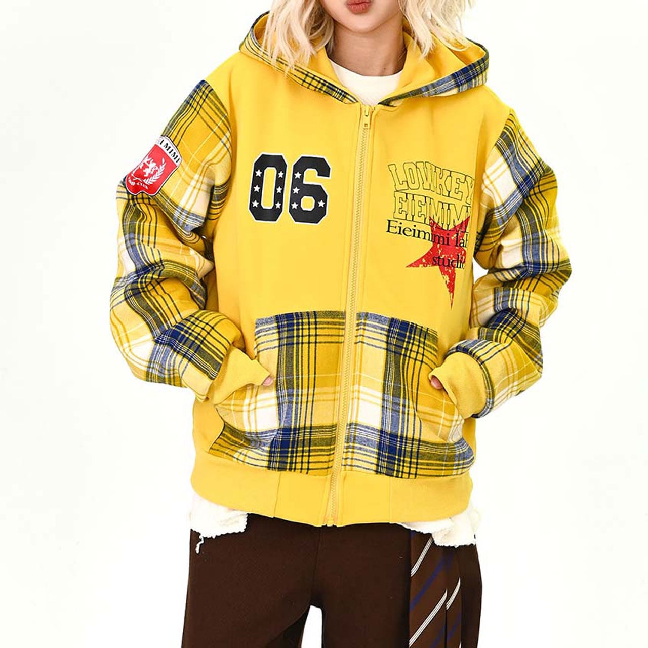 目を引くチェック柄とパッチワークデザインが特徴的なジップアップパーカー。