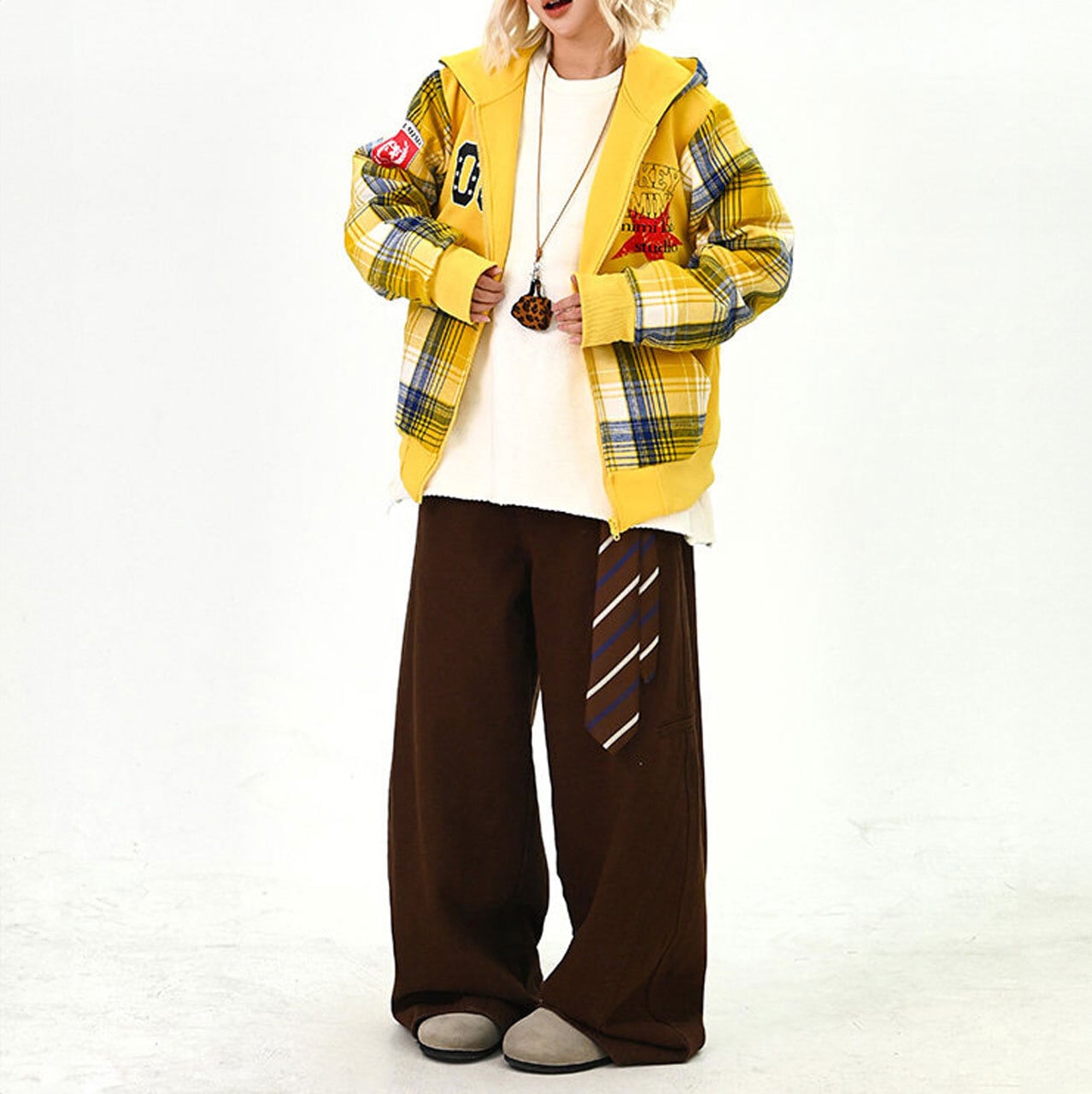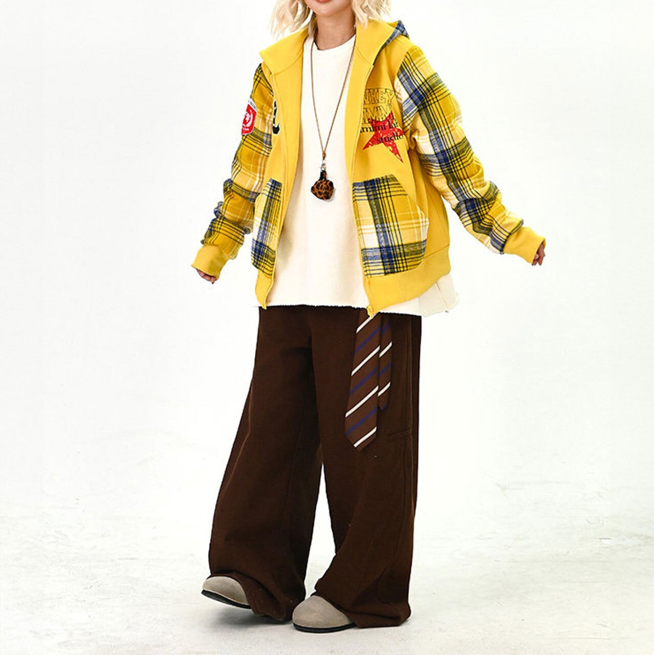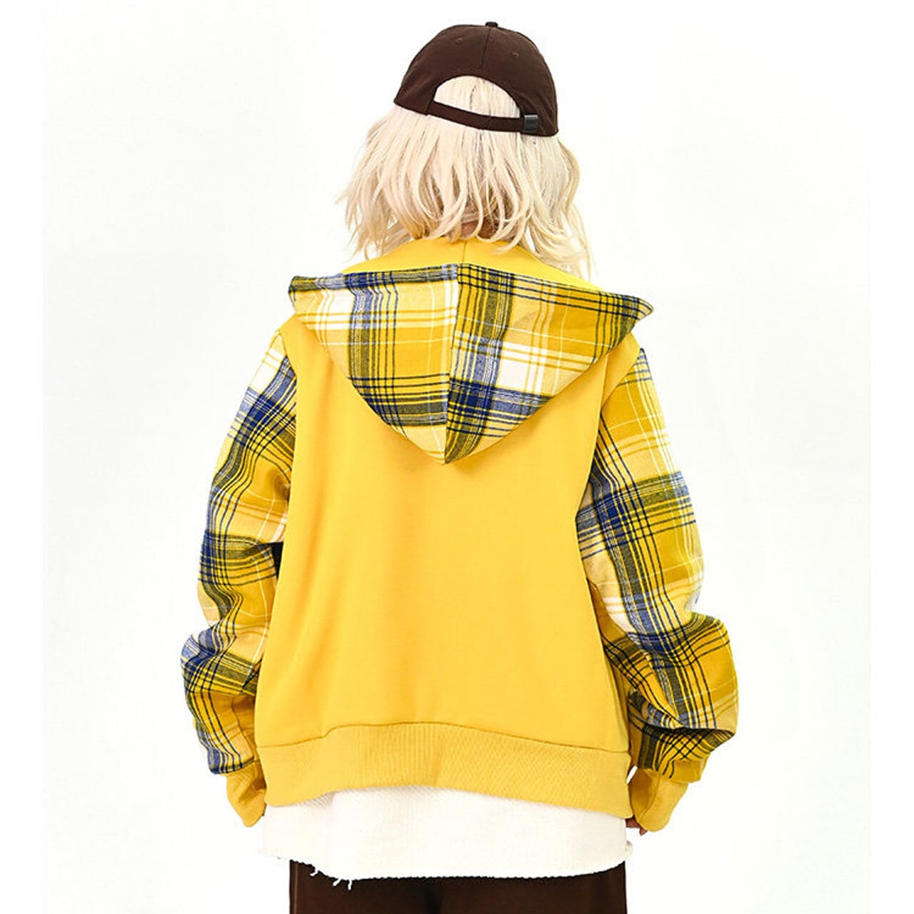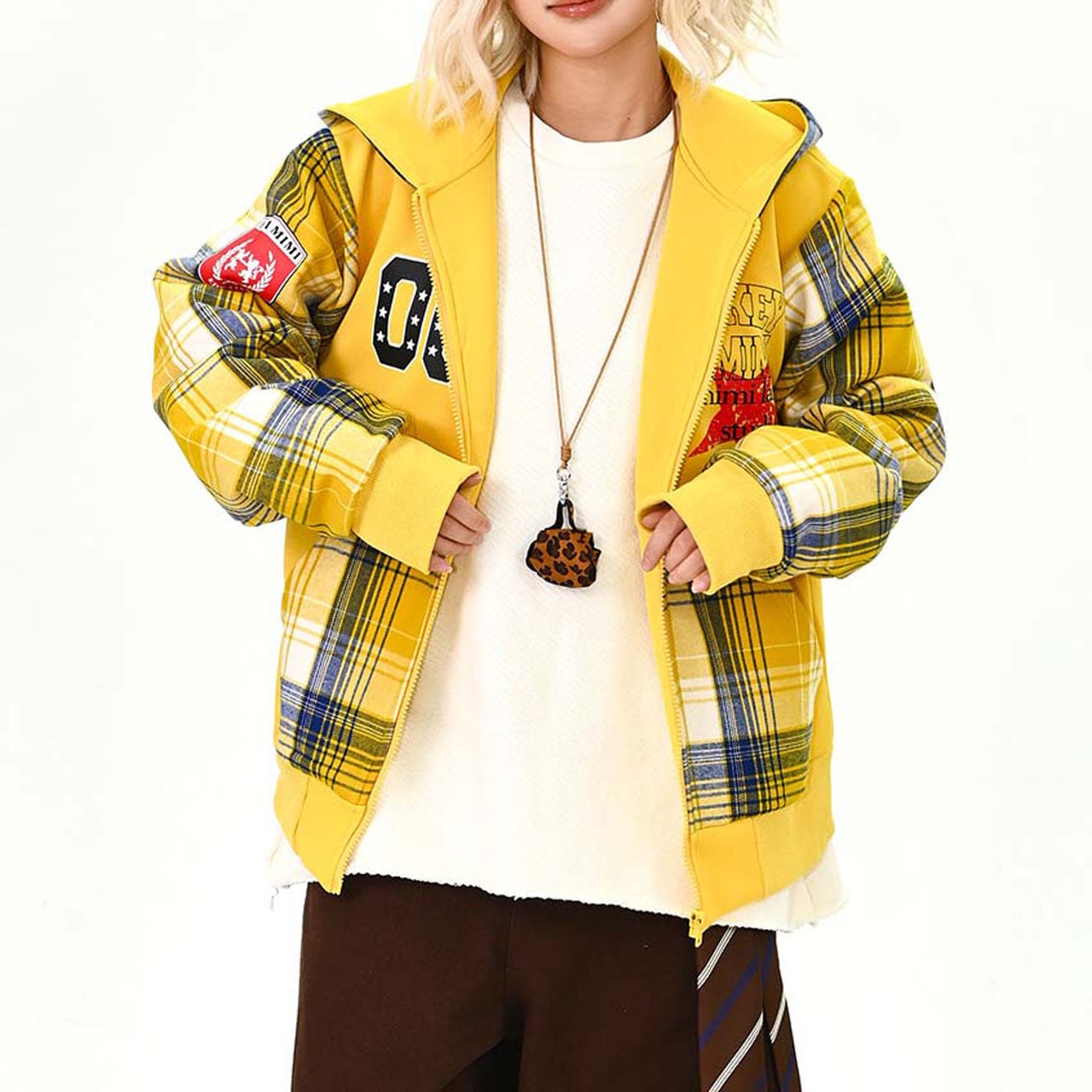 目を引くチェック柄とパッチワークデザインが特徴的なジップアップパーカー。