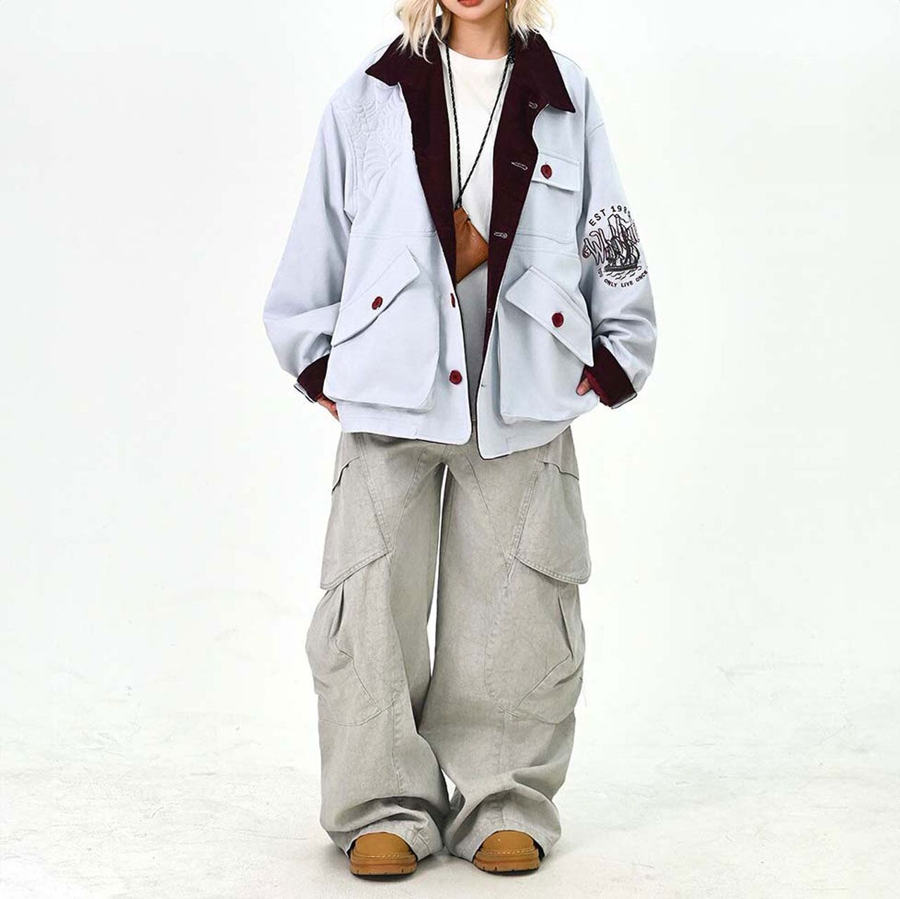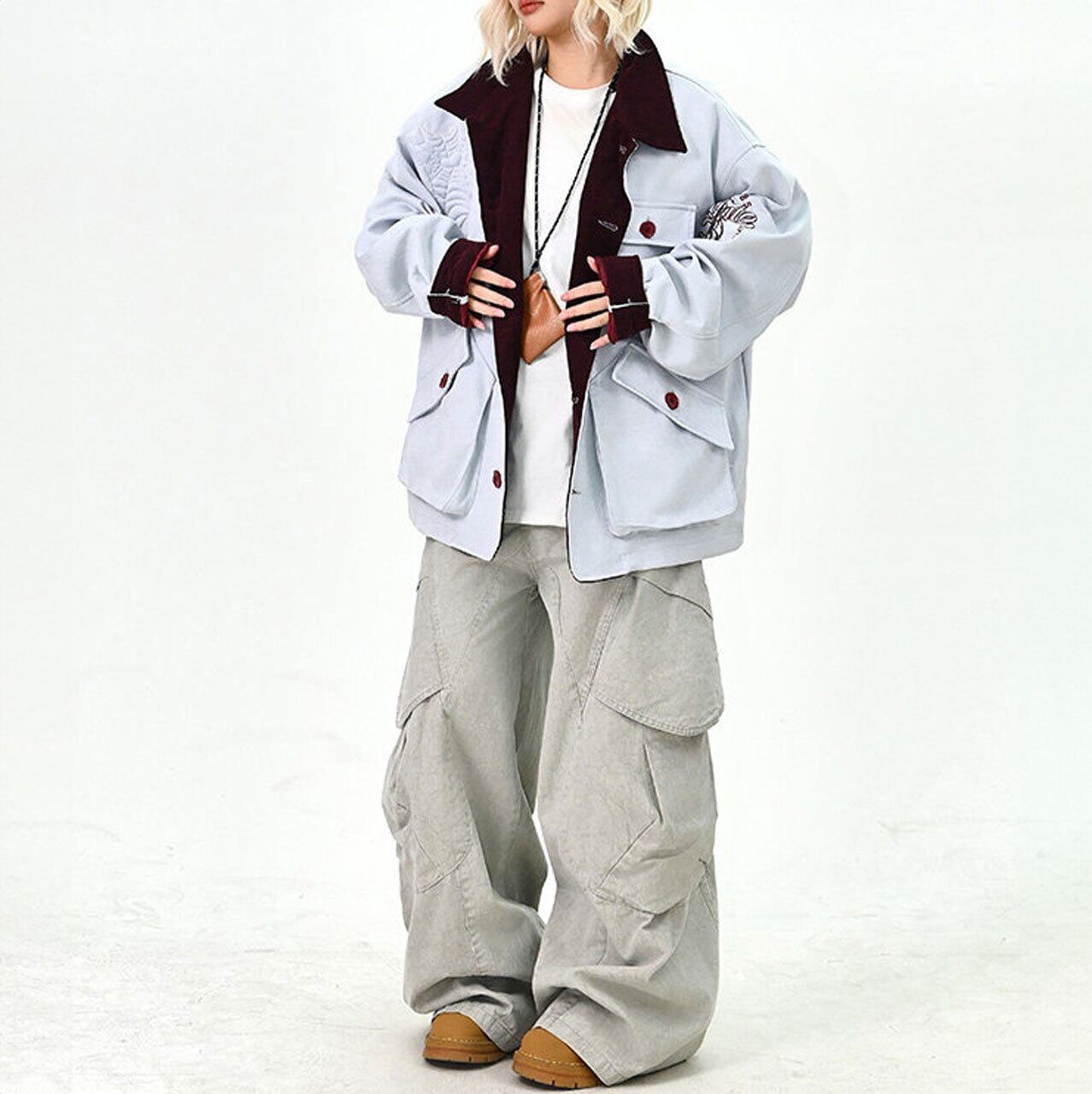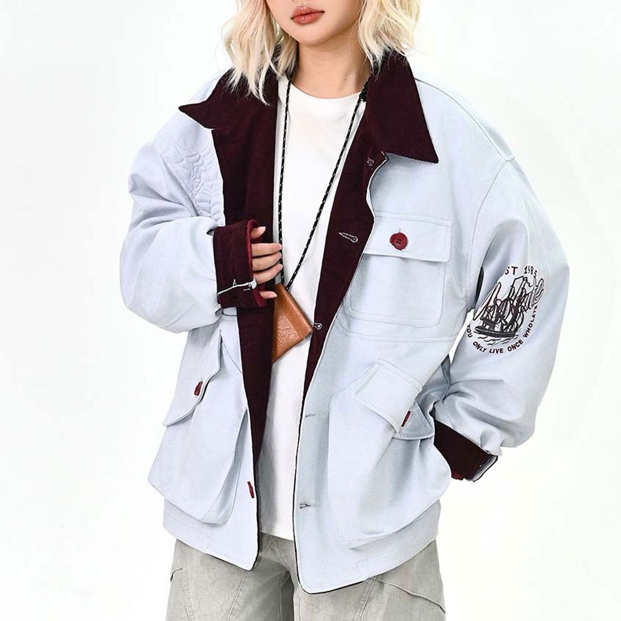 配色のコントラストが効いた襟元とボタン使いが印象的なデザインジャケット。