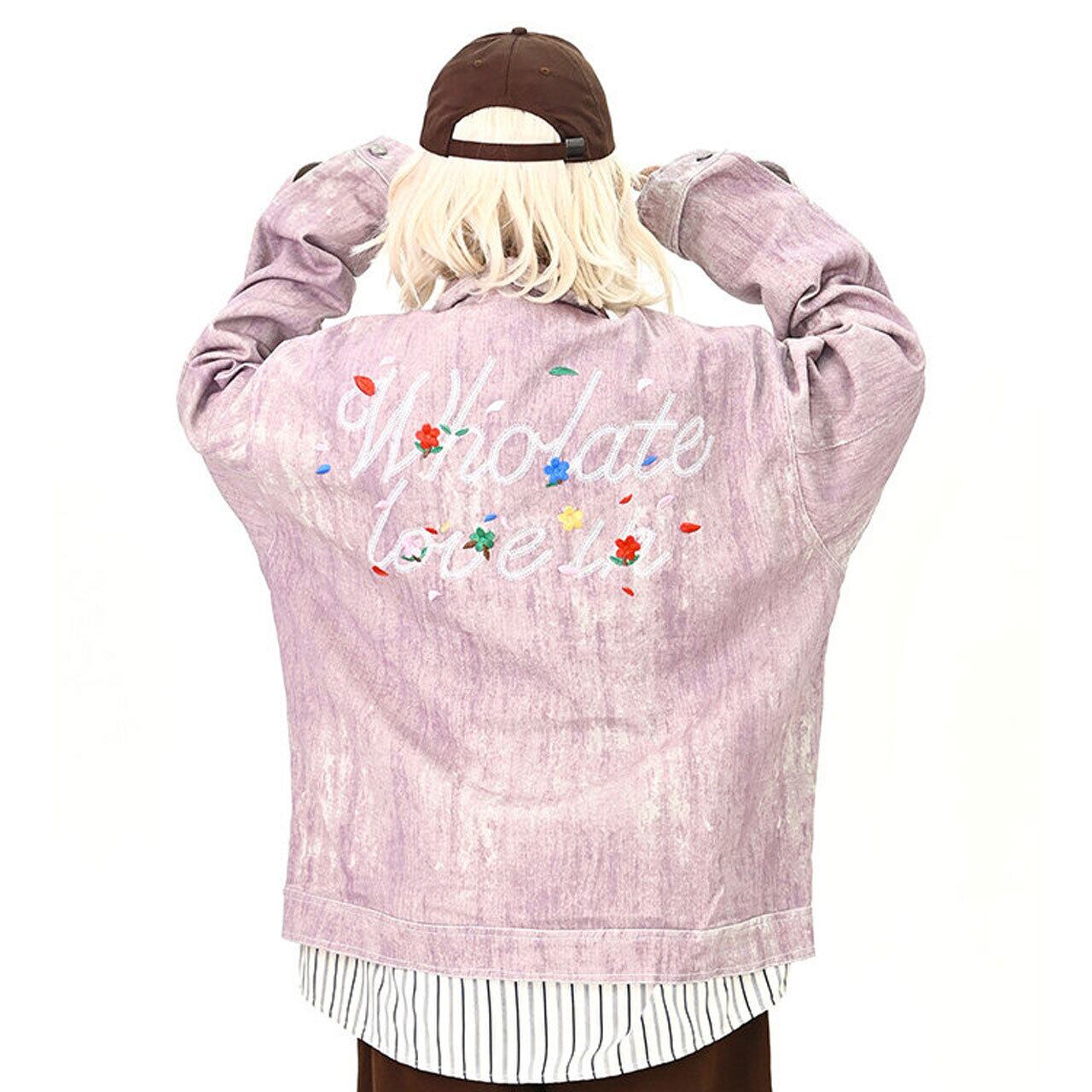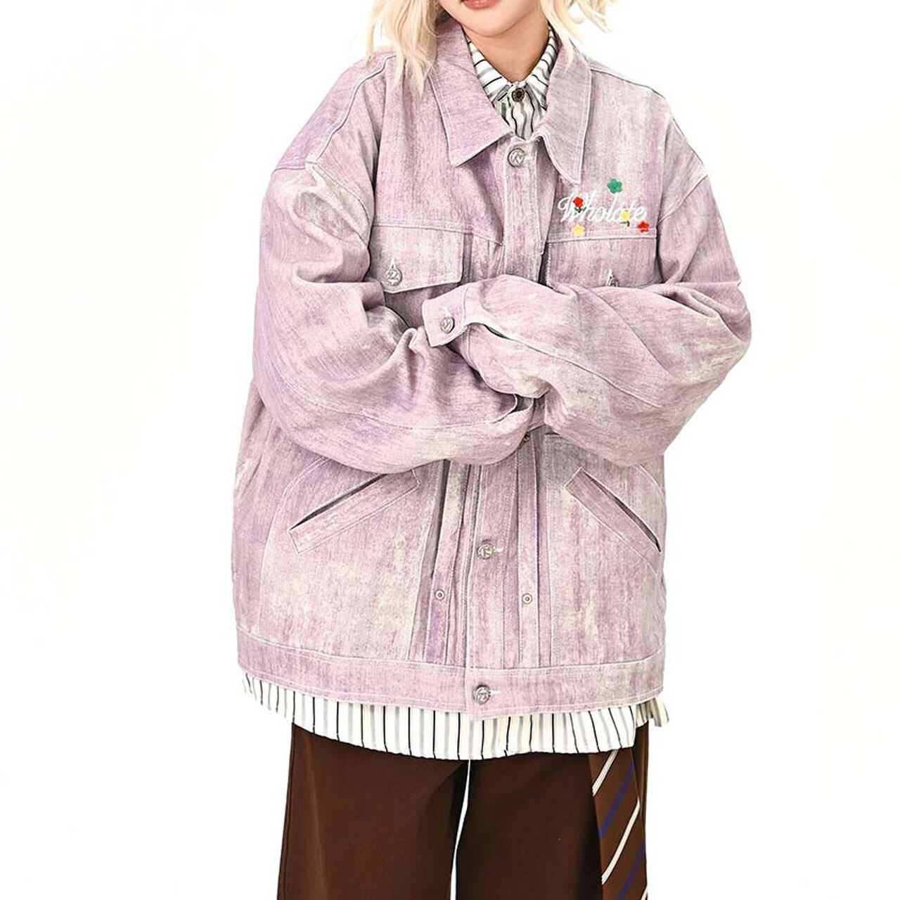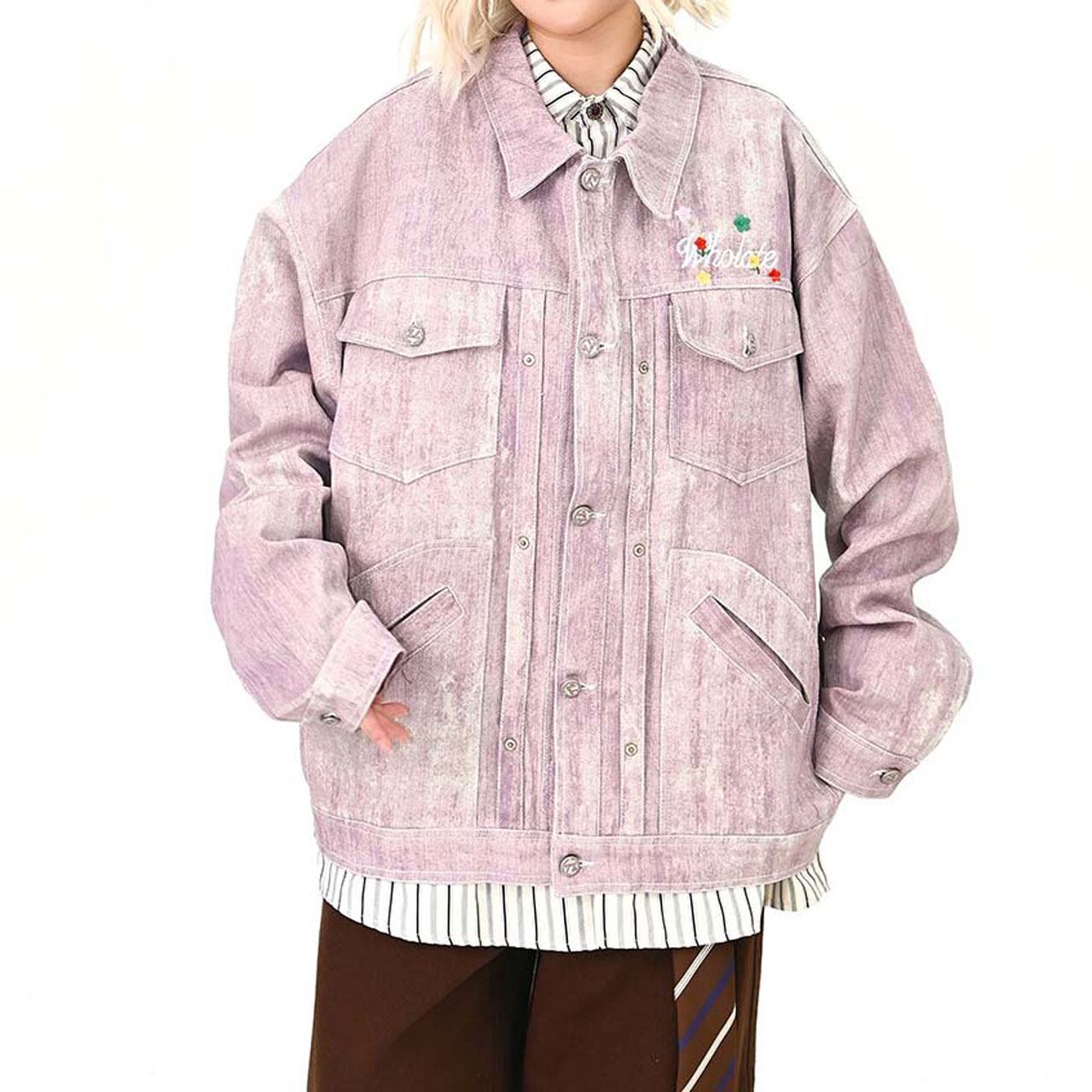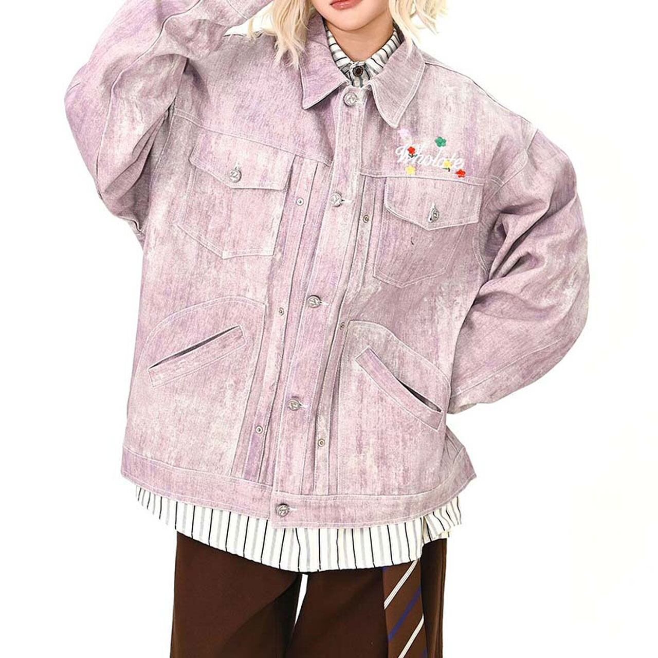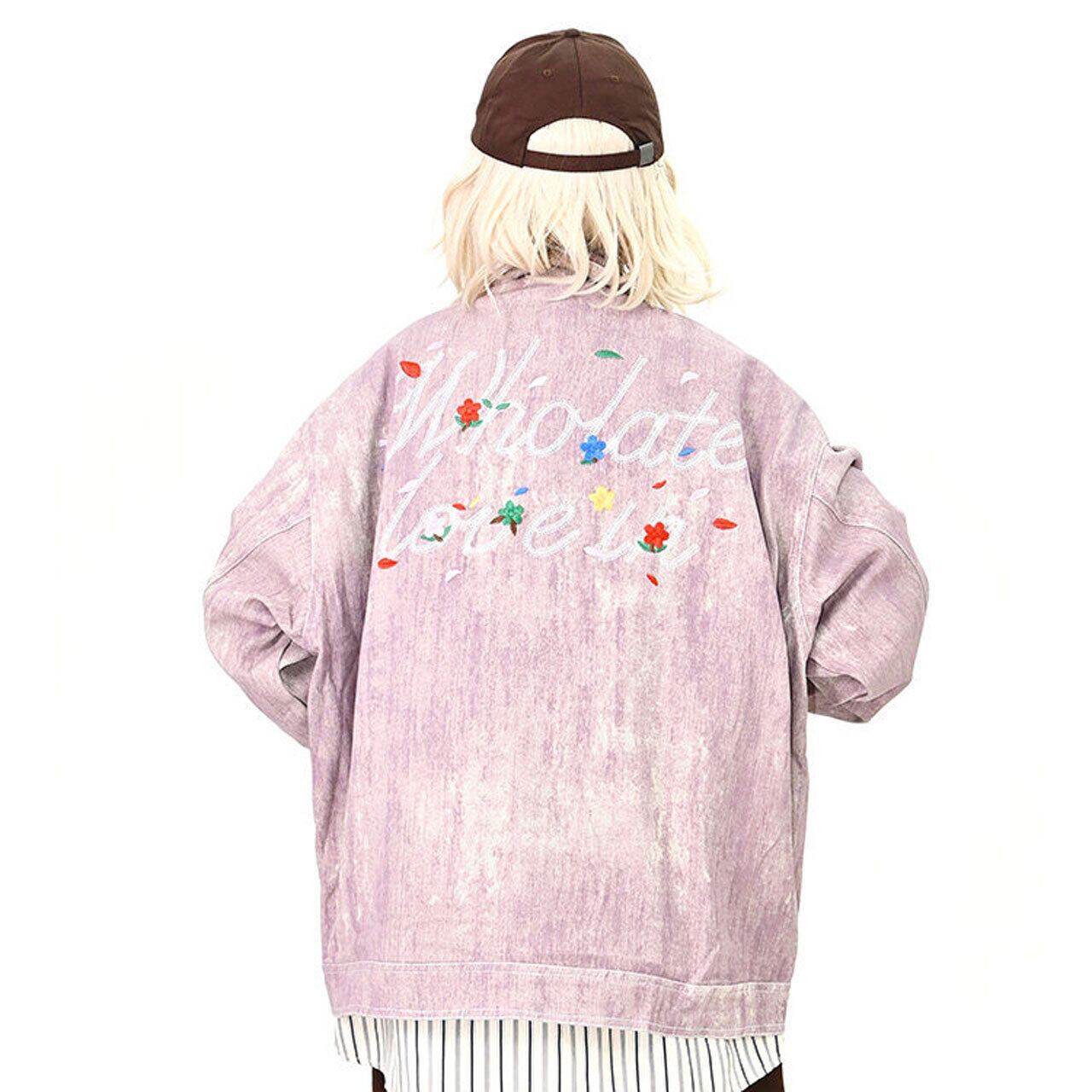 淡いトーンのデニム調に、バックロゴ刺繍が映えるデザインジャケット。
