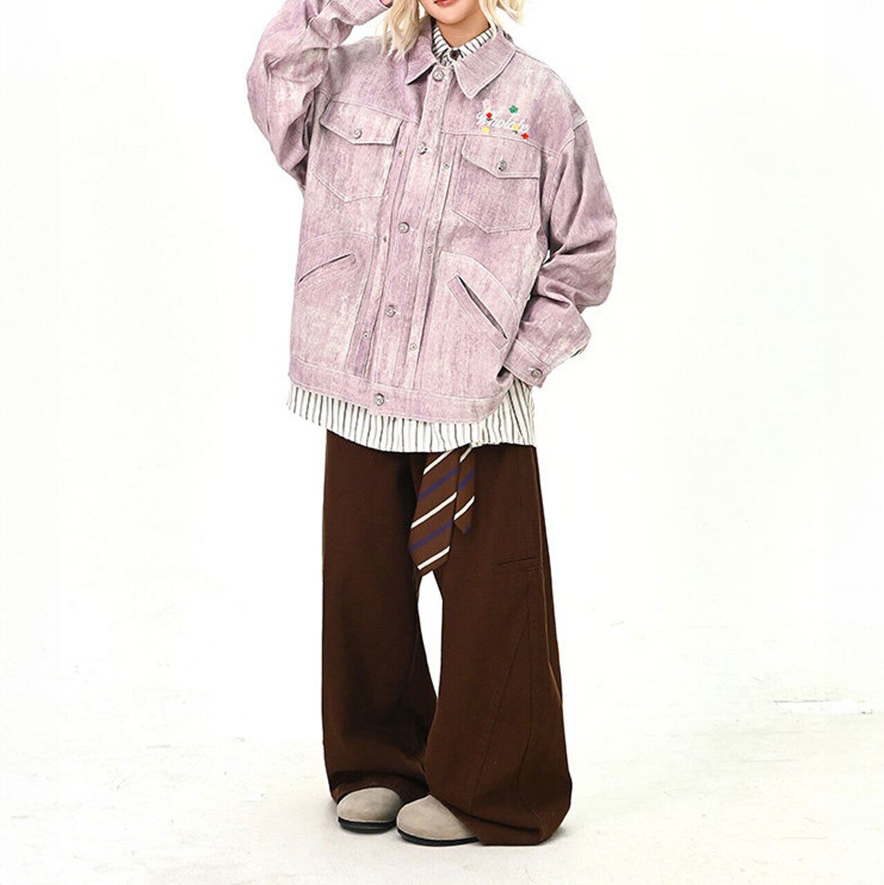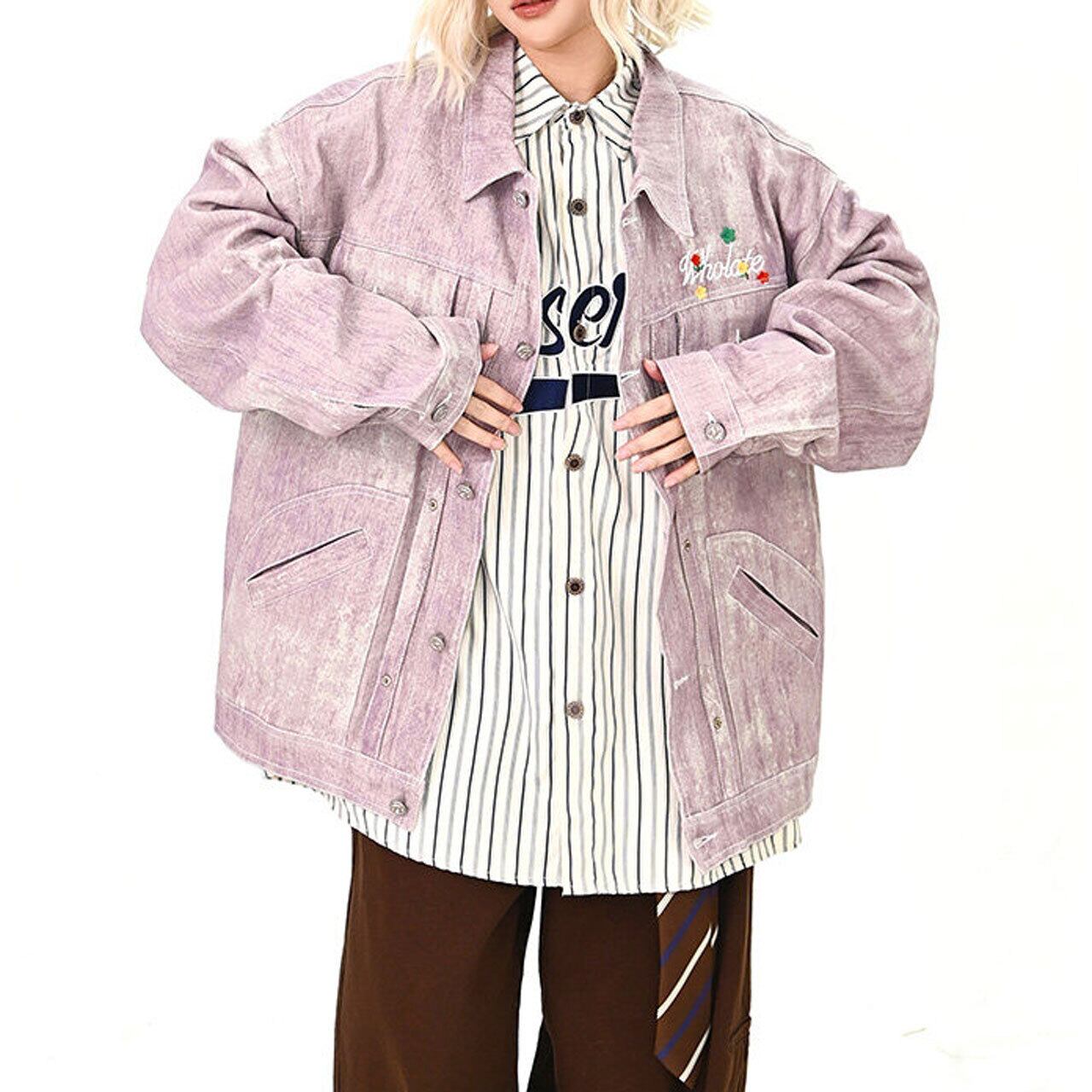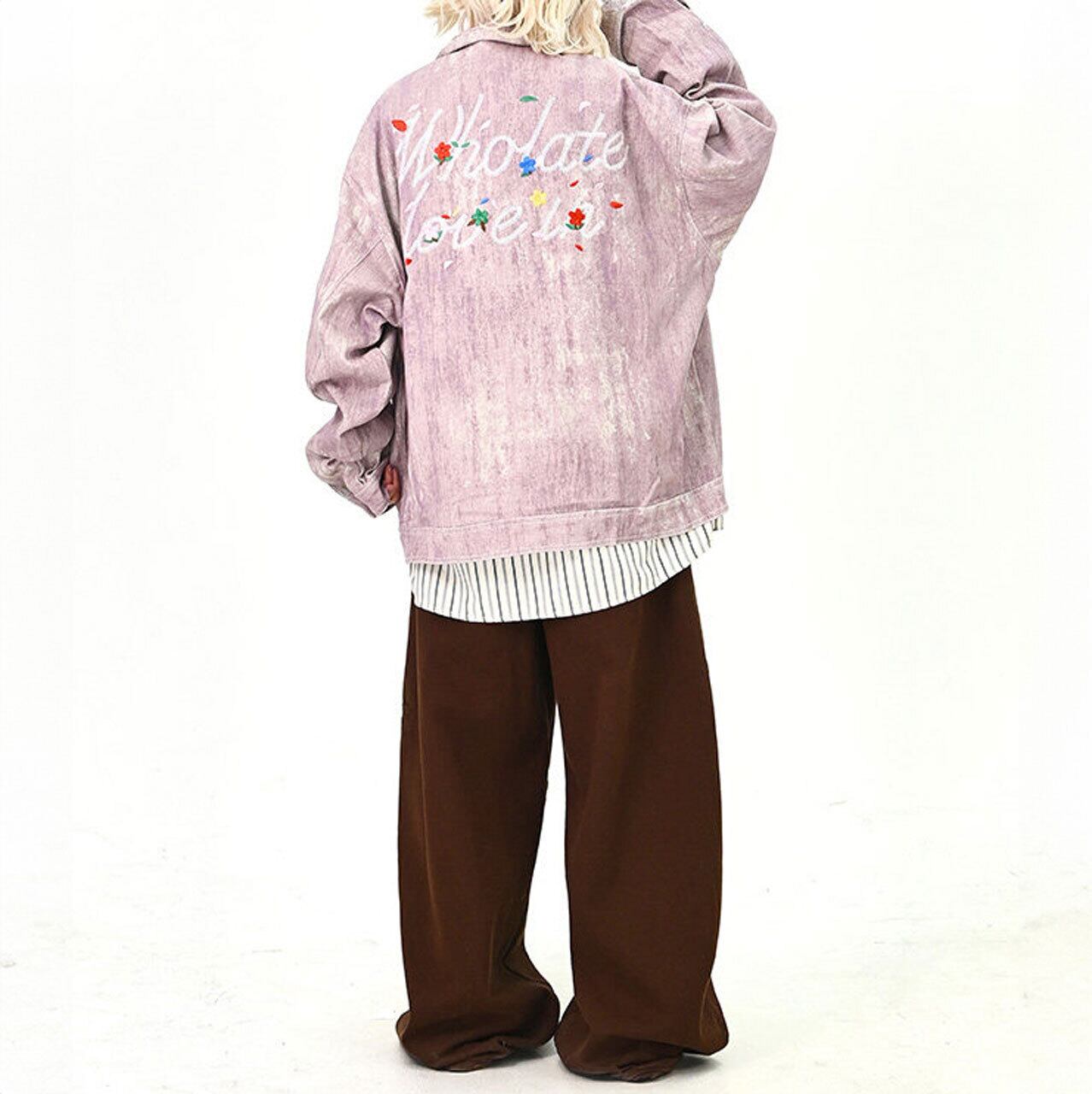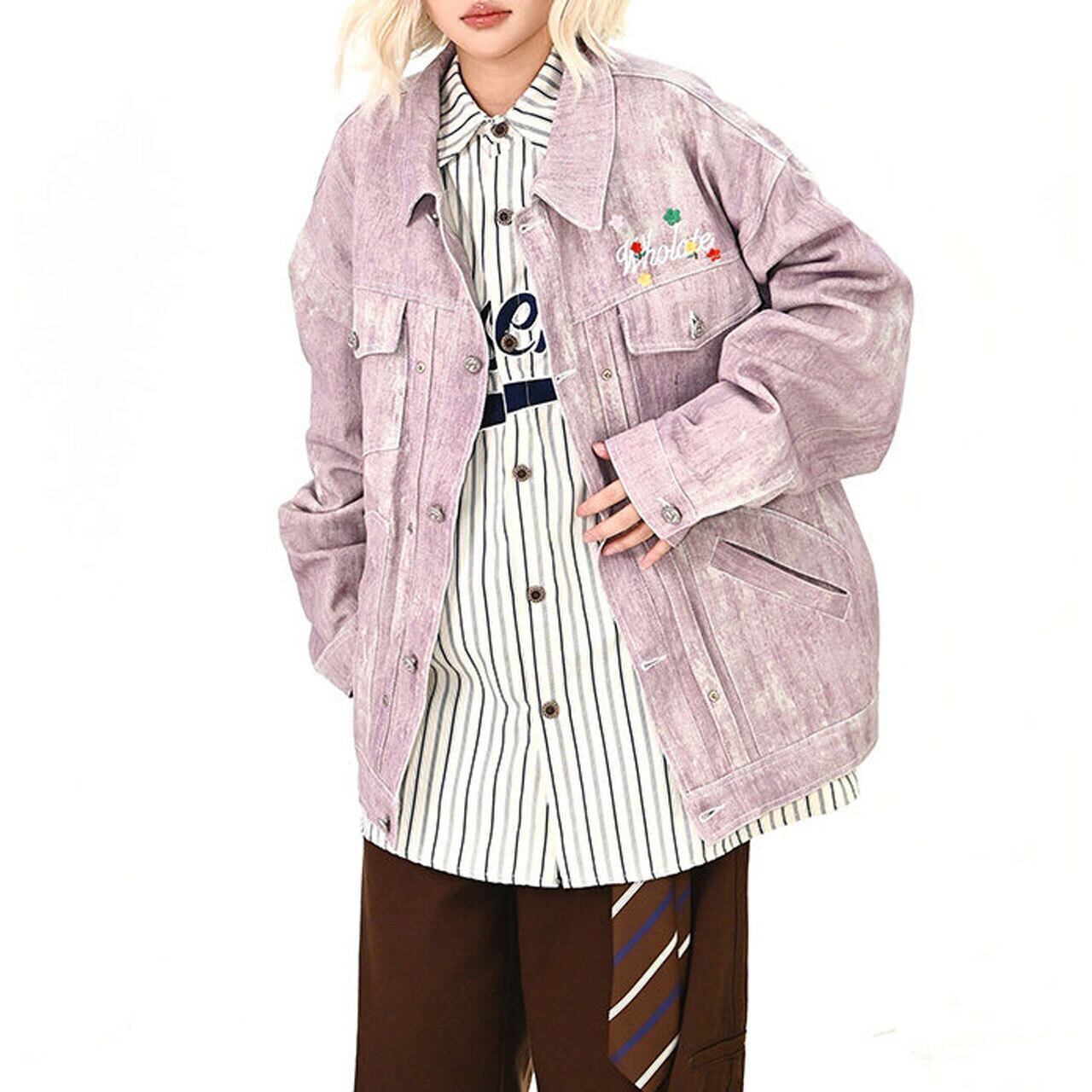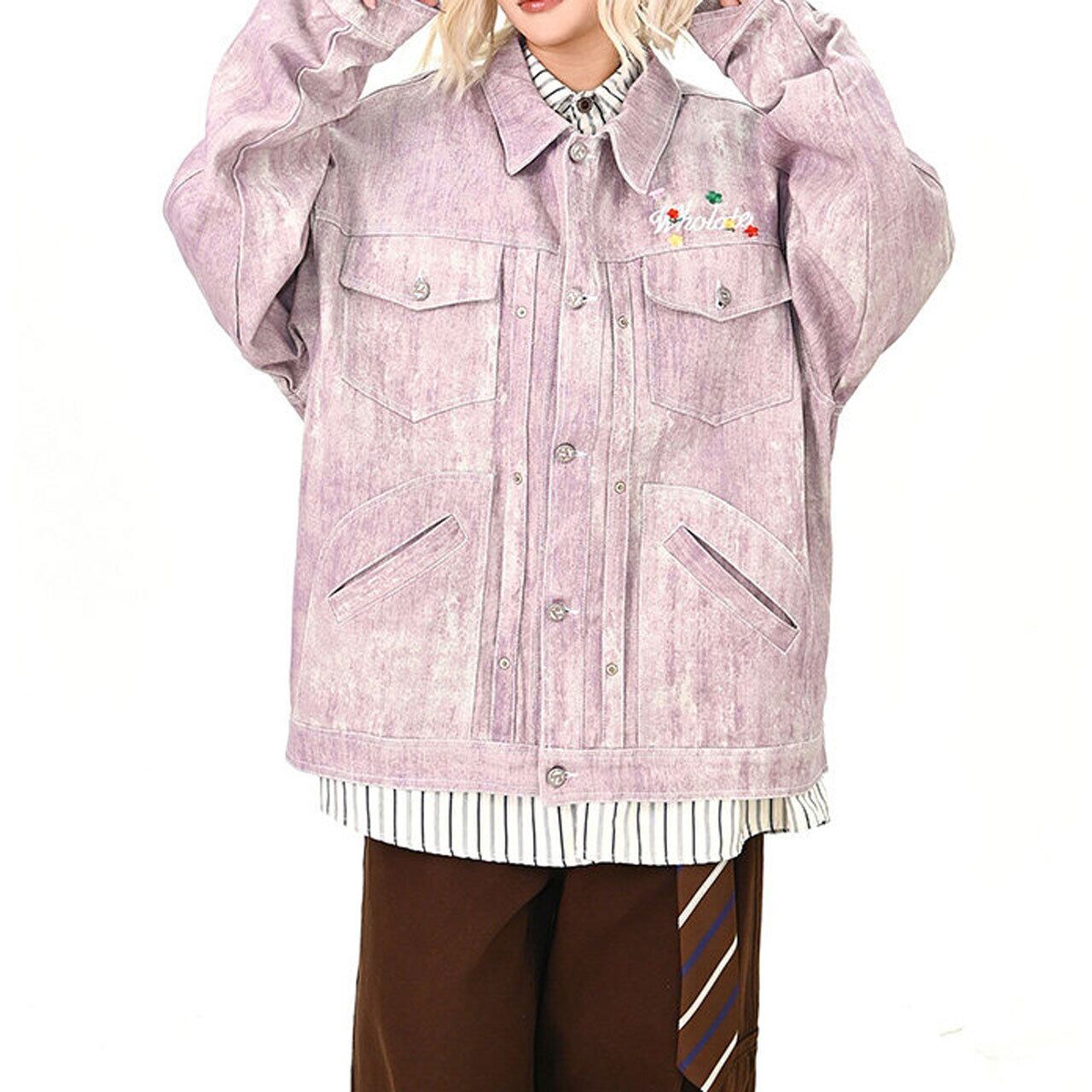 淡いトーンのデニム調に、バックロゴ刺繍が映えるデザインジャケット。