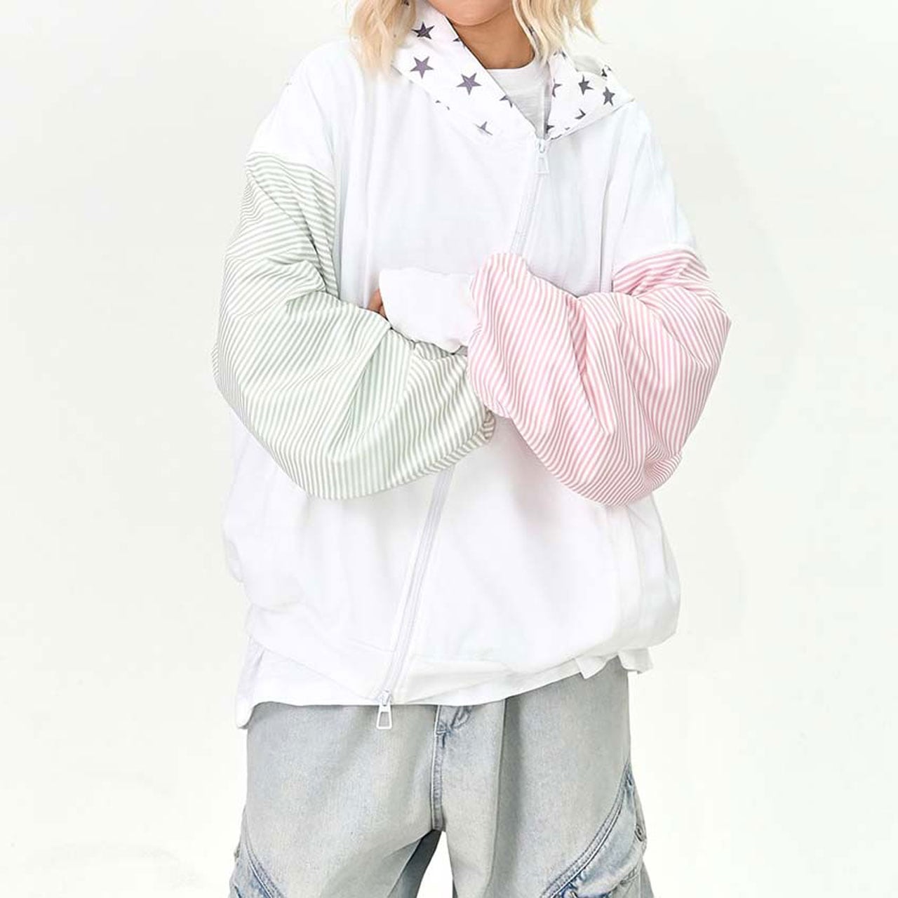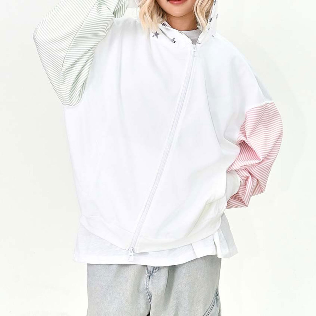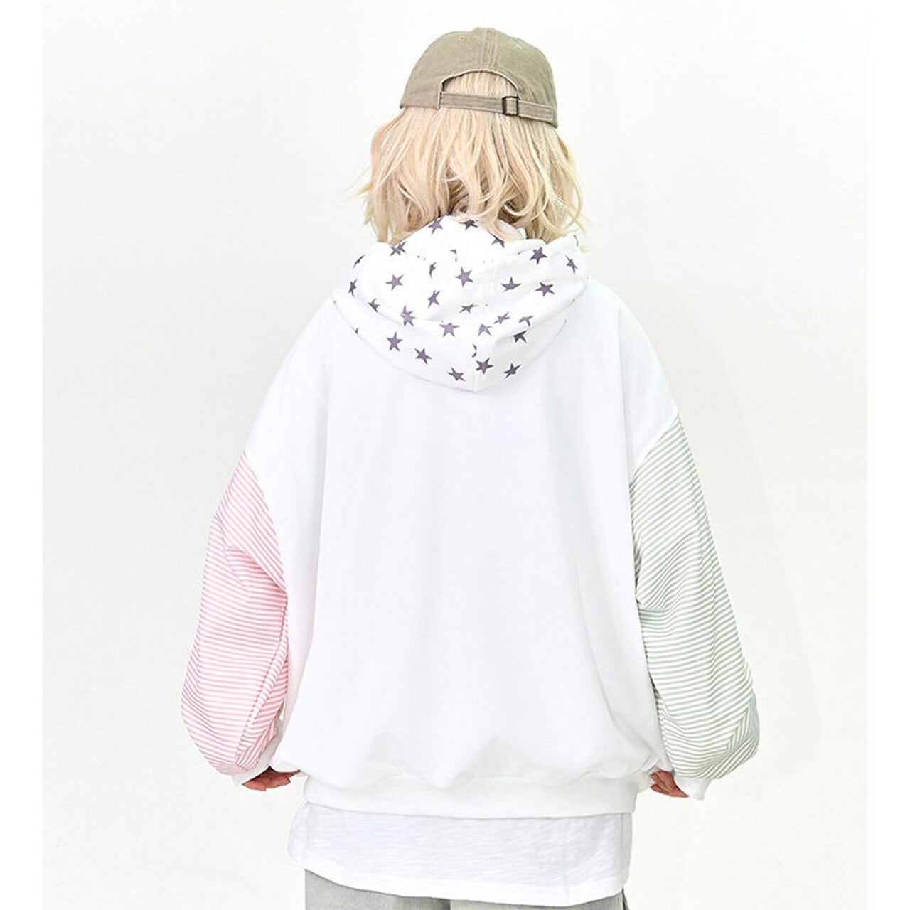 星柄フードと袖の切り替えが目を引く、ポップなデザインジップフーディ。